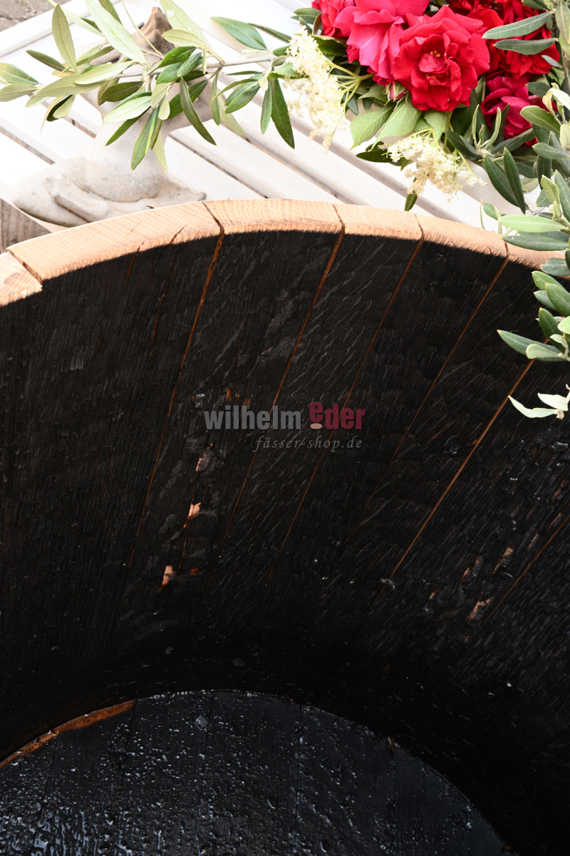 Bac à fleurs fabriqué à partir d'un demi fût de Whisky190 l. Les fûts présentent des traces d'utilisation et des taches de bourbon.