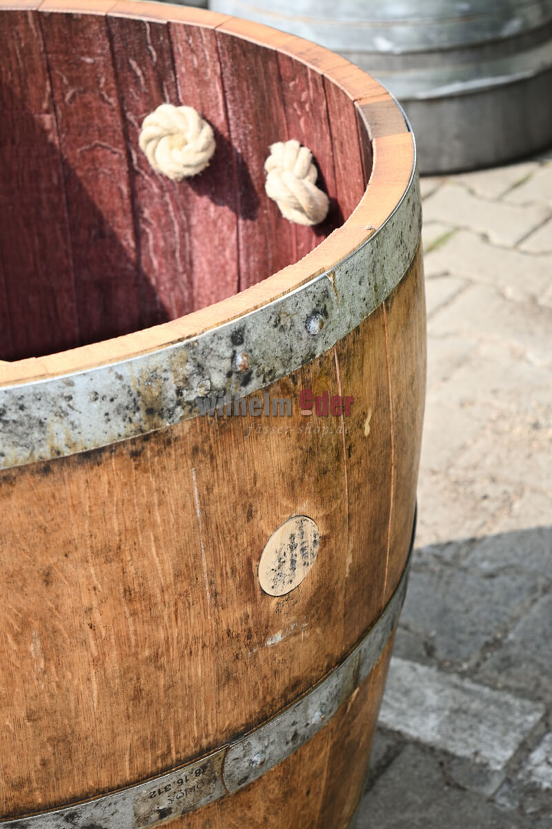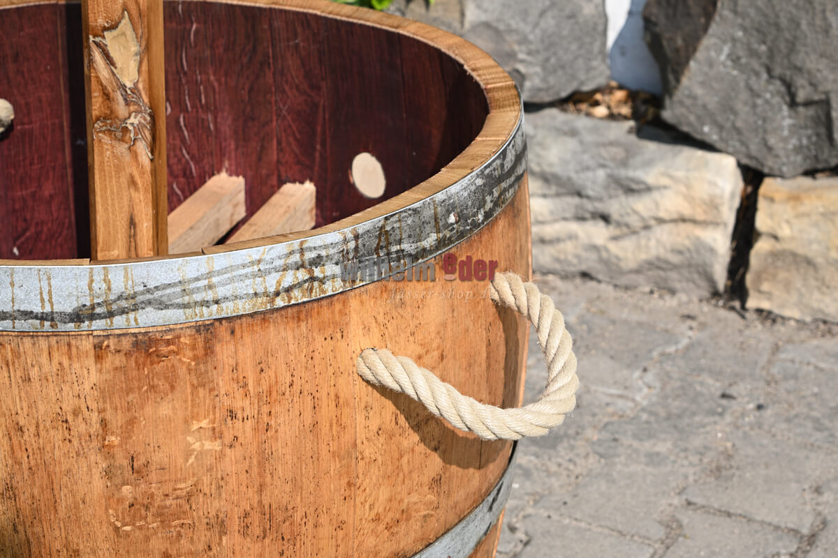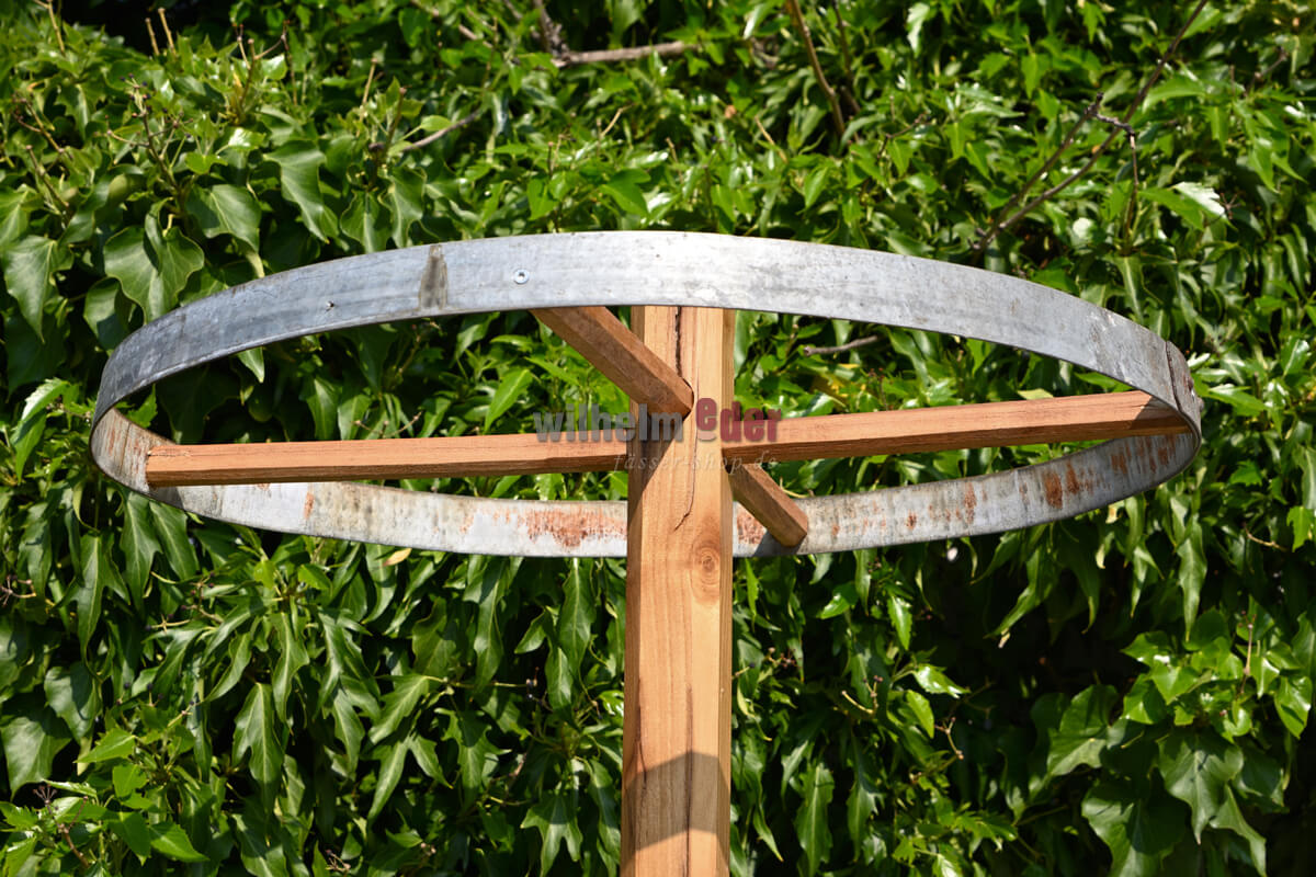 Avec notre jardinière fabriquée à partir d'un fût de vin usagé de 225 l et d'un cercle de fût, qui est monté au-dessus à l'aide d'un piquet en bois et d'un entretoisement en croix!