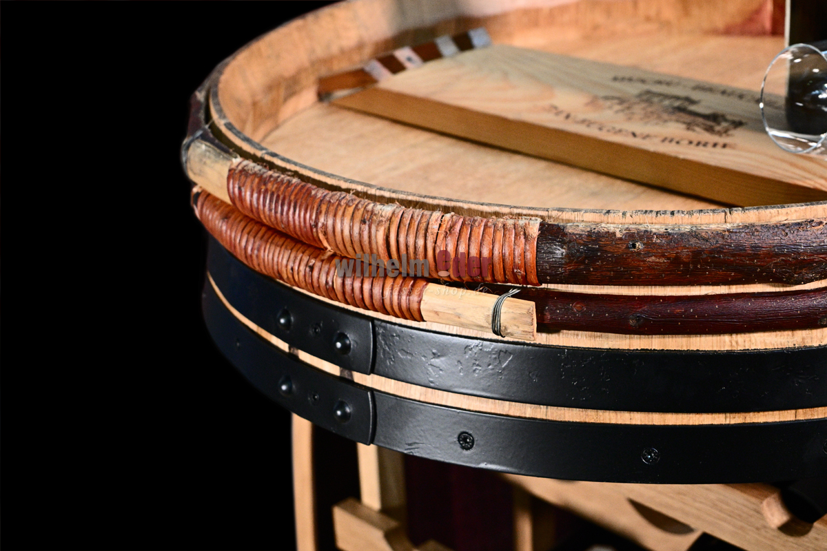 L'incrustation est un casier à vin pour vos précieuses bouteilles en bois de chêne de barrique massif. Les cercles métalliques sont peints en noir.