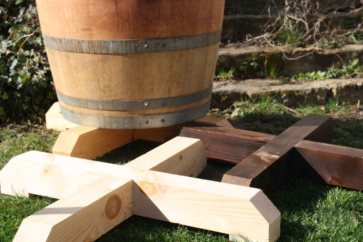Tonneau de pluie fabriqué à partir d'une barrique usagée en bois de