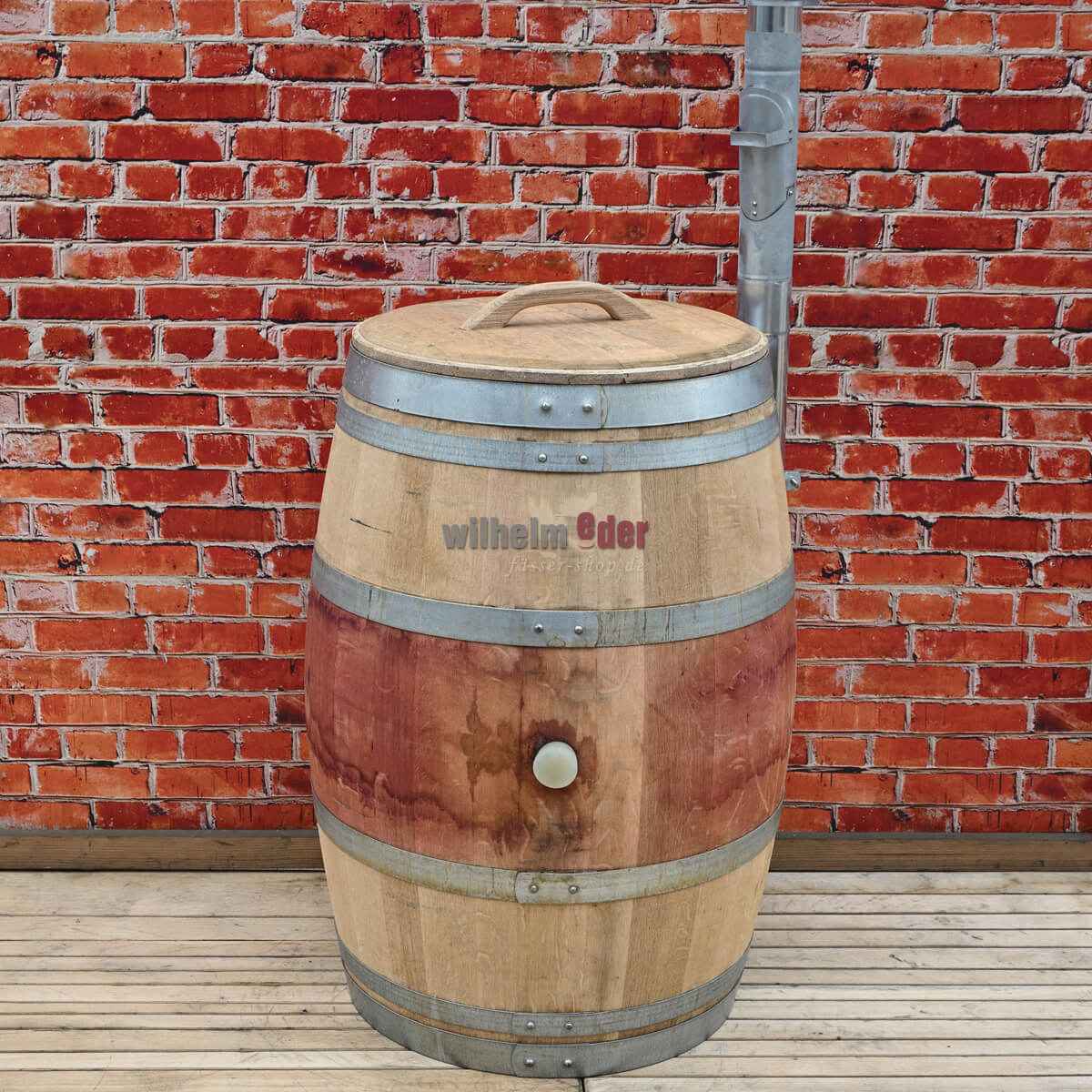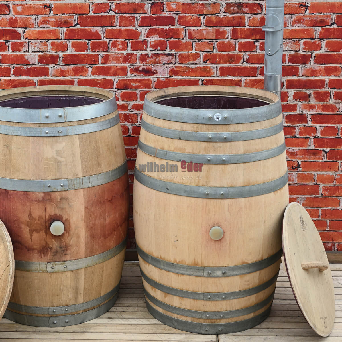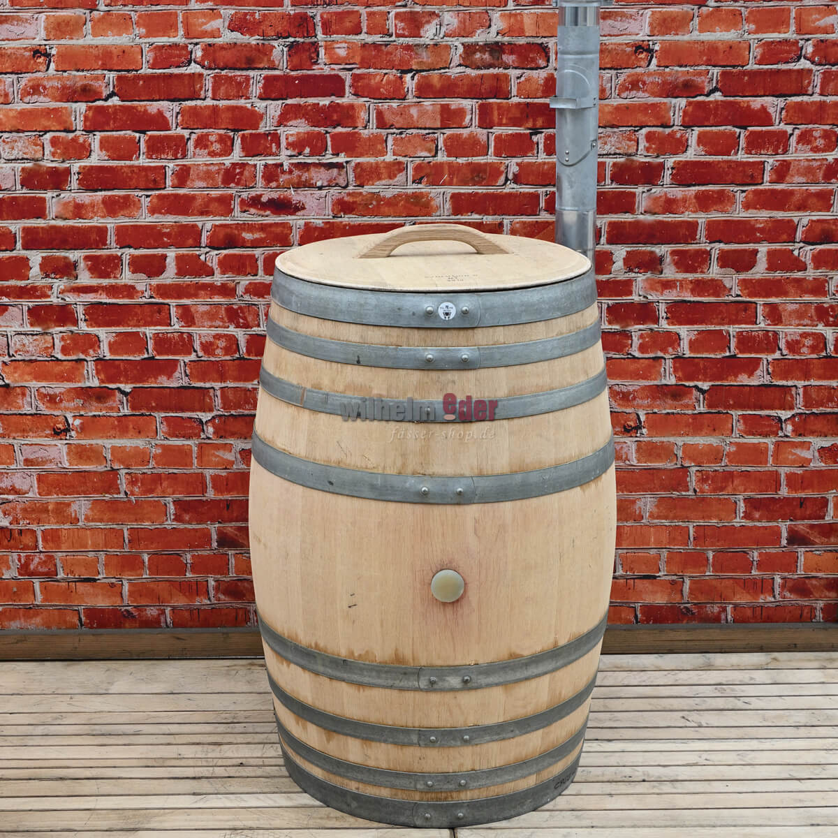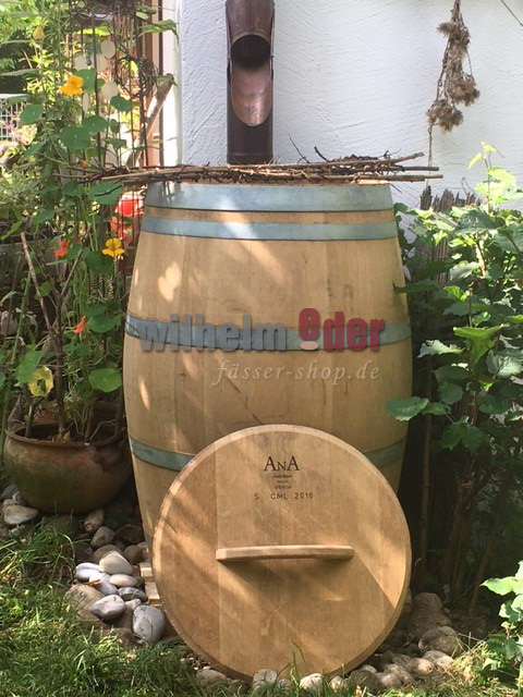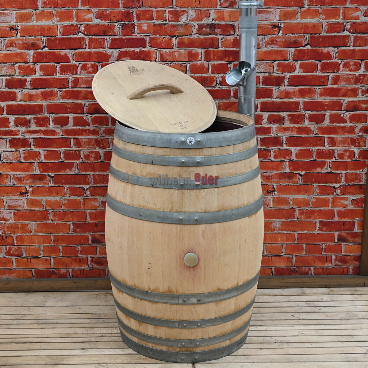 Tonneau d'eau de pluie fabriqué à partir d'une barrique usagée en bois de chêne clair avec des cercles noirs ou galvanisés. Le couvercle est détaché et muni d'une poignée en bois. Le tonneau n'a que quelques années et n'est donc que peu foncé et en très bon état.