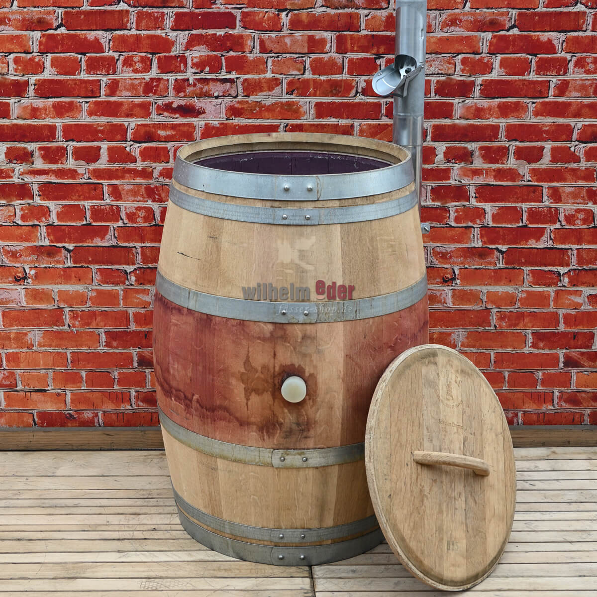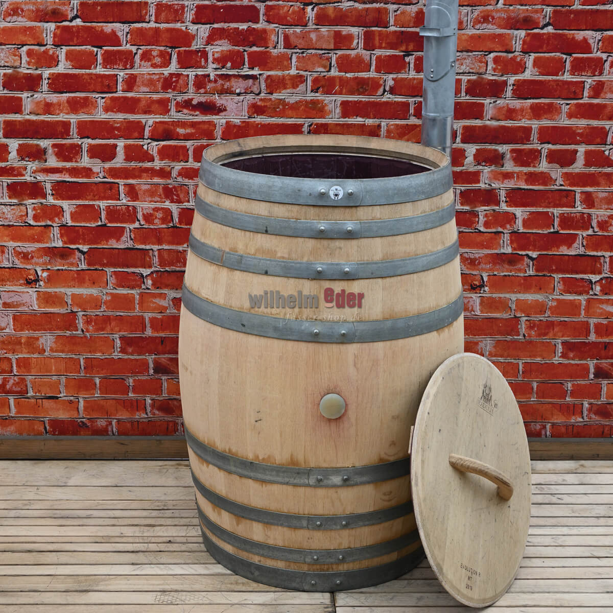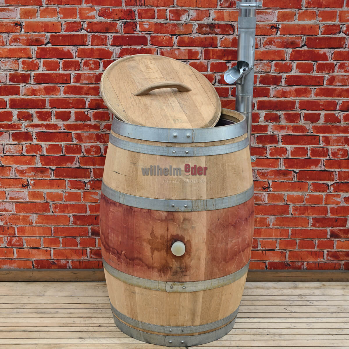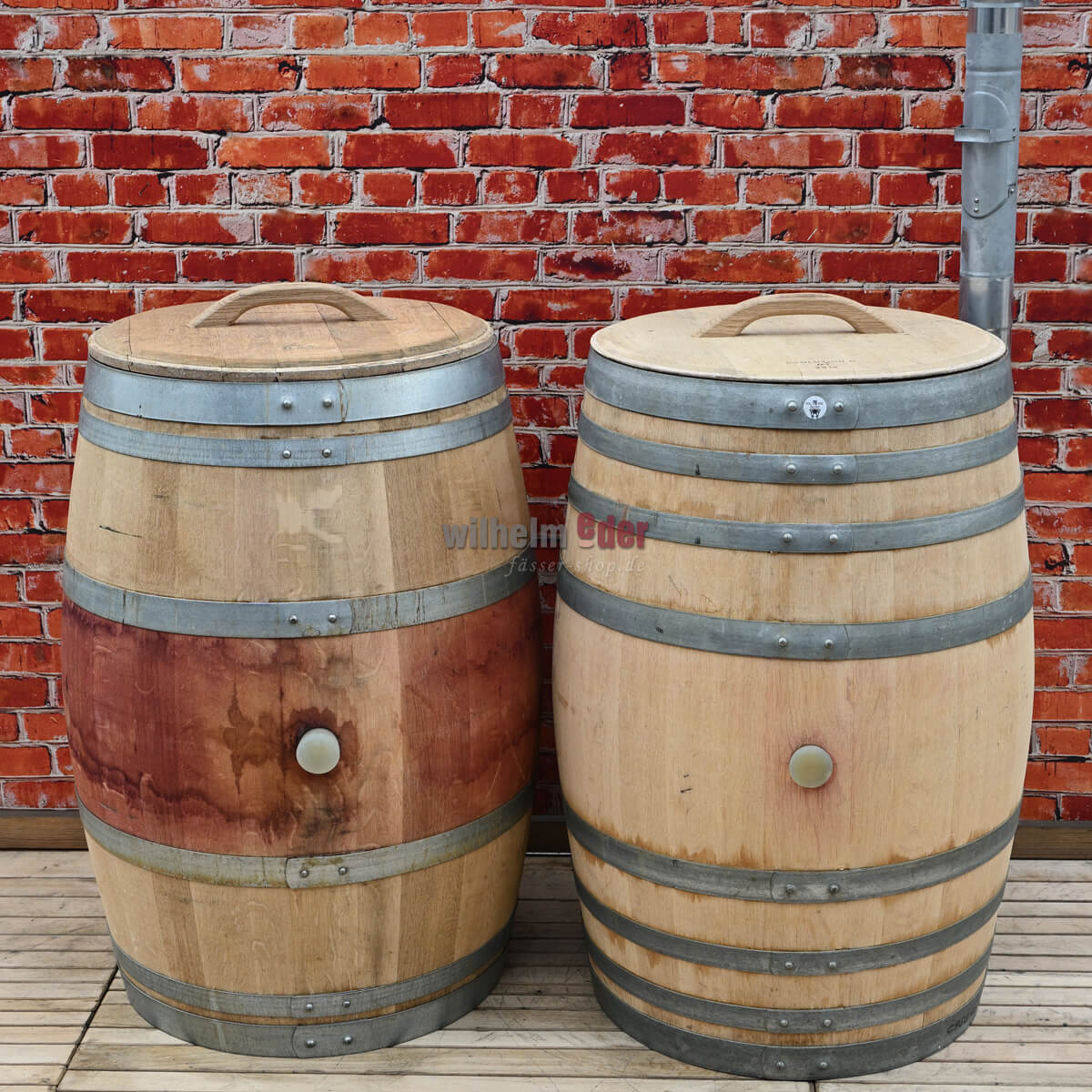 Tonneau d'eau de pluie fabriqué à partir d'une barrique usagée en bois de chêne clair avec des cercles noirs ou galvanisés. Le couvercle est détaché et muni d'une poignée en bois. Le tonneau n'a que quelques années et n'est donc que peu foncé et en très bon état.