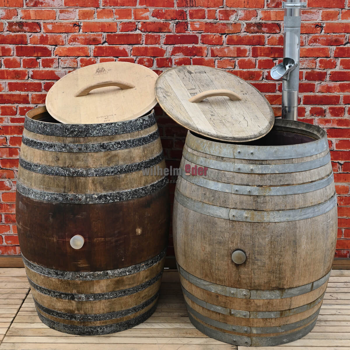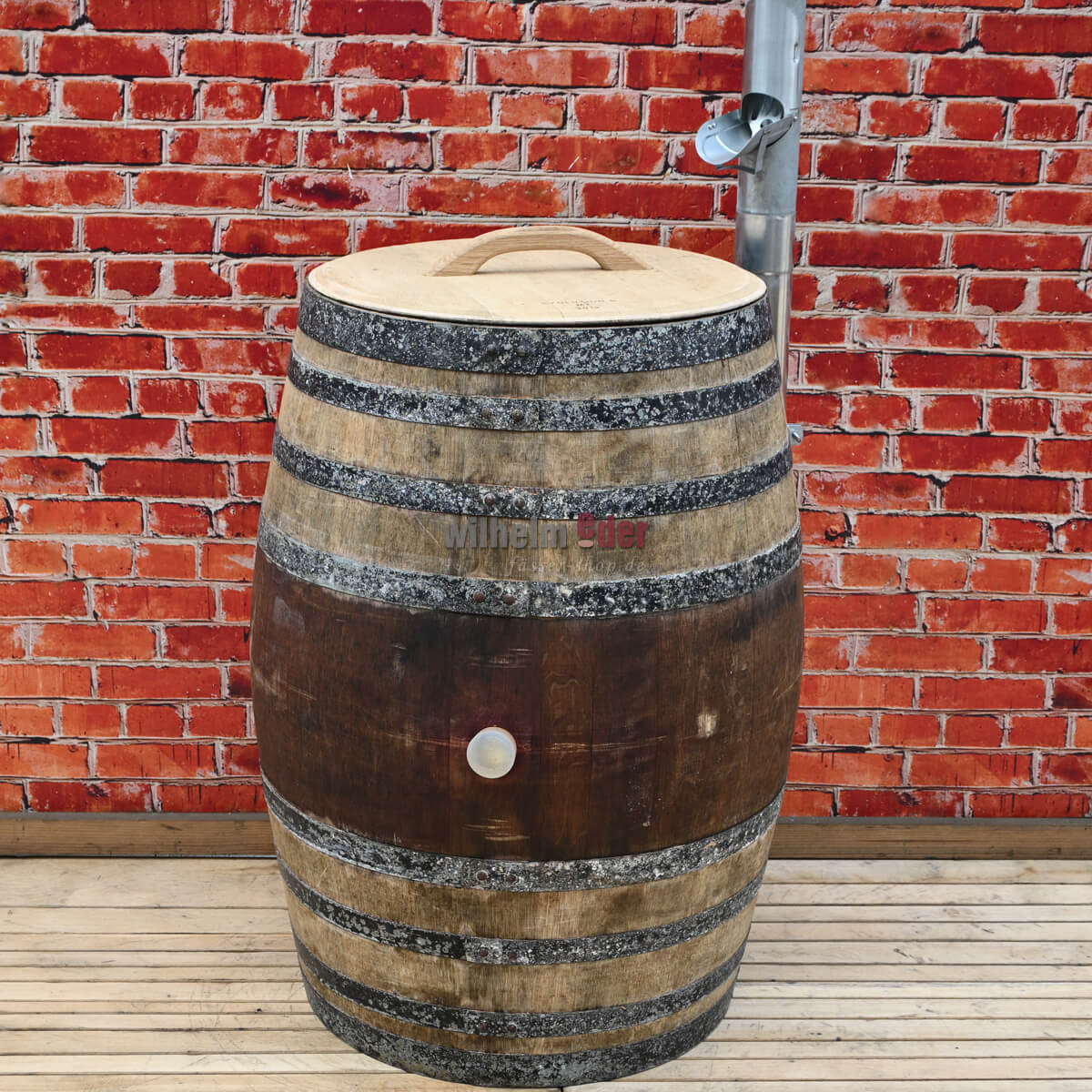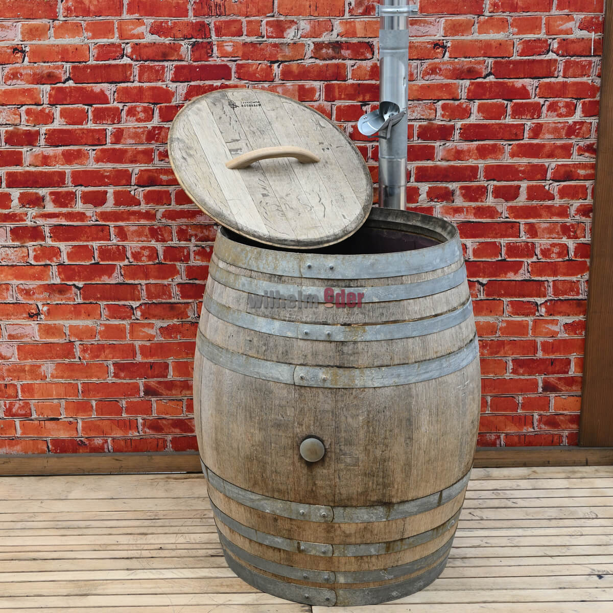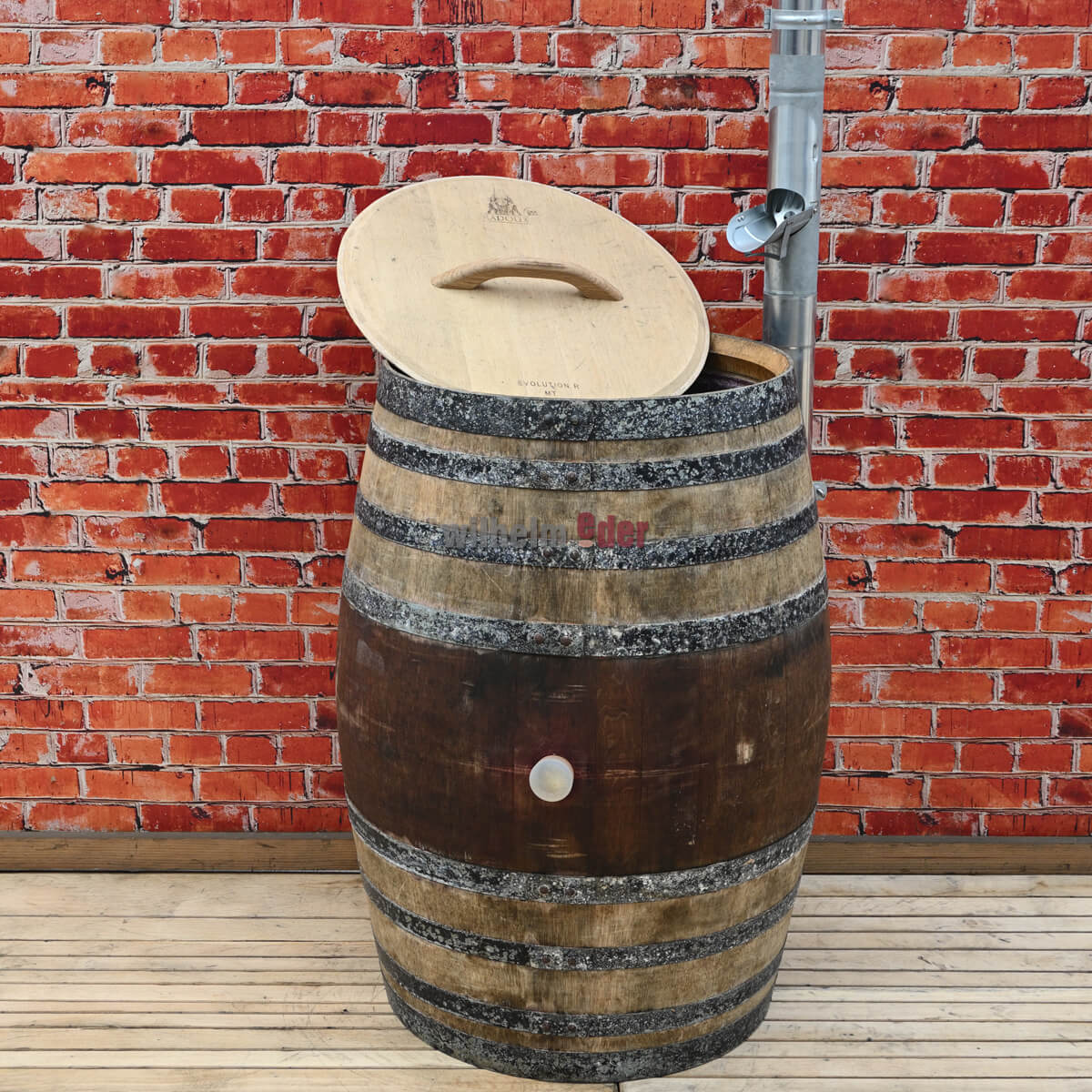 Tonneau de pluie fabriqué à partir d'une barrique usagée de 225 l /228 l en chêne. Le couvercle est détaché et muni d'une poignée en bois. Différents modèles sont disponibles. Le fût peut présenter des colorations dues au vin rouge qui y a vieilli.