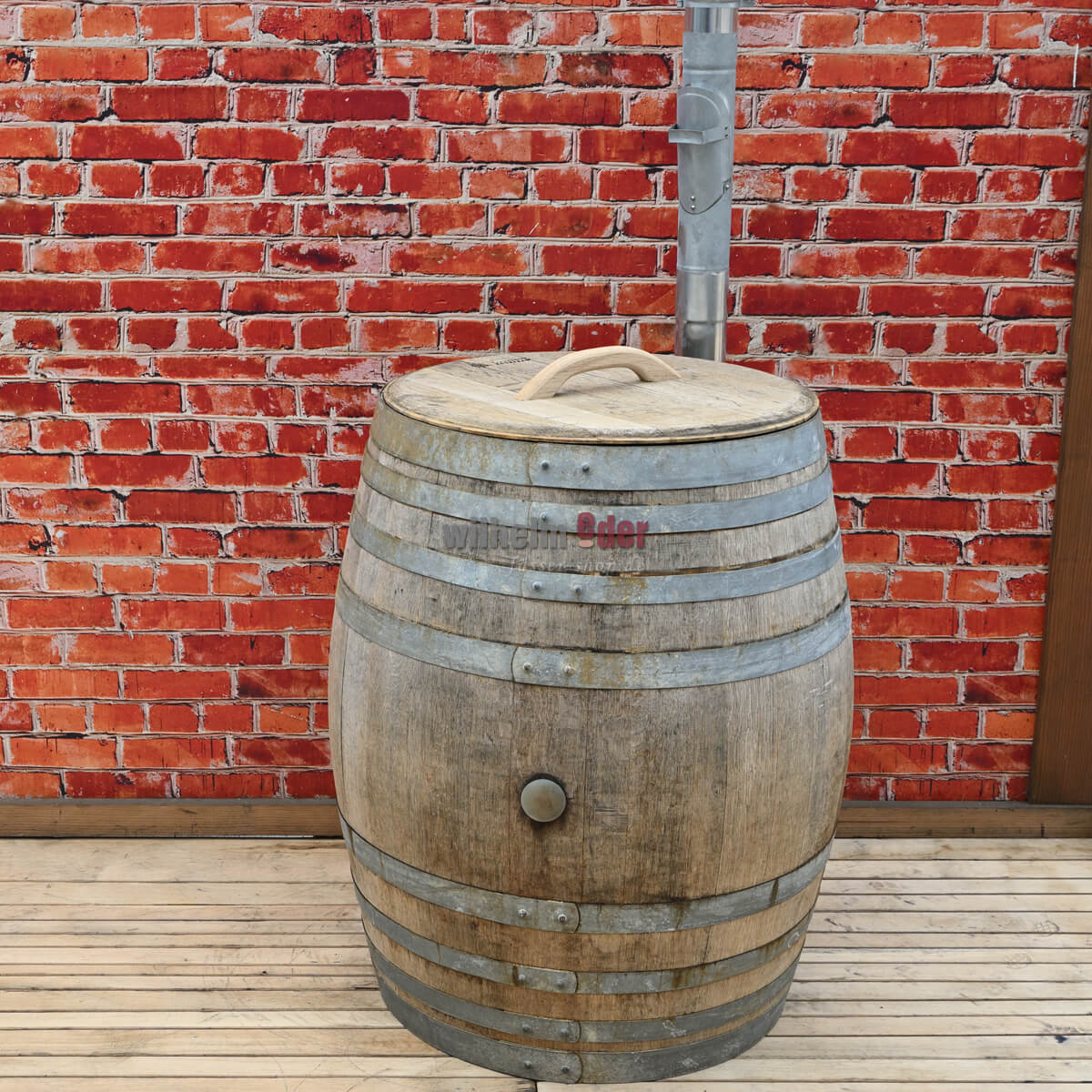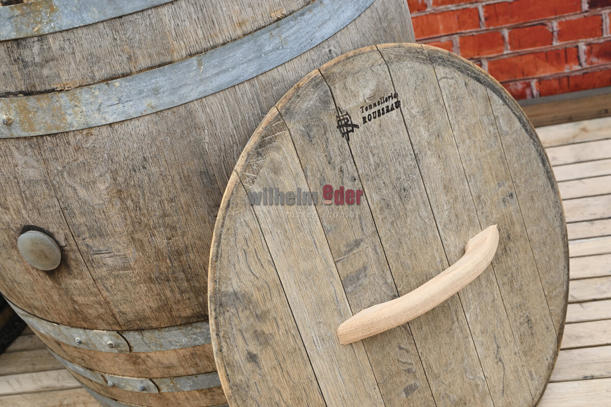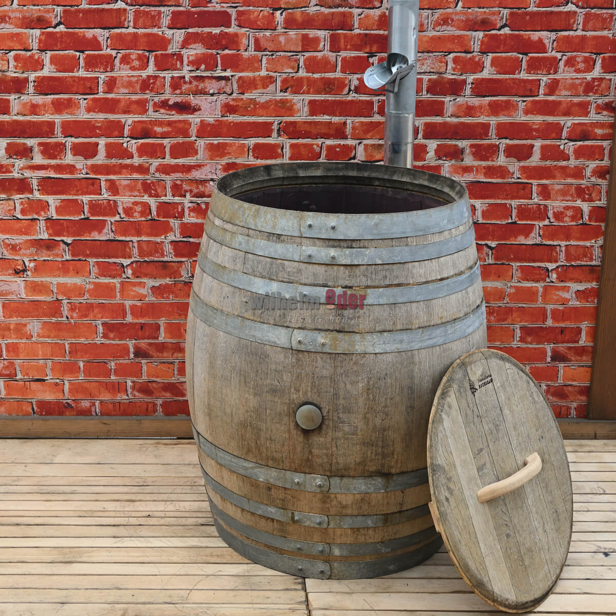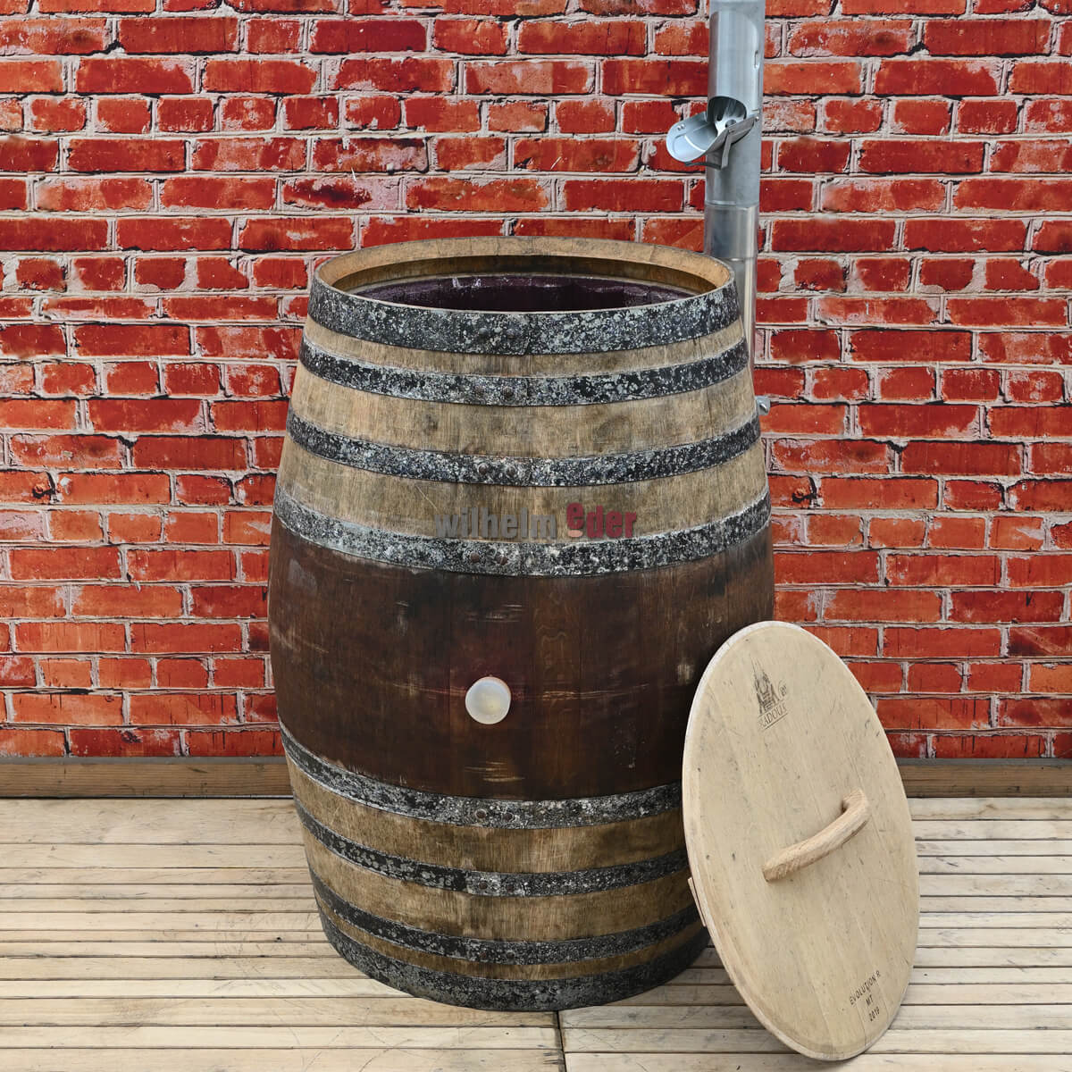 Tonneau de pluie fabriqué à partir d'une barrique usagée de 225 l /228 l en chêne. Le couvercle est détaché et muni d'une poignée en bois. Différents modèles sont disponibles. Le fût peut présenter des colorations dues au vin rouge qui y a vieilli.