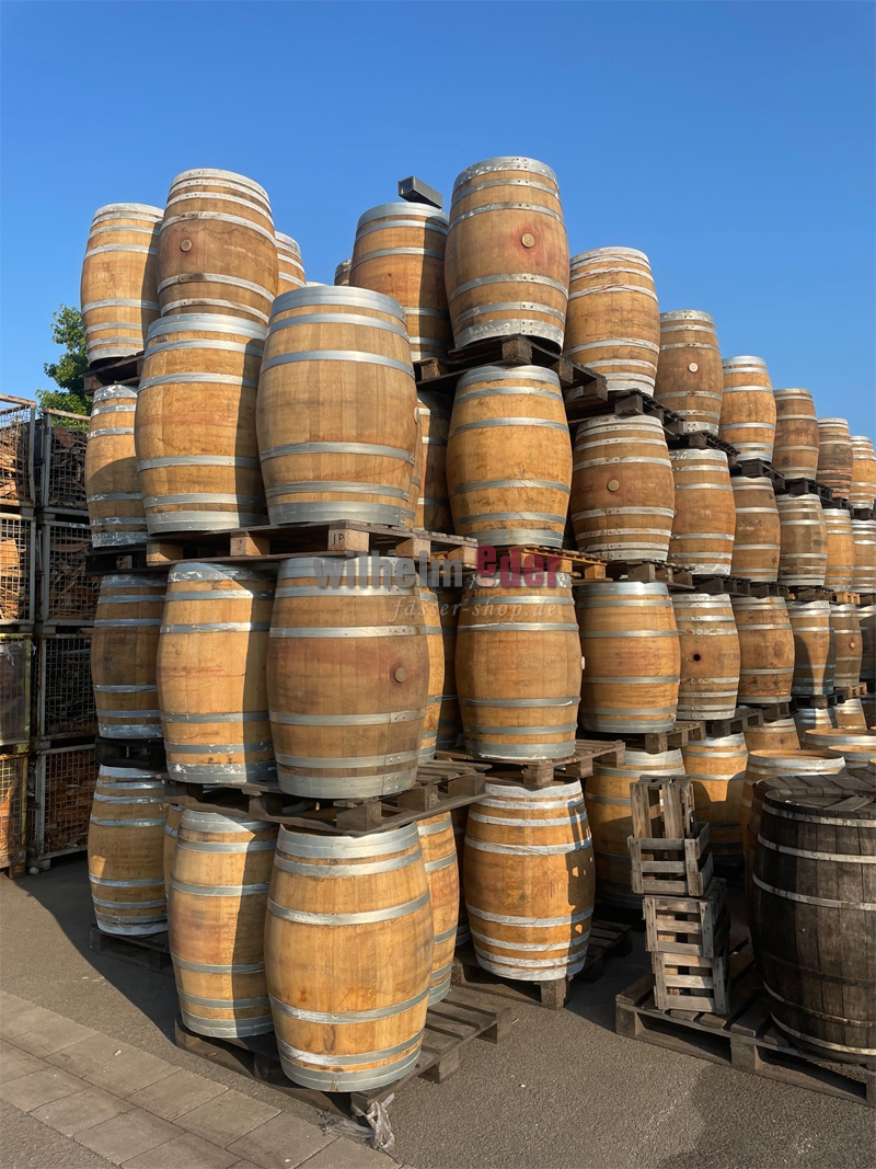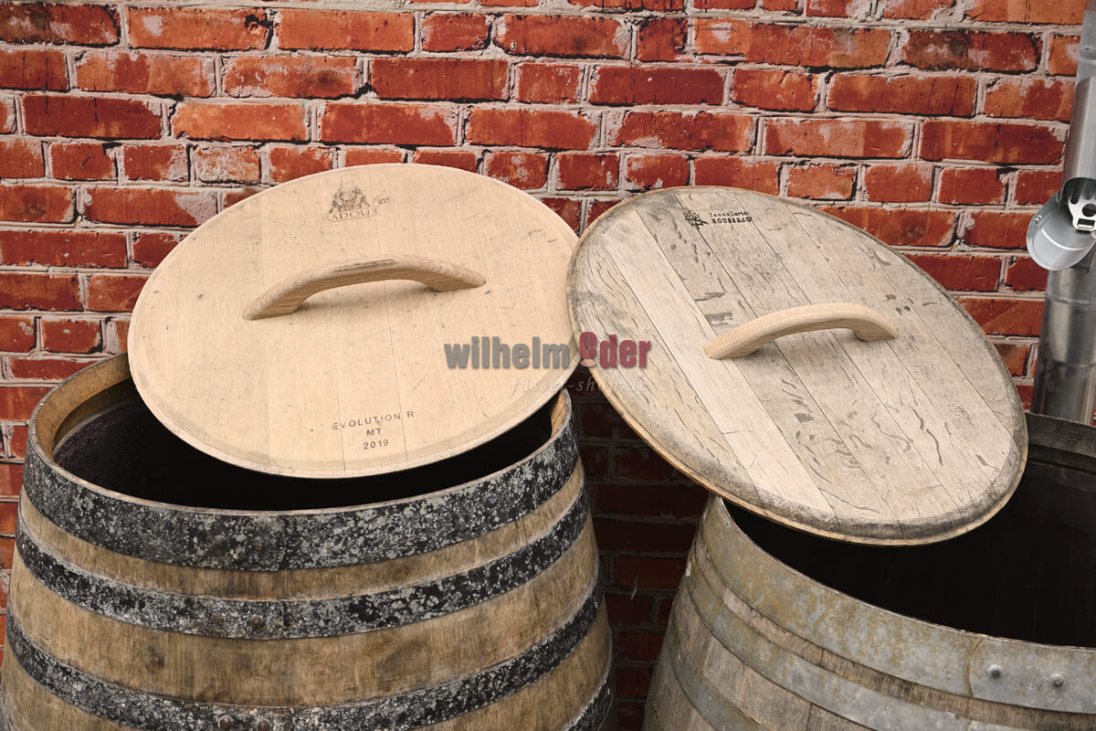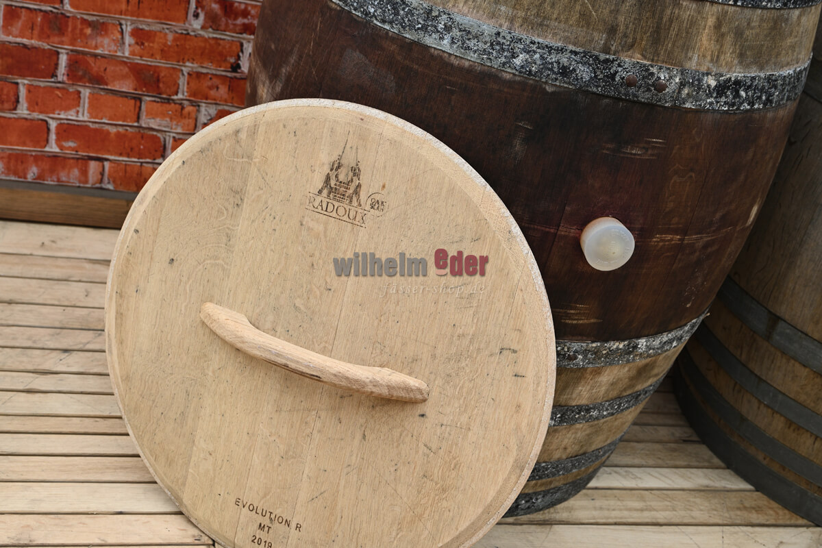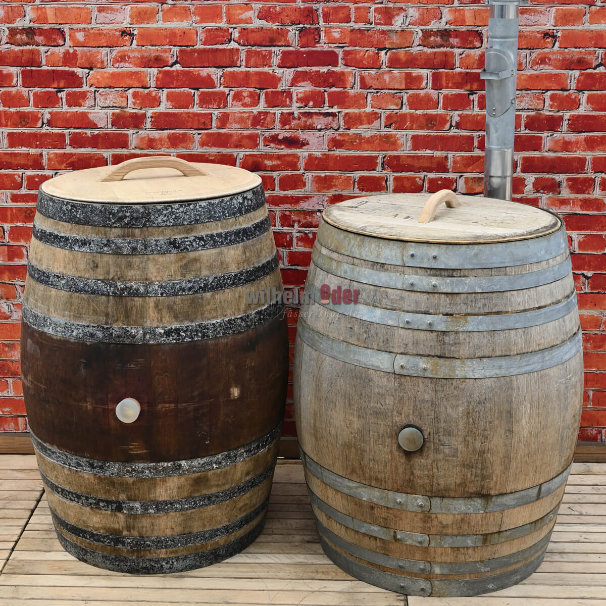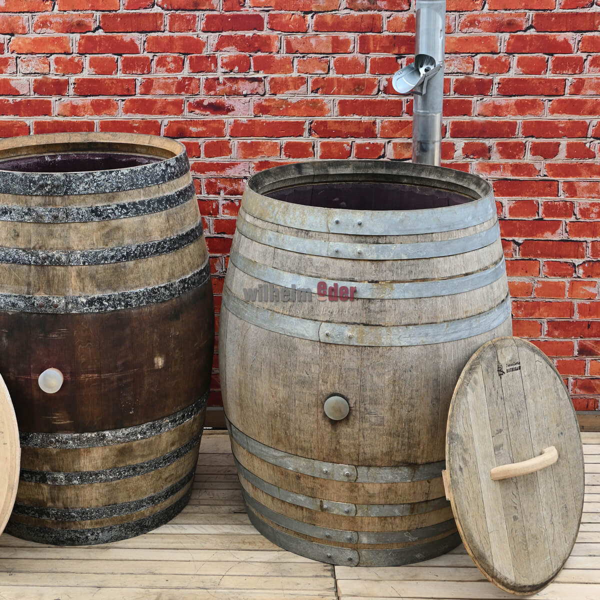 Tonneau de pluie fabriqué à partir d'une barrique usagée de 225 l /228 l en chêne. Le couvercle est détaché et muni d'une poignée en bois. Différents modèles sont disponibles. Le fût peut présenter des colorations dues au vin rouge qui y a vieilli.