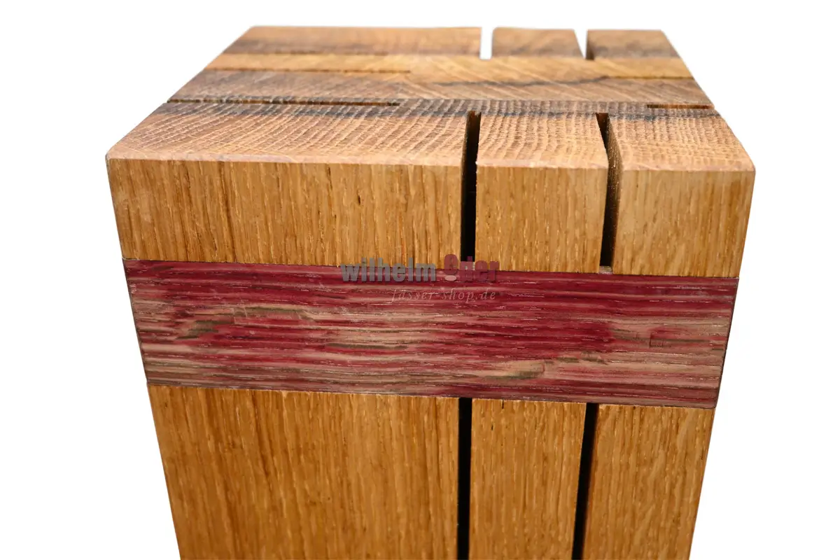 Nos blocs à couteaux uniques sont fabriqués avec dévouement à partir de vieilles douelles de chêne originales provenant de grands fûts. Après un nettoyage professionnel et un séchage minutieux sous vide, les douelles sont collées de manière à être compatibles avec les aliments et décorées latéralement d'une incrustation en bois de chêne teinté au vin rouge. La finition est réalisée avec de l'huile de lin agréée pour les denrées alimentaires.