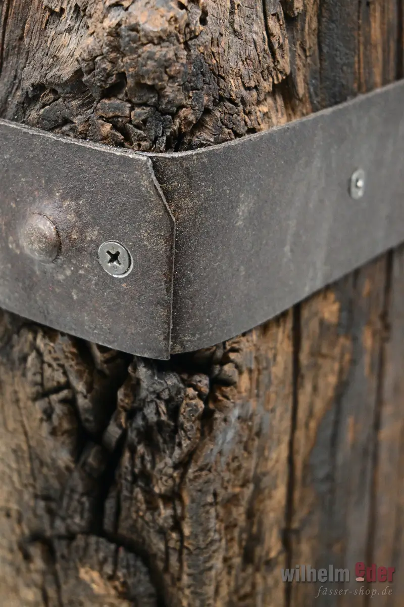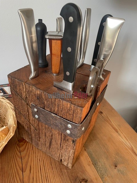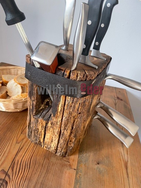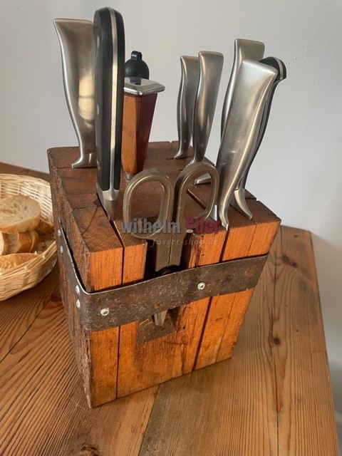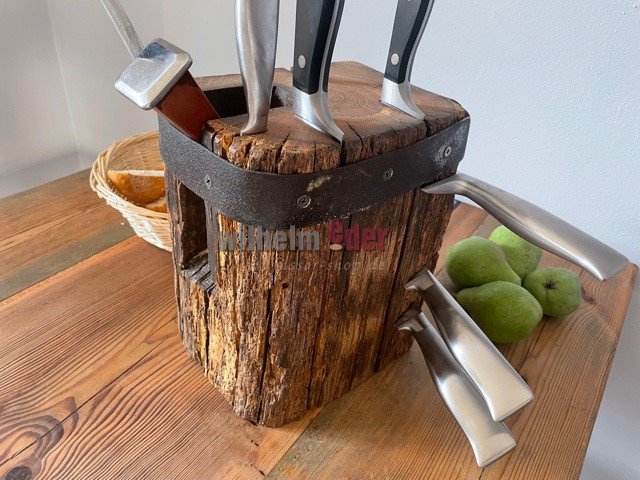 Nos blocs à couteaux sont fabriqués de poutres d’une maison à colombage qui sont entaillées sur le côté et à la verticale. Des couteaux et des ustensiles de cuisine peuvent être rangés dans le bloc. Un cercle de fût rouillé est vissé sur le côté est sert de dispositif anti-basculement des couteaux. Le bloc à couteaux est traité avec de l'huile de lin compatible avec des produits alimentaires.