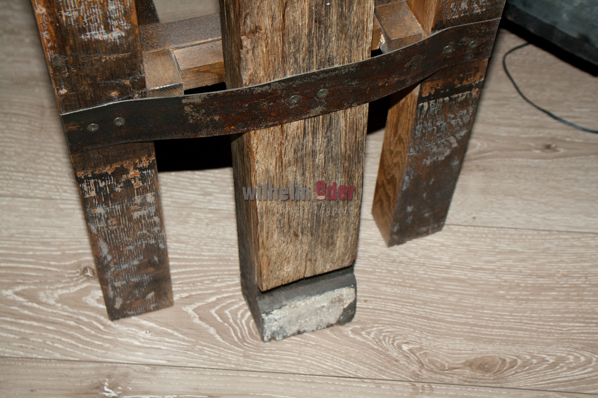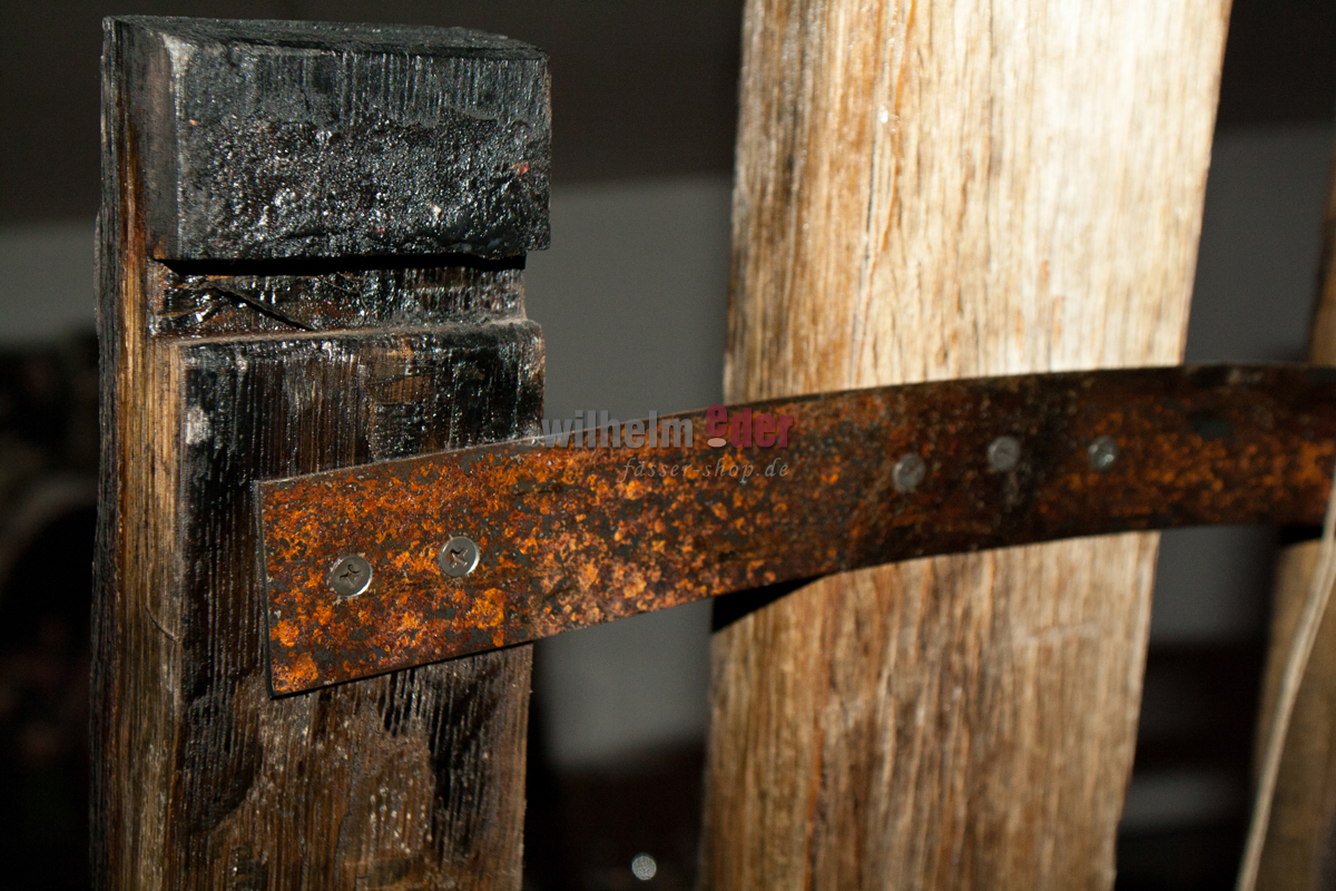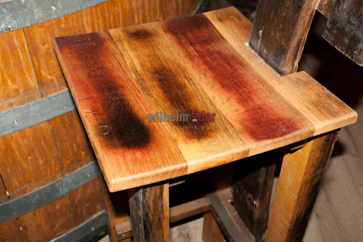 Les grandes douelles ont été légèrement poncées et recouvertes d'huile, tandis que le siège a été poncé pour un meilleur confort d'assise. Le dossier cède légèrement en position assise, car il n'était fixé qu'avec les arceaux. Une plate-forme croisée sur les pieds assure la stabilité nécessaire. A la fin, la chaise du bar était recouverte de vernis à bateau.
