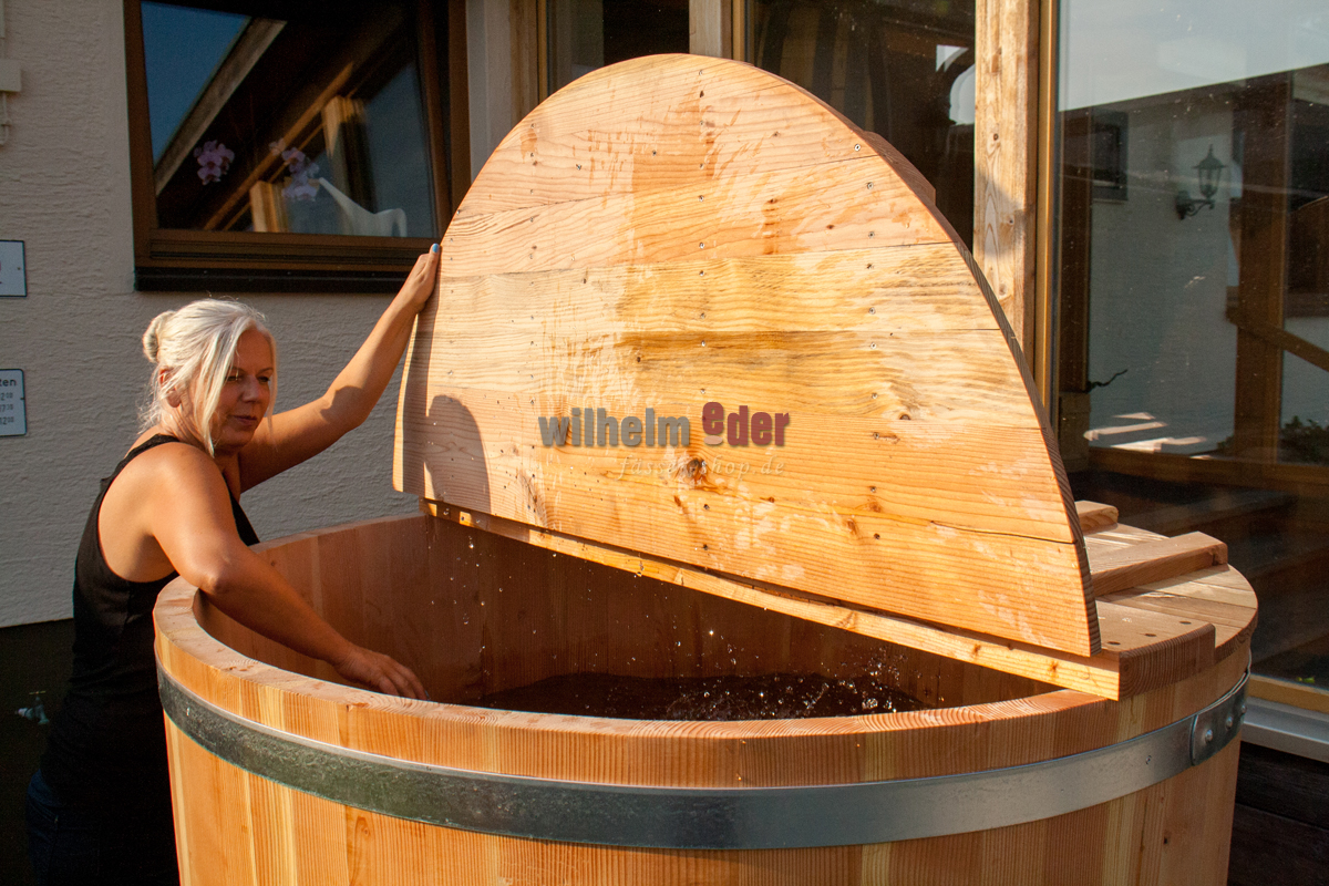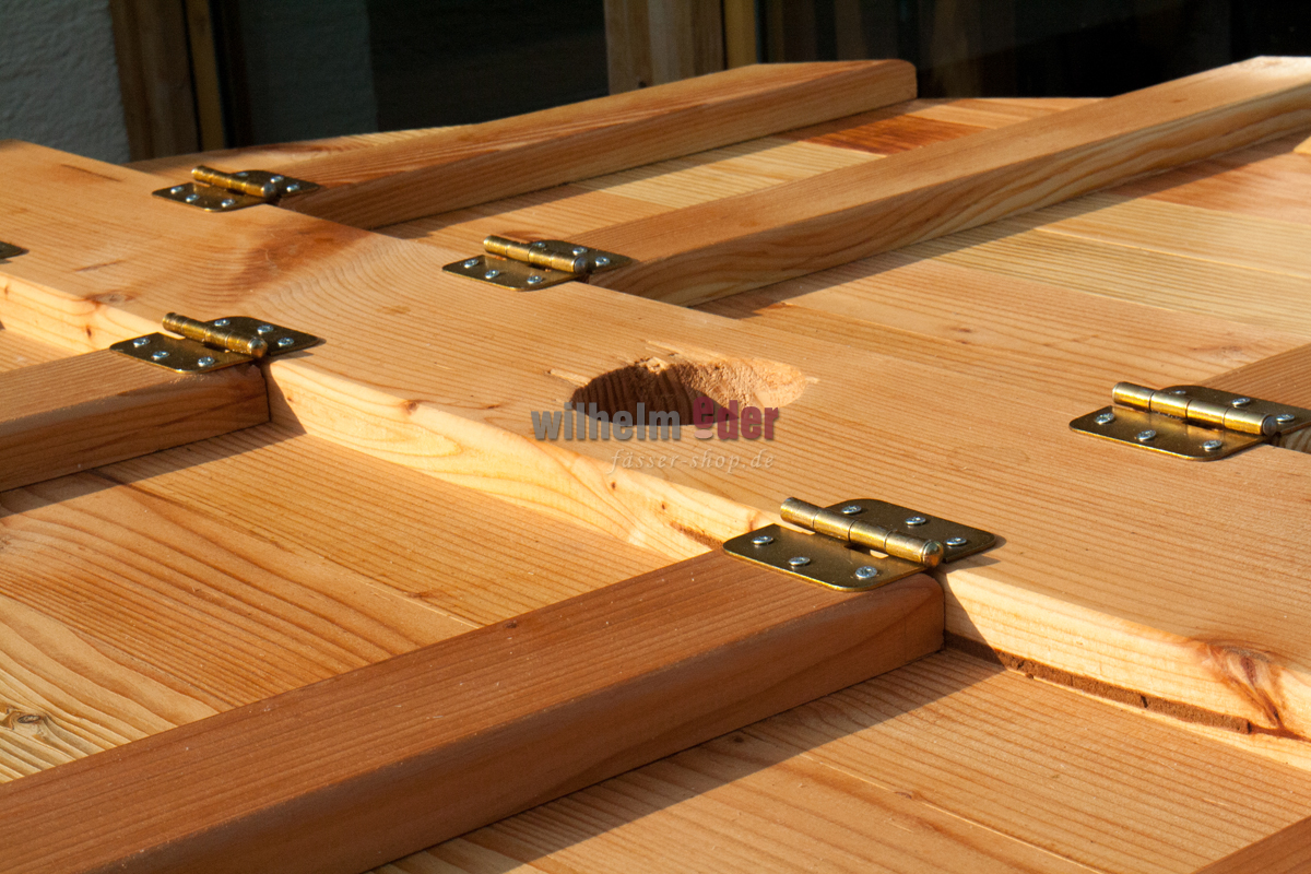 Couverture pour le collecteur d'eau, en bois de sapin de Douglas résistant aux intempéries, d'environ 20 mm d'épaisseur. Le diamètre est adapté à la cuve respective. La couverture est divisée en deux parties.