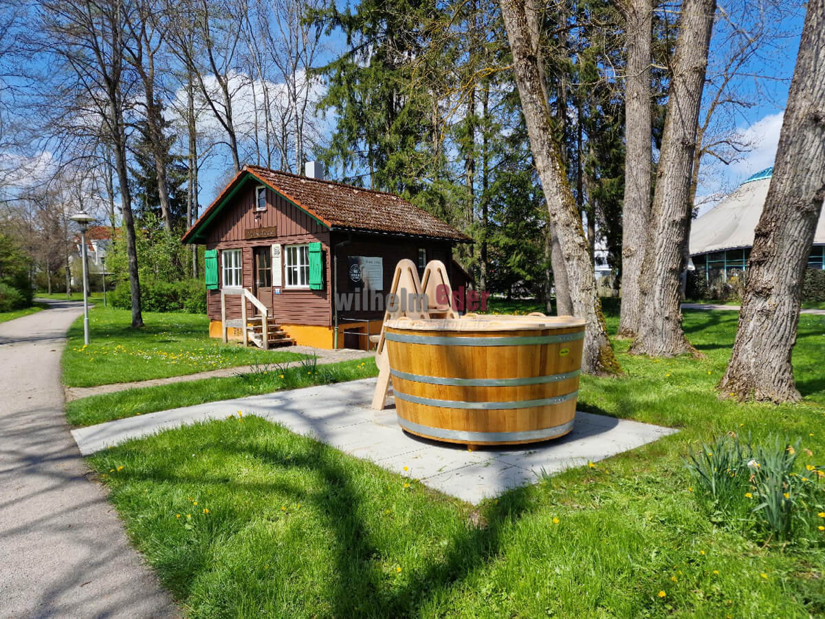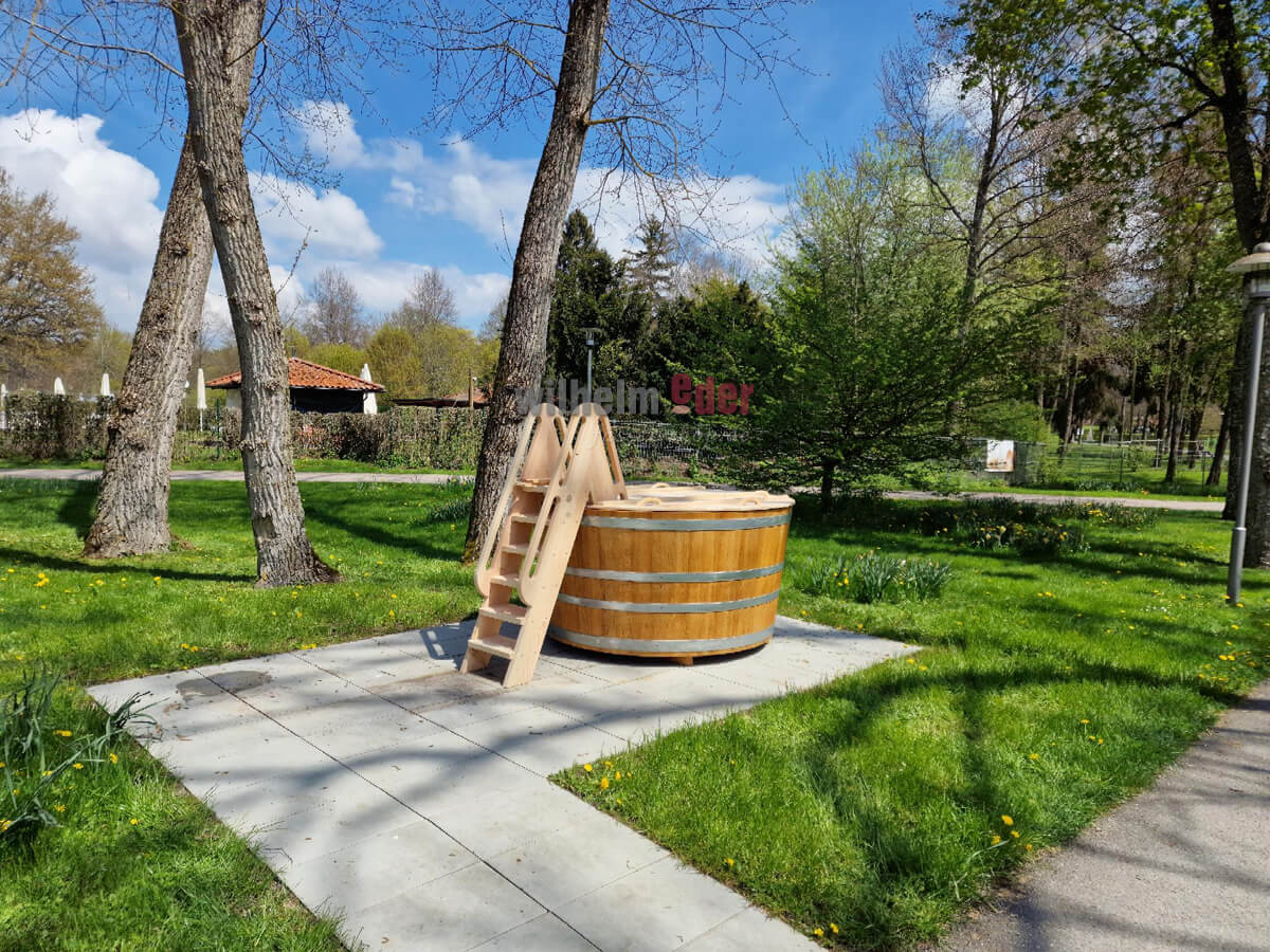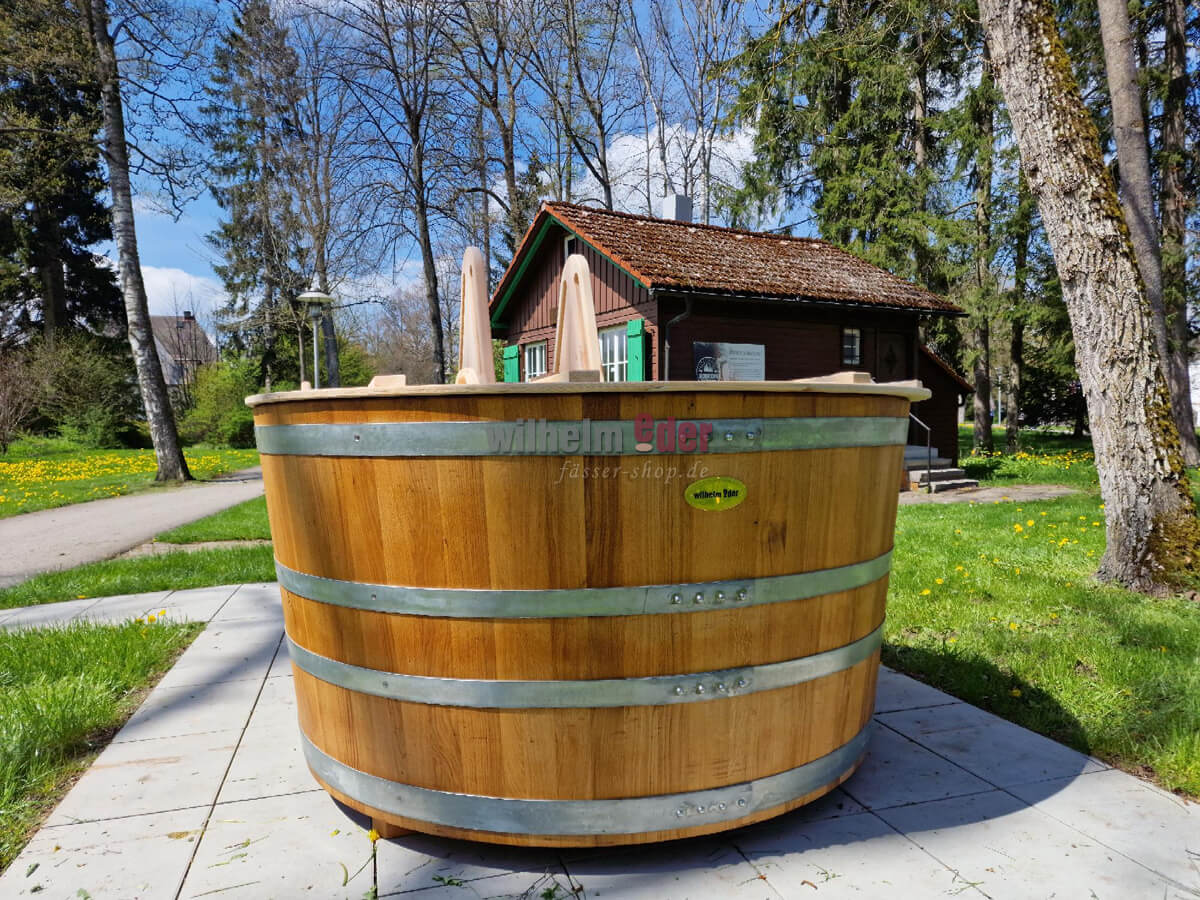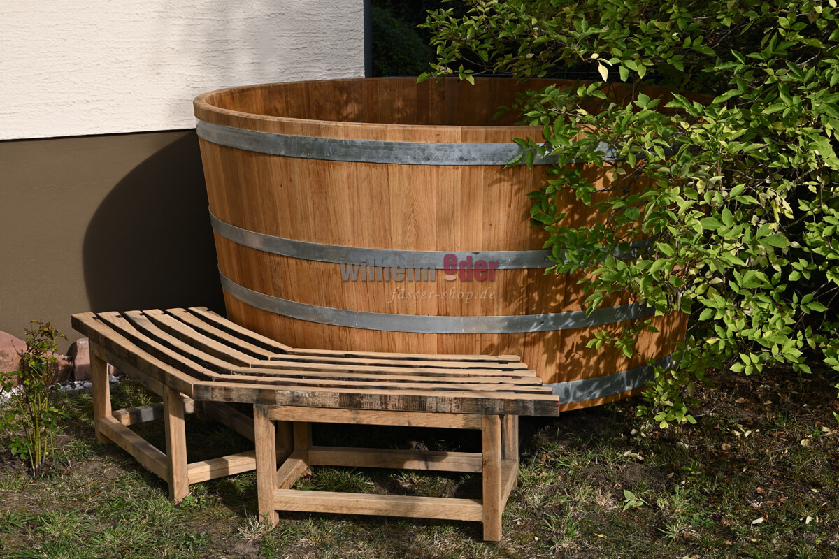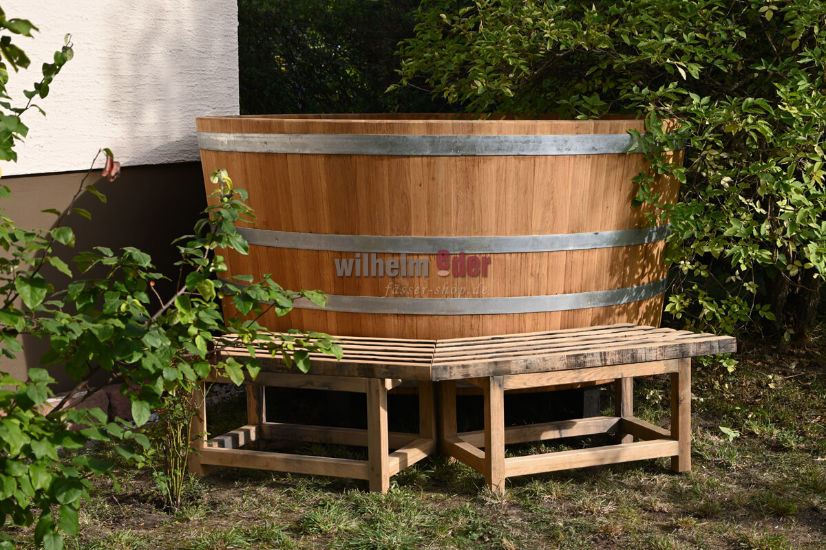 Une fois que les tanins du bois ont été éliminés par des remplissages répétés, le bac peut parfaitement servir de mini-piscine pour votre bain dans votre jardin. Le tonneau s'intègre bien dans le paysage et peut être placé là où vous le souhaitez. Au fil des ans, la couleur du bois s'intensifie et la baignoire gagne en rayonnement.