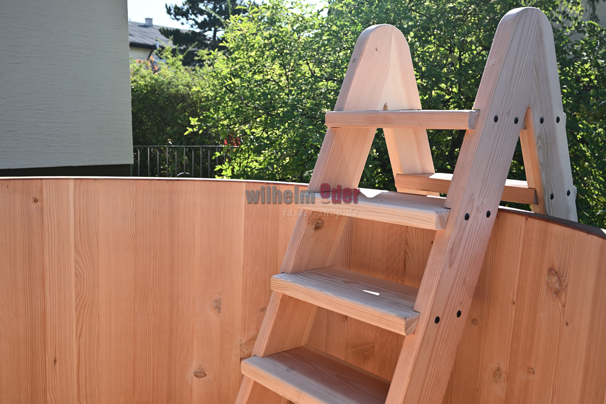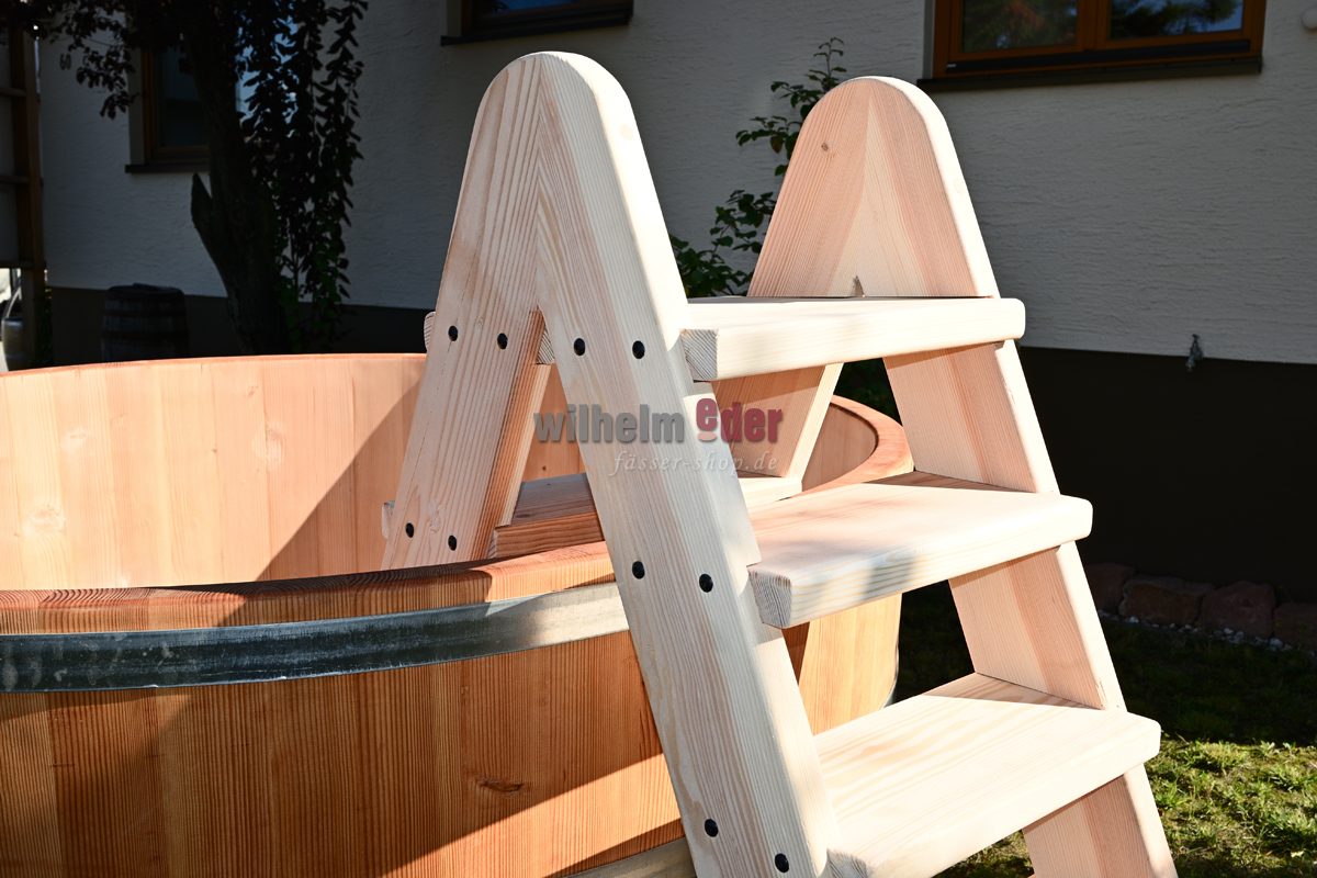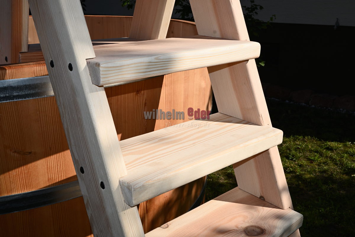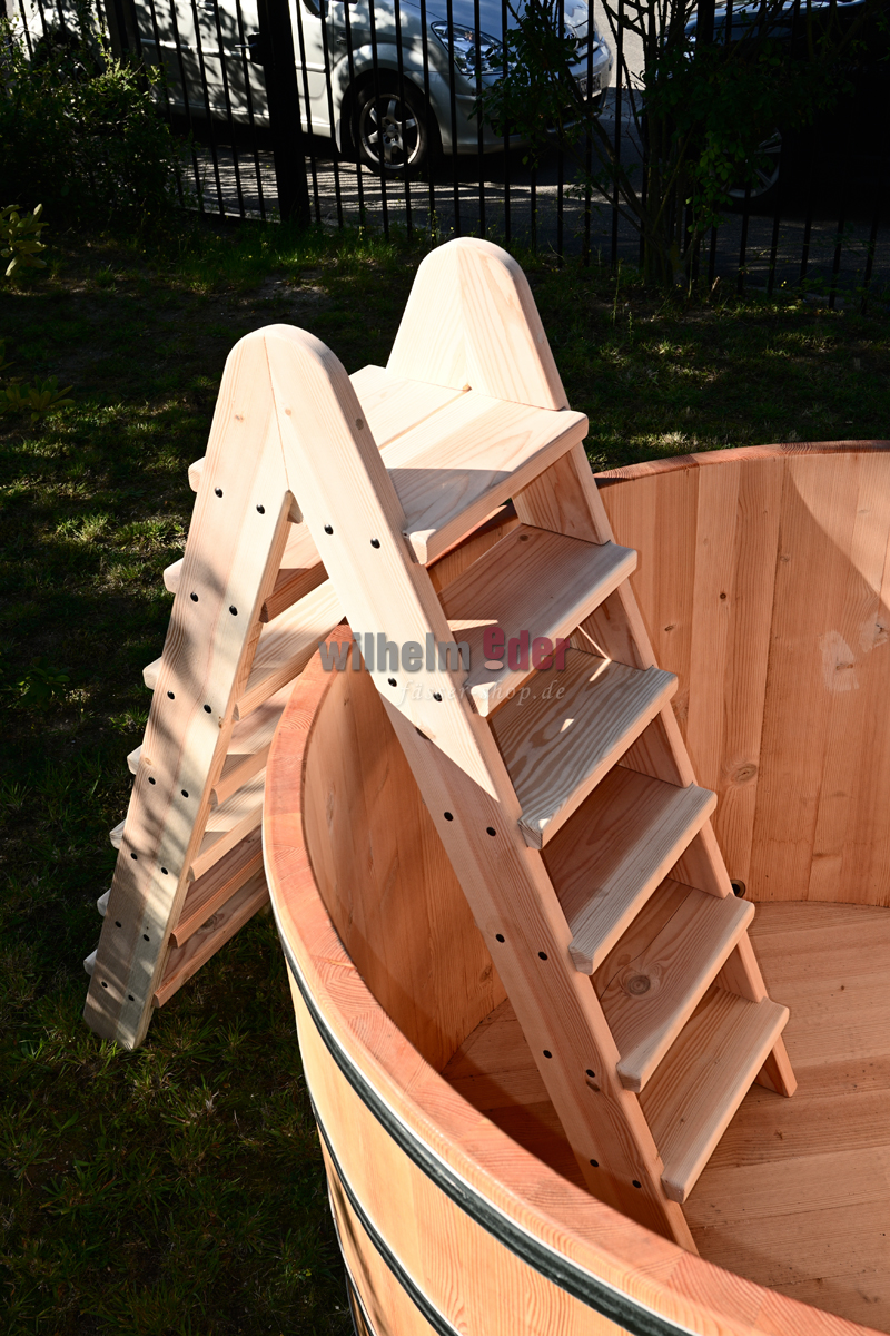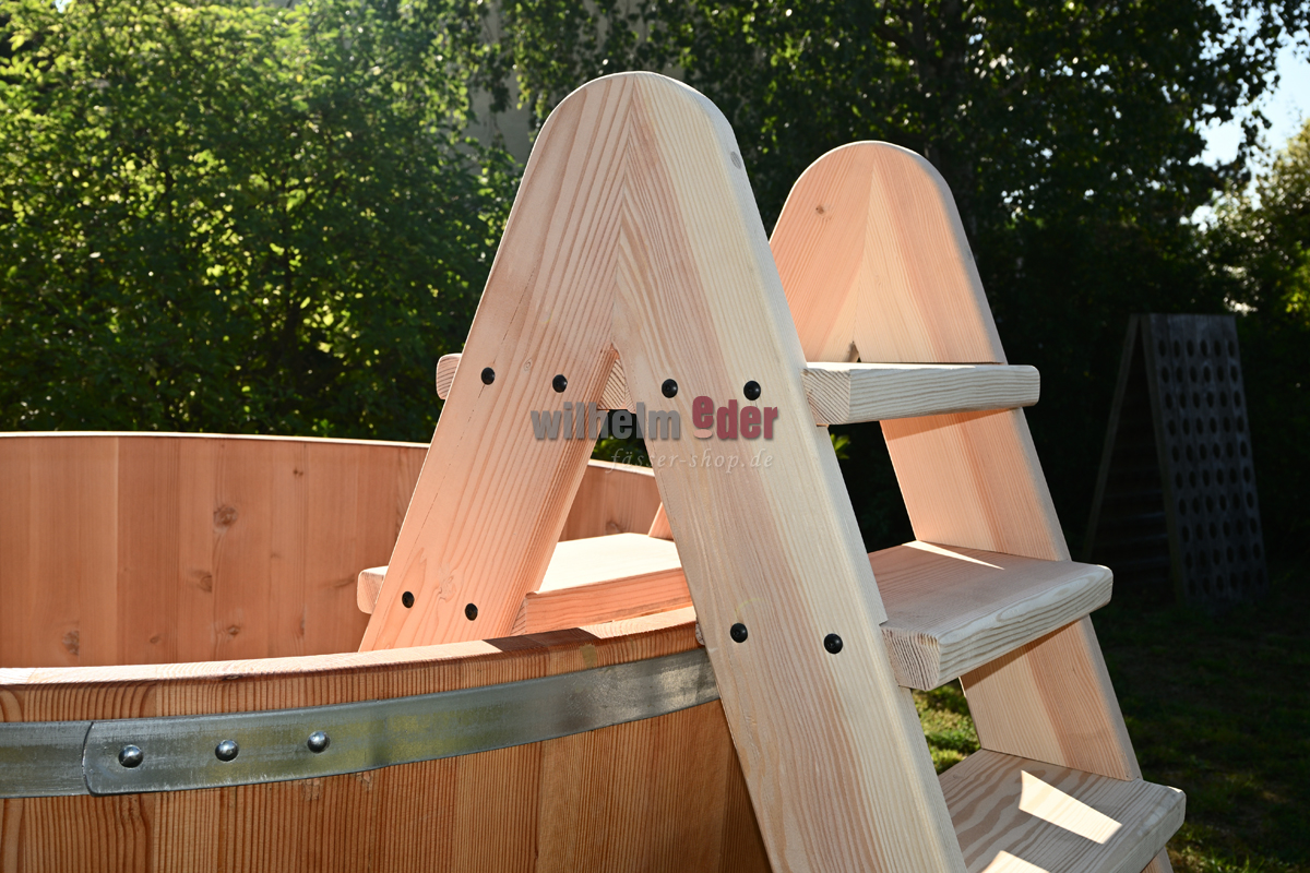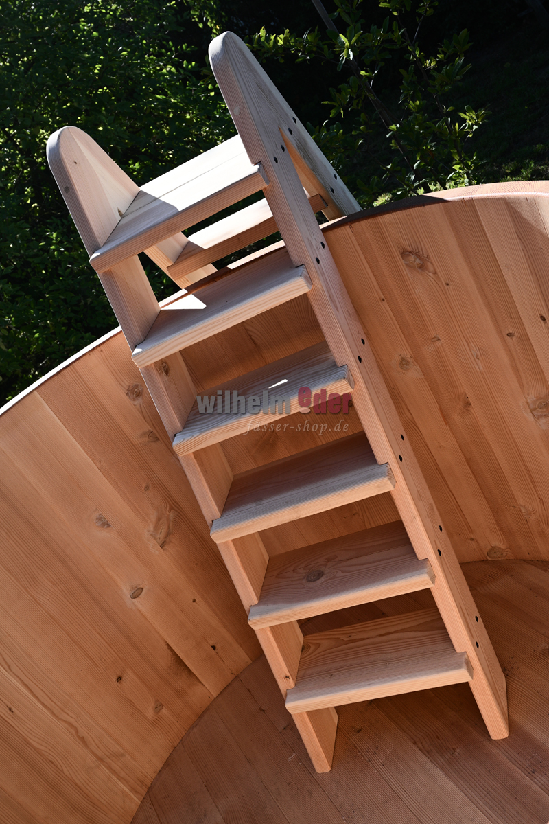 L'illustration montre une échelle pour une baignoire ronde de 2 500 litres. En fonction du design et des dimensions de la baignoire, celle-ci est adaptée et, par conséquent, chaque échelle est unique et diffère visuellement de l'illustration.