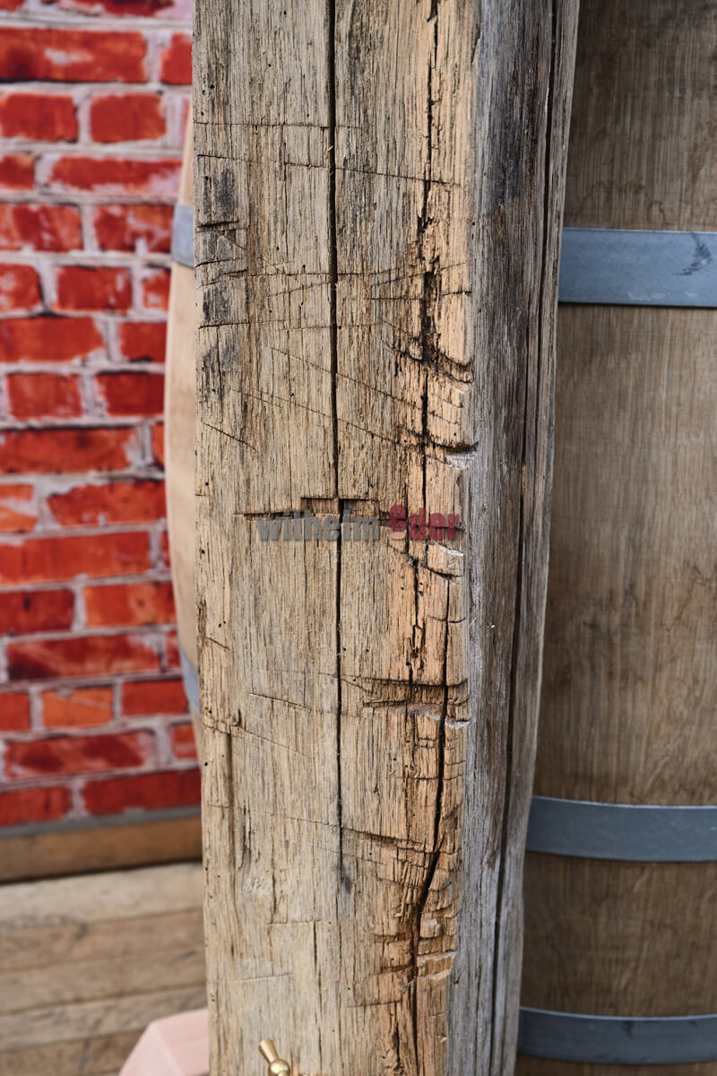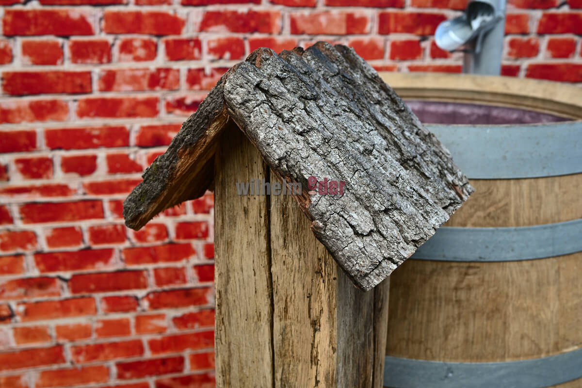 La poutre en chêne n'est pas traitée et provient d'une ancienne maison à colombages. Le toit est composé d'écorces d'arbres. Nos menuisiers ont percé un trou pour le tuyau et le robinet à travers la poutre, et ont installé le robinet et les raccords. Ceux-ci sont automatiquement installés lors d'une commande en rapport avec une tonne à eau.