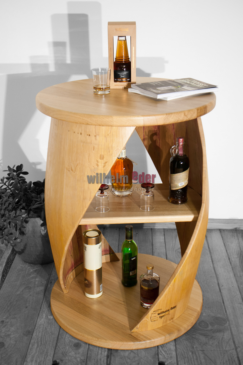 Fût exclusif, fabriqué à partir d'un tonneau à vin de 225 l d'occasion, qui a été transformé en ce grand meuble dans le cadre d'un travail artisanal élaboré. Le fût a été nettoyé professionnellement, séché, collé et finement poncé. Deux courbes sciées sur le côté font du canon l'attraction de votre pièce préférée. L'étagère centrale est en bois massif.