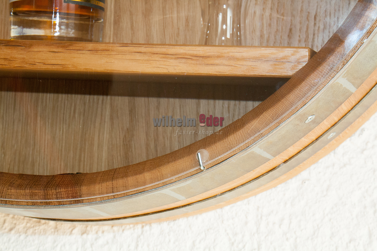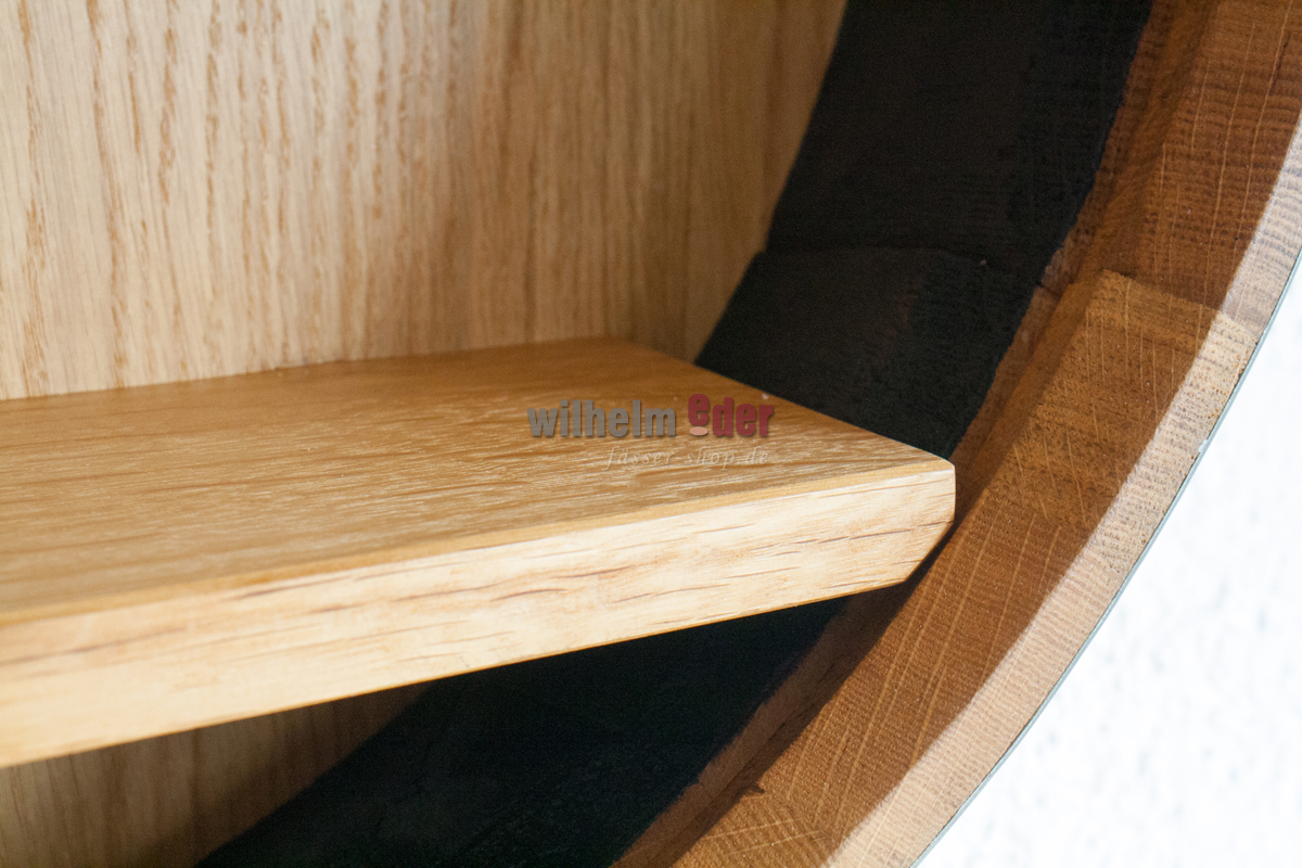 L'arrière est fermé par un panneau. Sur cette planche est fixée une étagère en chêne. Le traitement final du bois à l'huile de lin donne à la tête du baril un éclat mat et soyeux.