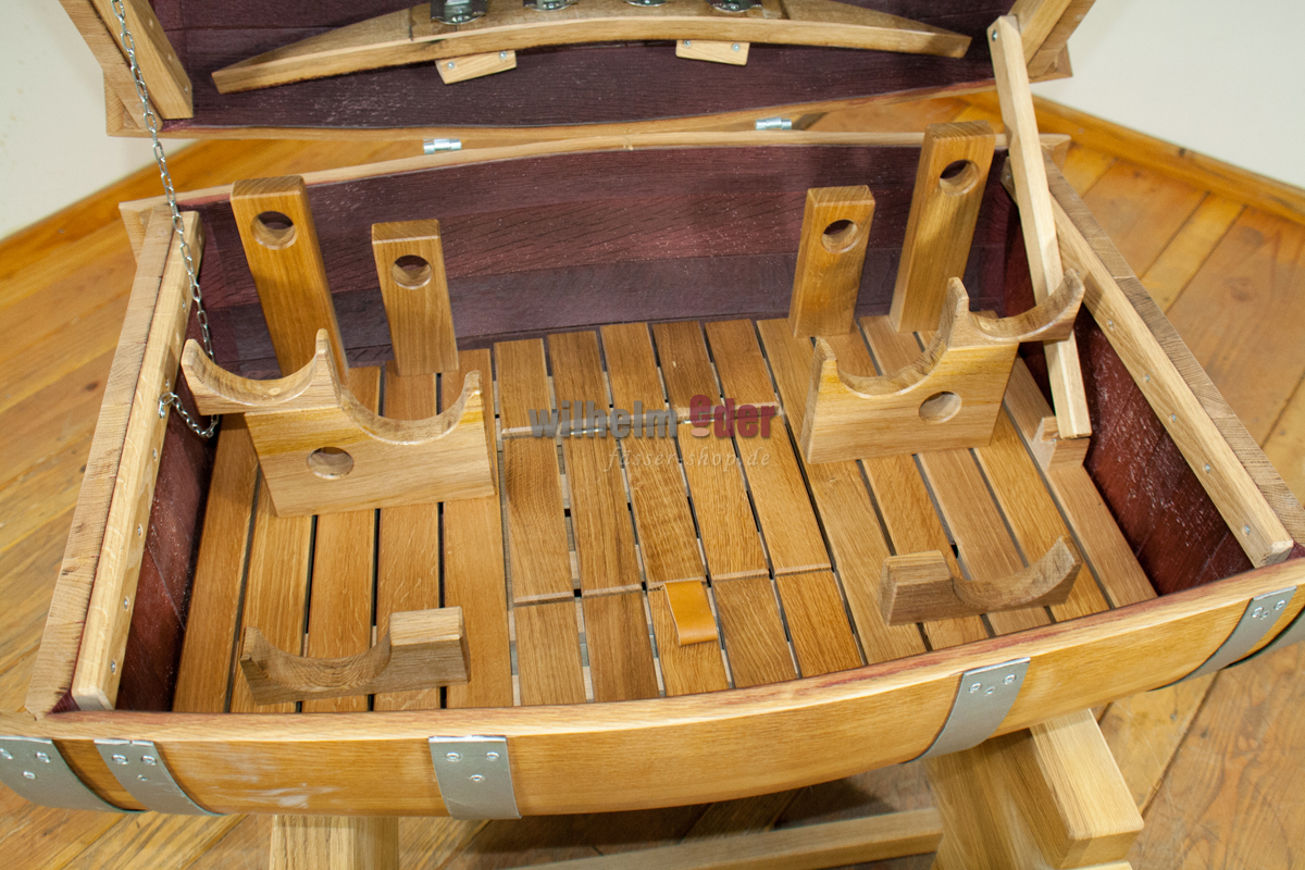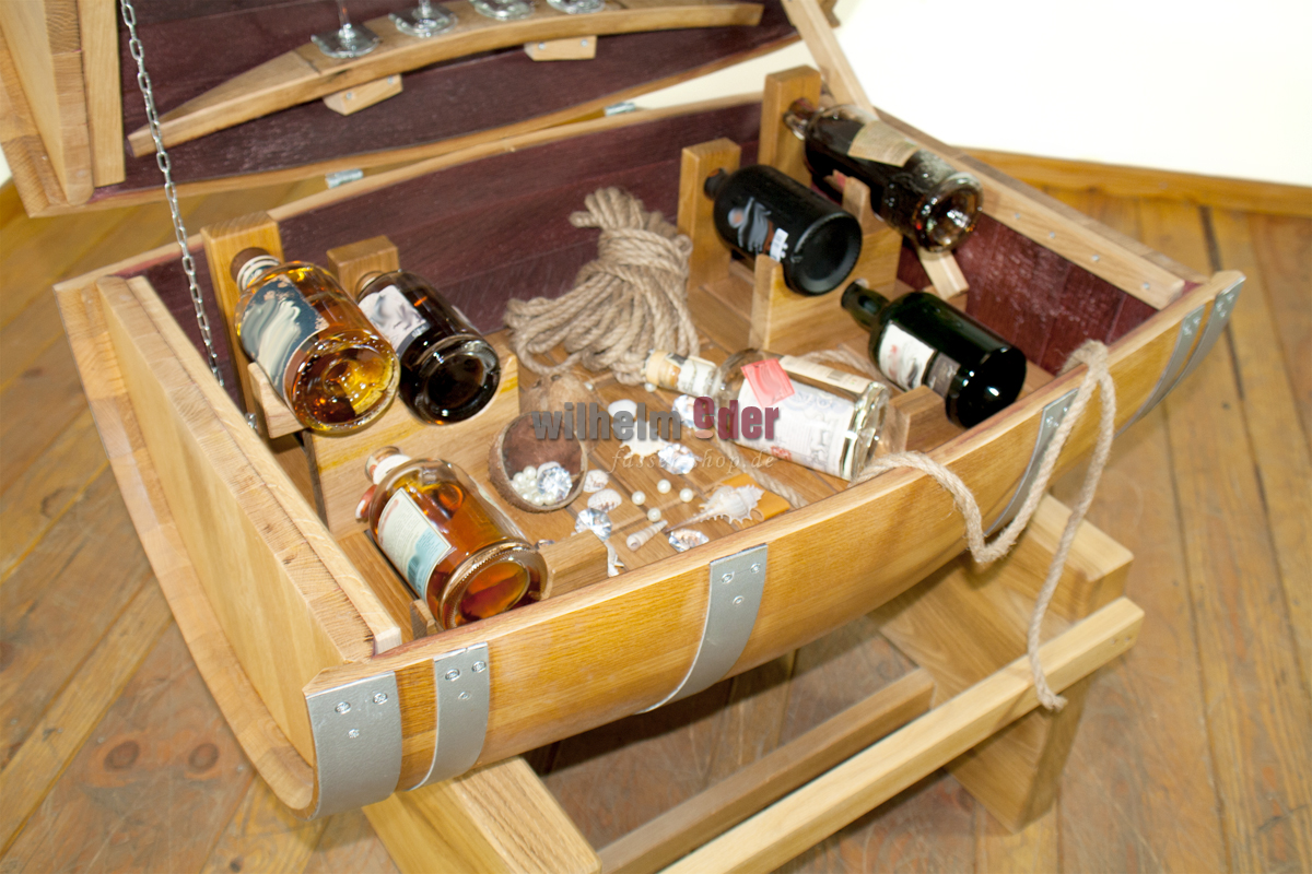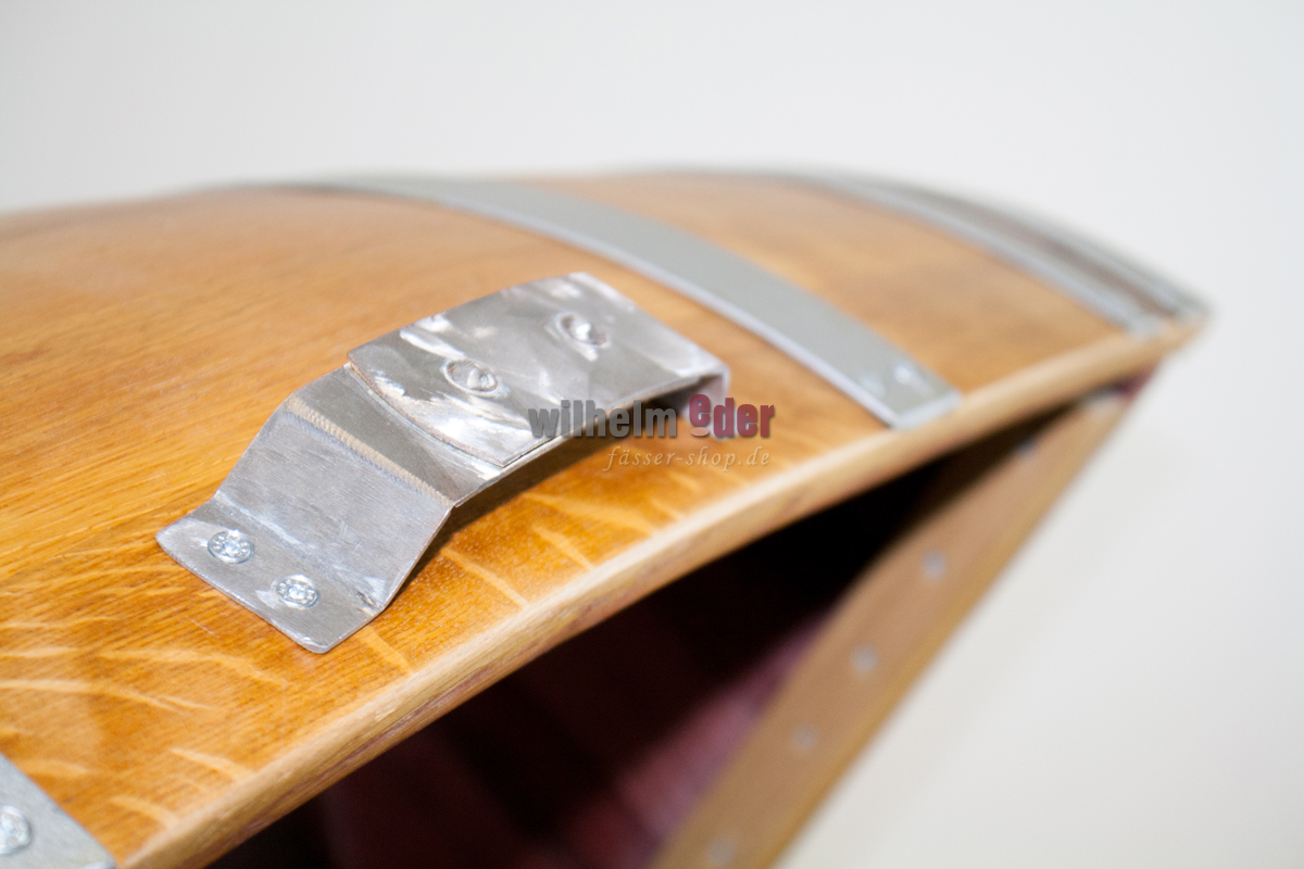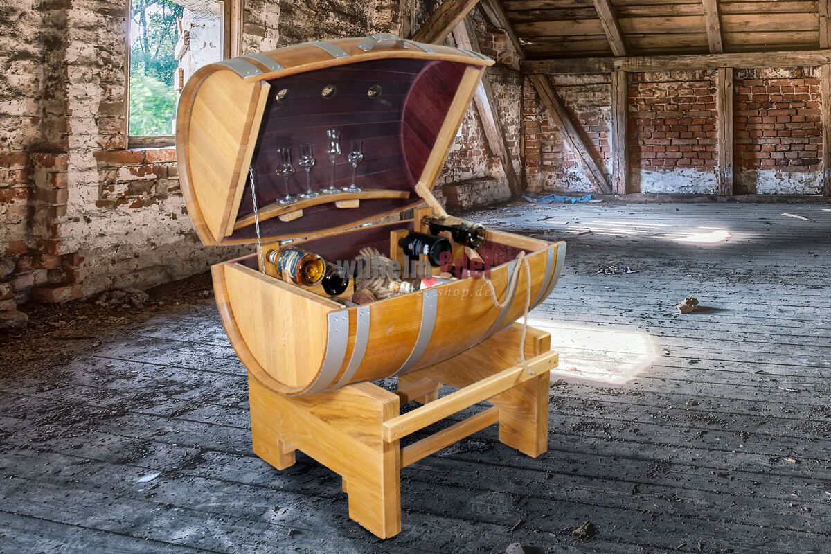Nous fabriquons le coffre au trésor de notre série de meubles FassStolz® dans notre propre menuiserie de tonneaux. La base est un tonneau de 225 l qui a été nettoyé, collé, poncé et huilé ou verni selon les souhaits du client.