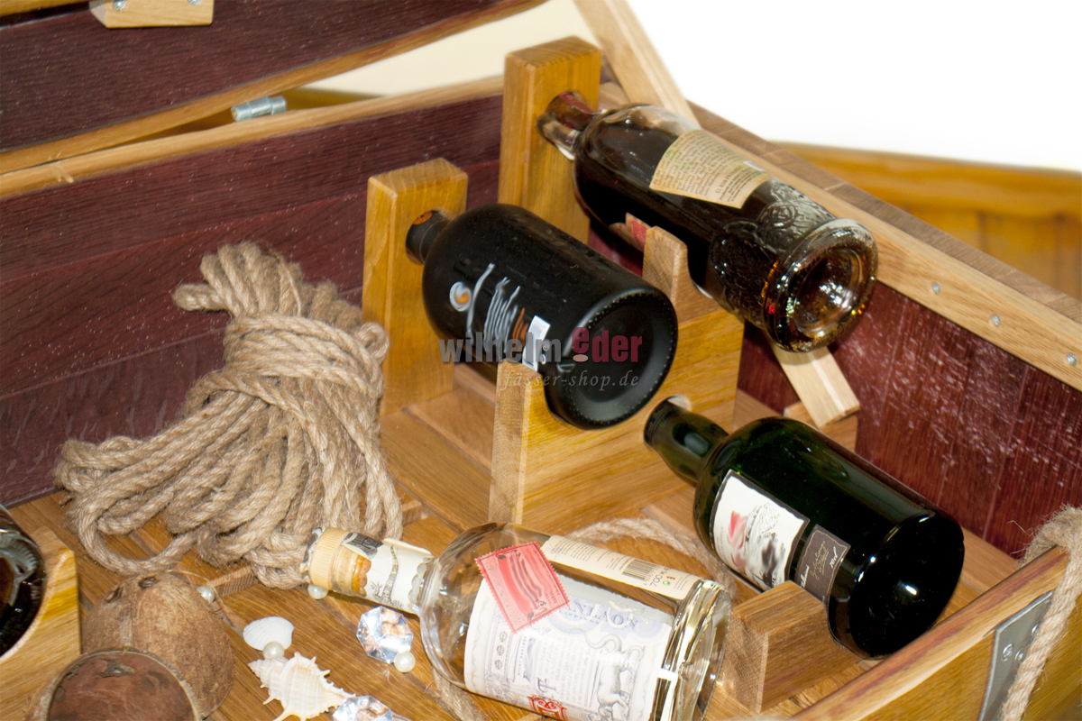 Un beau coffre pour conserver vos trésors. Avec ce bijou, vous présentez et rangez des eaux-de-vie nobles, des distillats précieux ou votre bouteille personnelle préférée. Notre coffre au trésor est une toute nouvelle version moderne du bar de la maison. Un objet unique qui attire l'attention et que vos amis vous envieront !