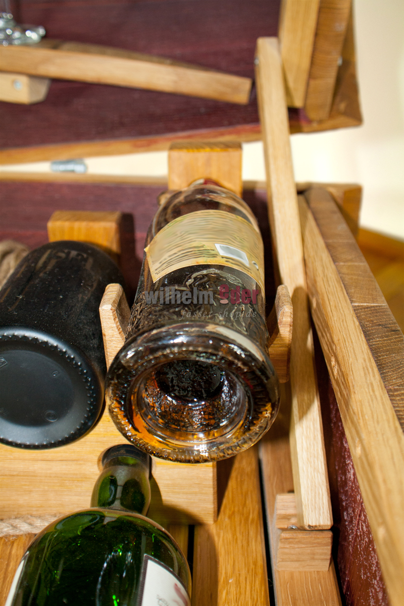 - Intérieur aménagé avec des supports pour jusqu'à 6 bouteilles, des porte-verres et un compartiment caché dans le fond pour les petits objets, comme un ouvre-bouteille ou autre.