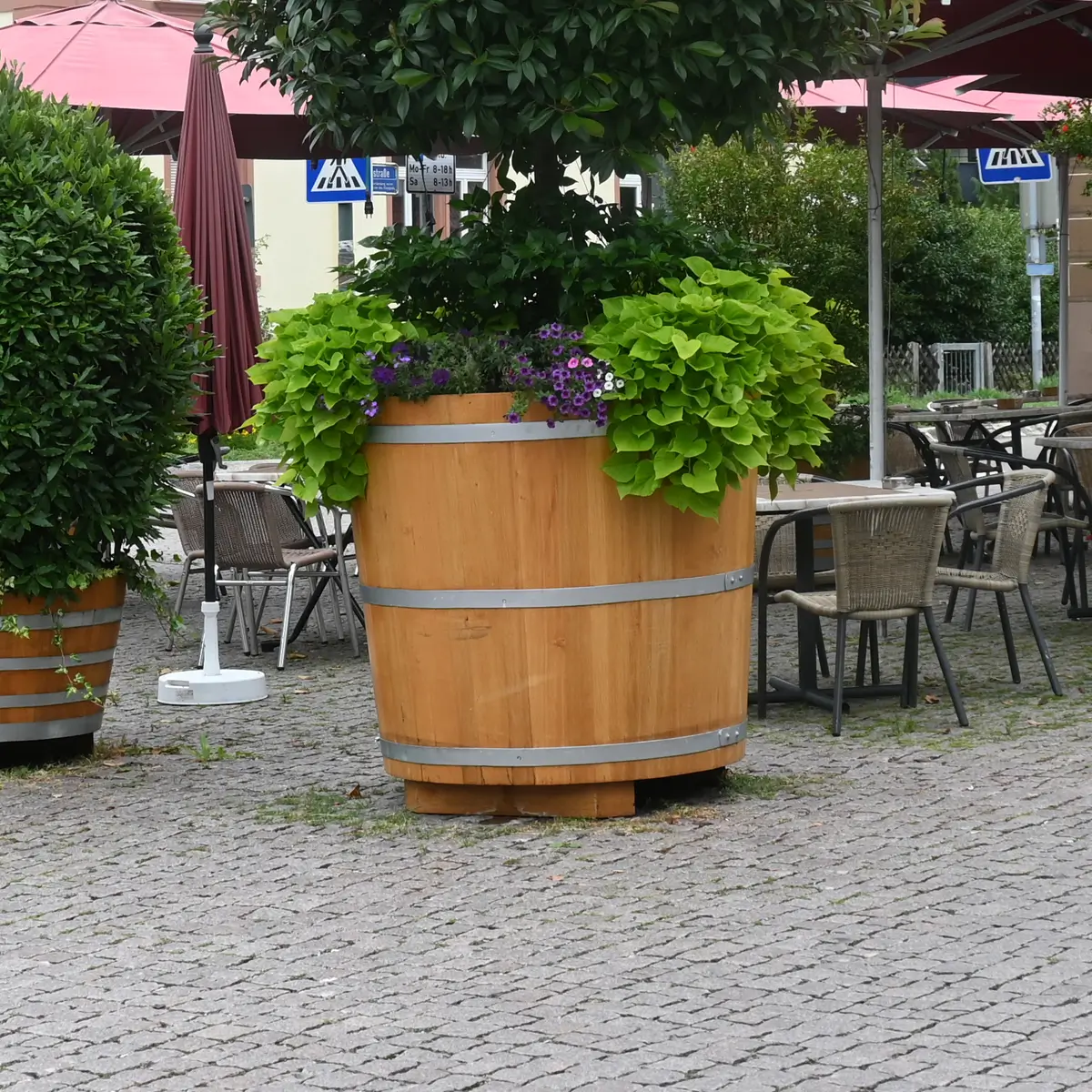 Dans notre tonnellerie, nous fabriquons des bacs à arbre professionnels en chêne local, en sapin de Douglas et également à partir de douves de fûts de vin rouge. Chez nous, les bacs à plantes sont ligaturés avec des pneus galvanisés à chaud, ce qui les rend particulièrement solides. Ces bacs robustes sont idéaux pour une plantation professionnelle et à long terme, que ce soit dans de grands jardins, des parcs ou des installations en centre-ville. Outre les bacs à arbre ronds, nous fabriquons également des bacs à plantes rectangulaires. Pour faciliter la manipulation, il est possible d'ajouter des poignées métalliques et des structures de support.