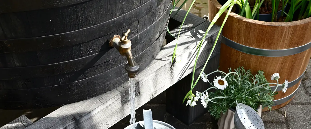 Tonneau de pluie fabriqué à partir d'une barrique usagée en bois de