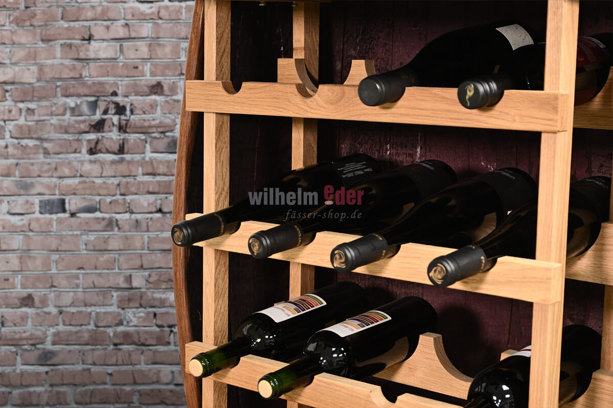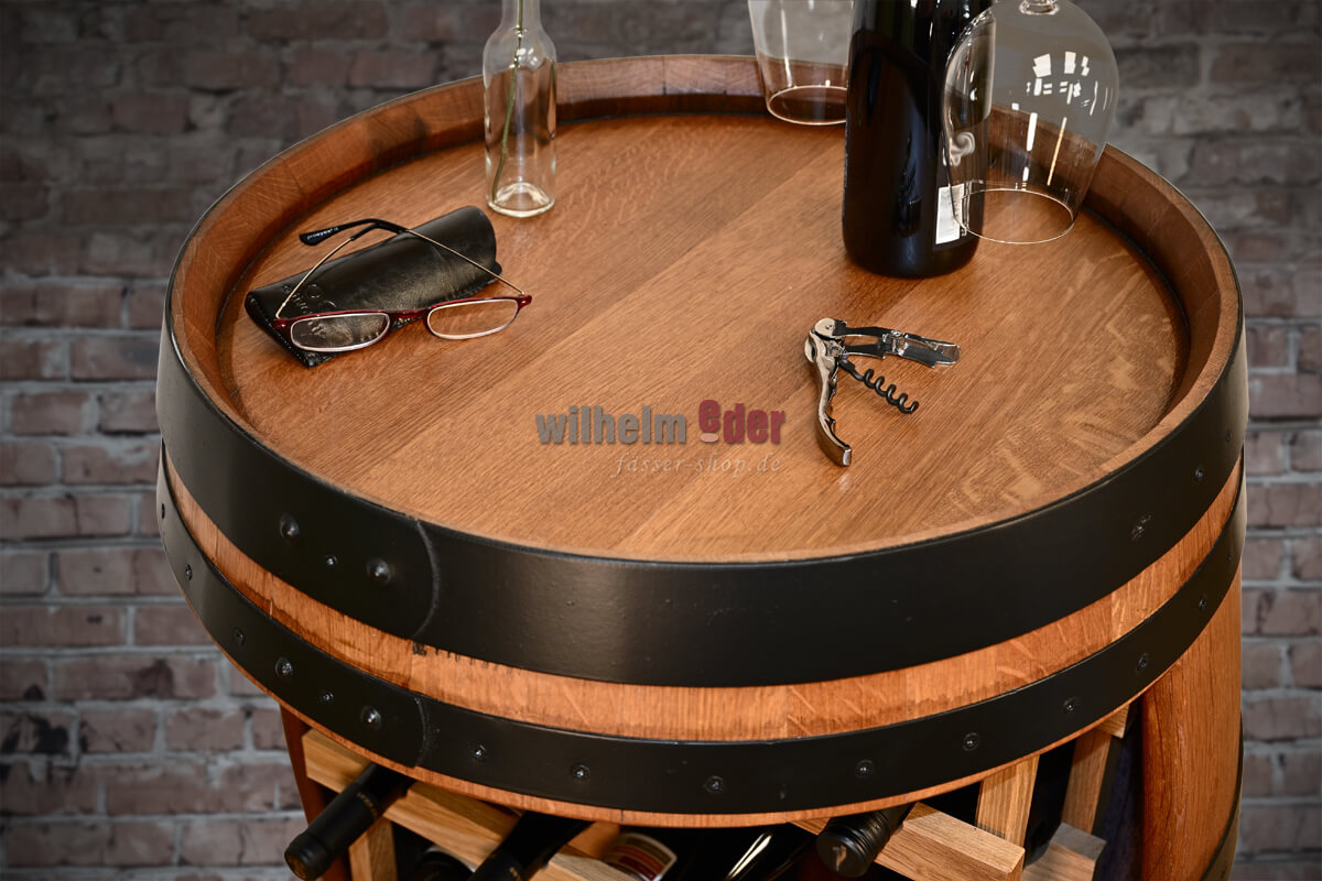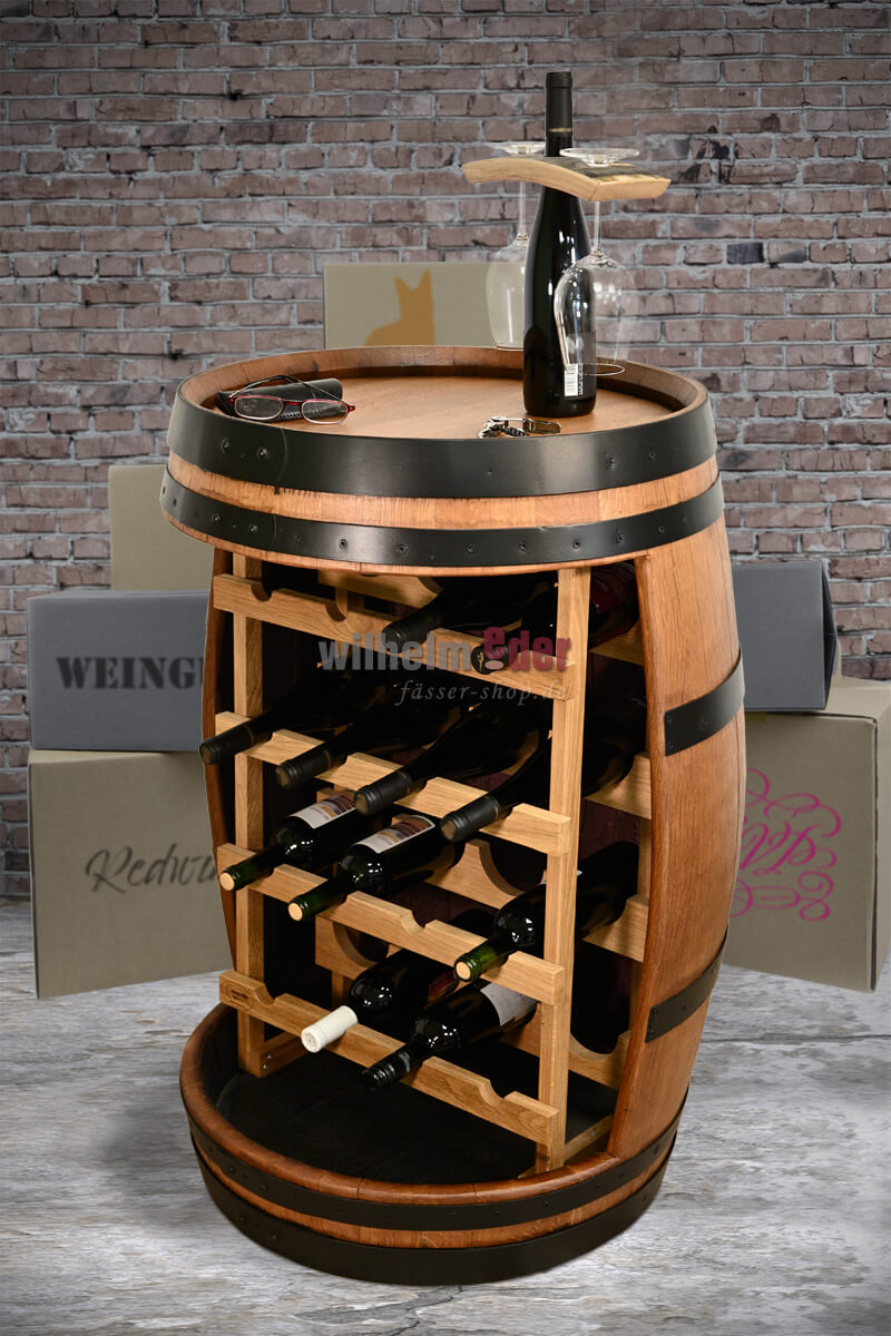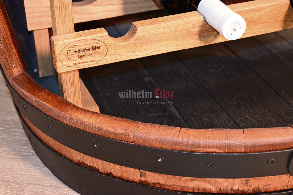 Vous voulez ranger ou décorer vos délicieuses gouttes avec style ? Nous vous proposons ce beau fût à étagère, produit à partir d'un fût de chêne de 225 l dans notre tonnellerie Wilhelm Eder à Bad Dürkheim, Palatinat.