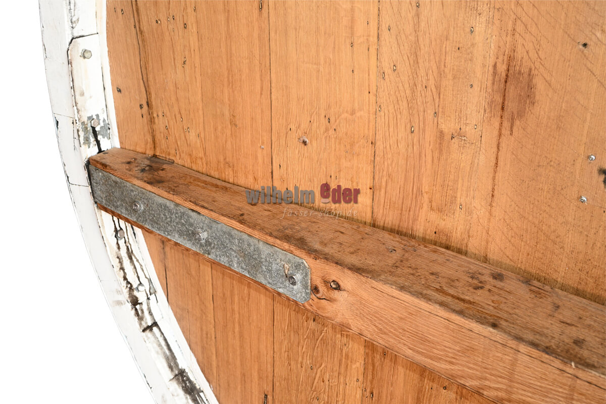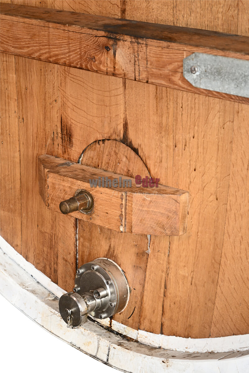 Tonneau en chêne d'occasion, contenance env. 4160 l - un tonneau décoratif exceptionnellement grand, authentique avec son équipement en acier inoxydable de pré-remplissage de liqueur aux herbes - Le tonneau présente des traces d'utilisation et quelques douves entamées.