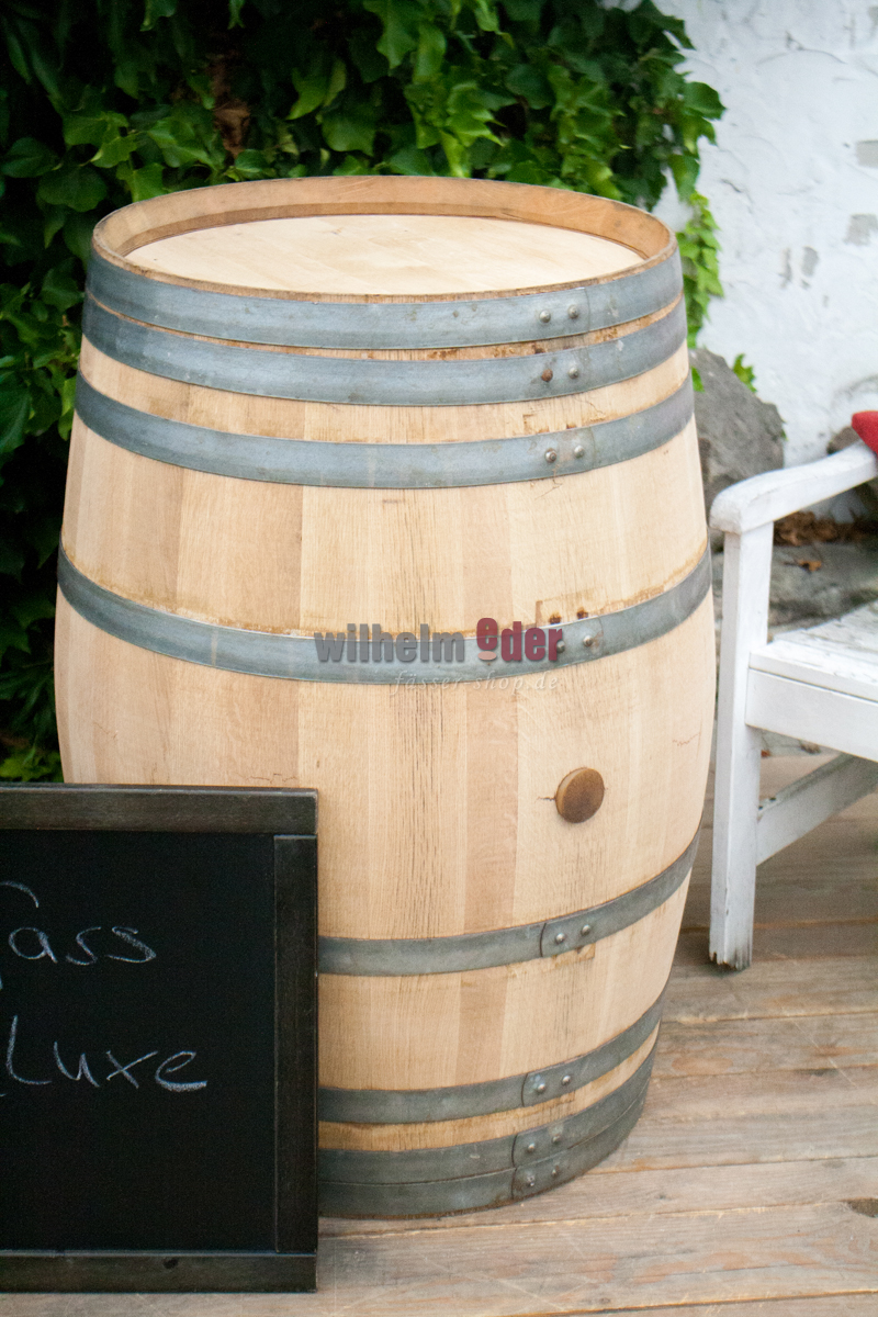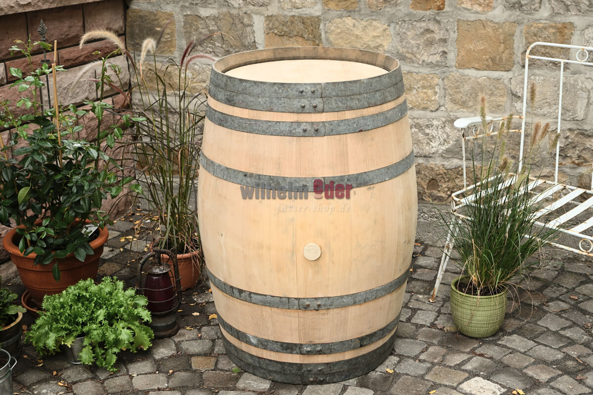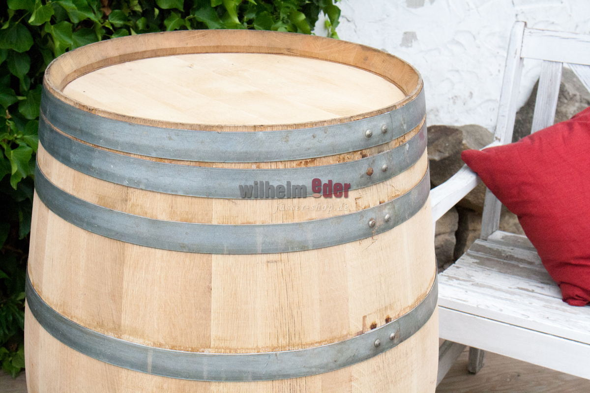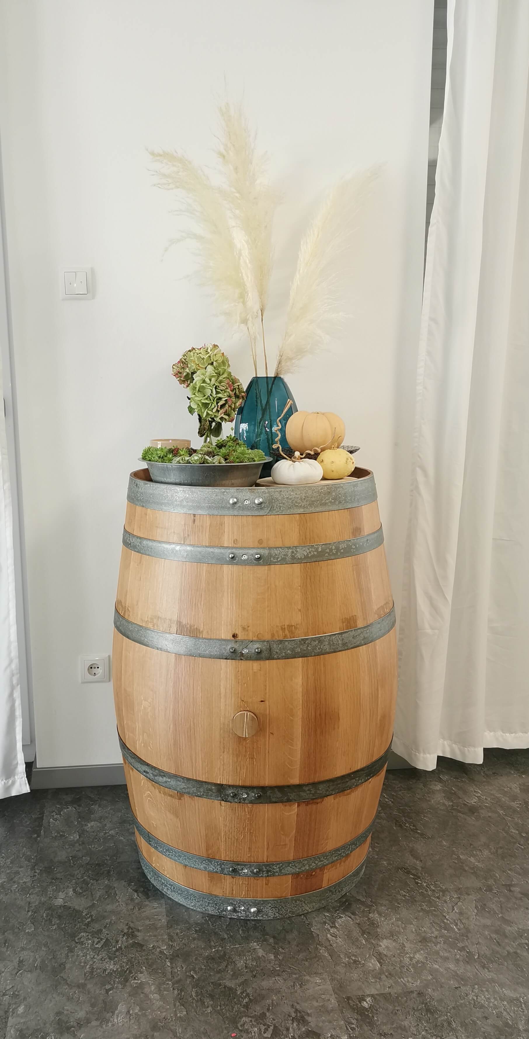 Très belle barrique de 225 l d'occasion, poncé, brillante, en bois de chêne de premier choix, équipée de cercles galvanisés. Les tonneaux peuvent très bien être utilisés comme table haute, pour la décoration ou comme présentoir. Certains des cercles galvanisés présentent un peu de rouille.