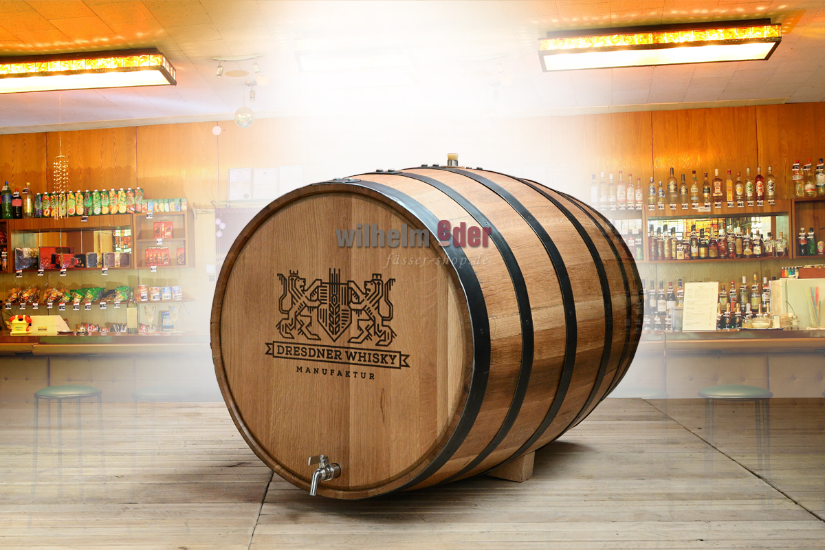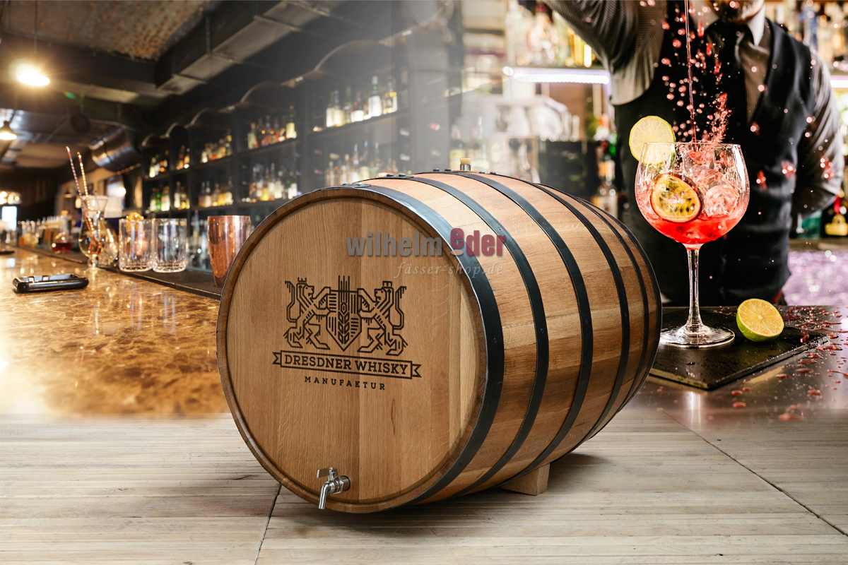 Le tonneau en chêne est marqué au laser de façon personnalisée, le bois de chêne est incolore et les arceaux du tonneau sont peints en noir.
