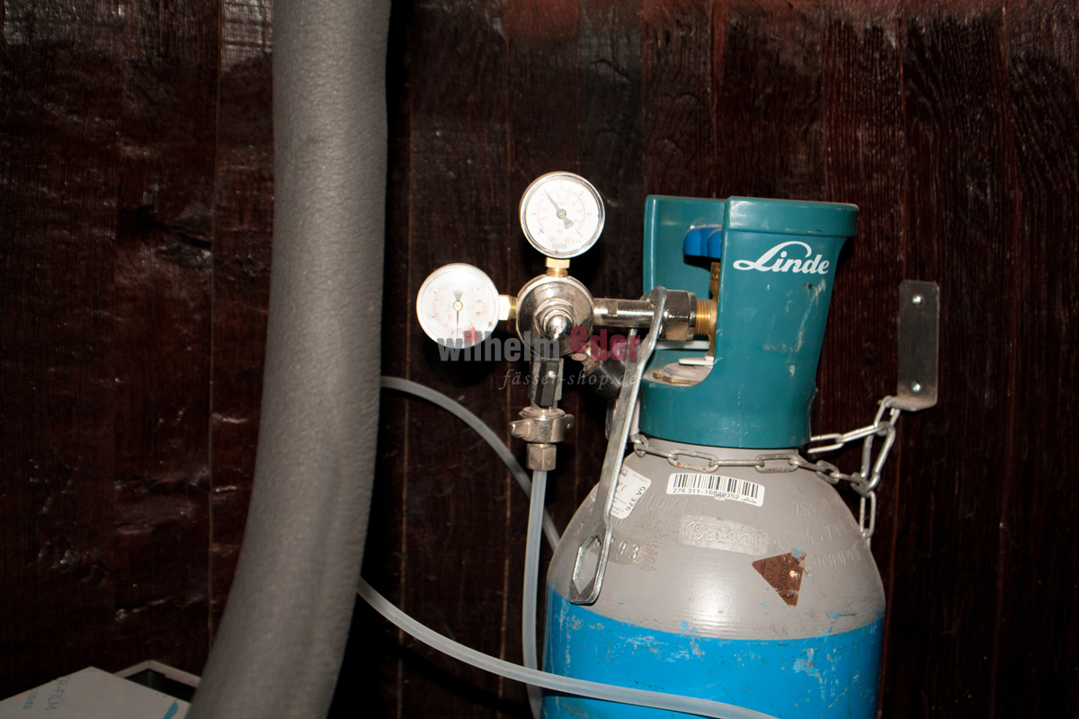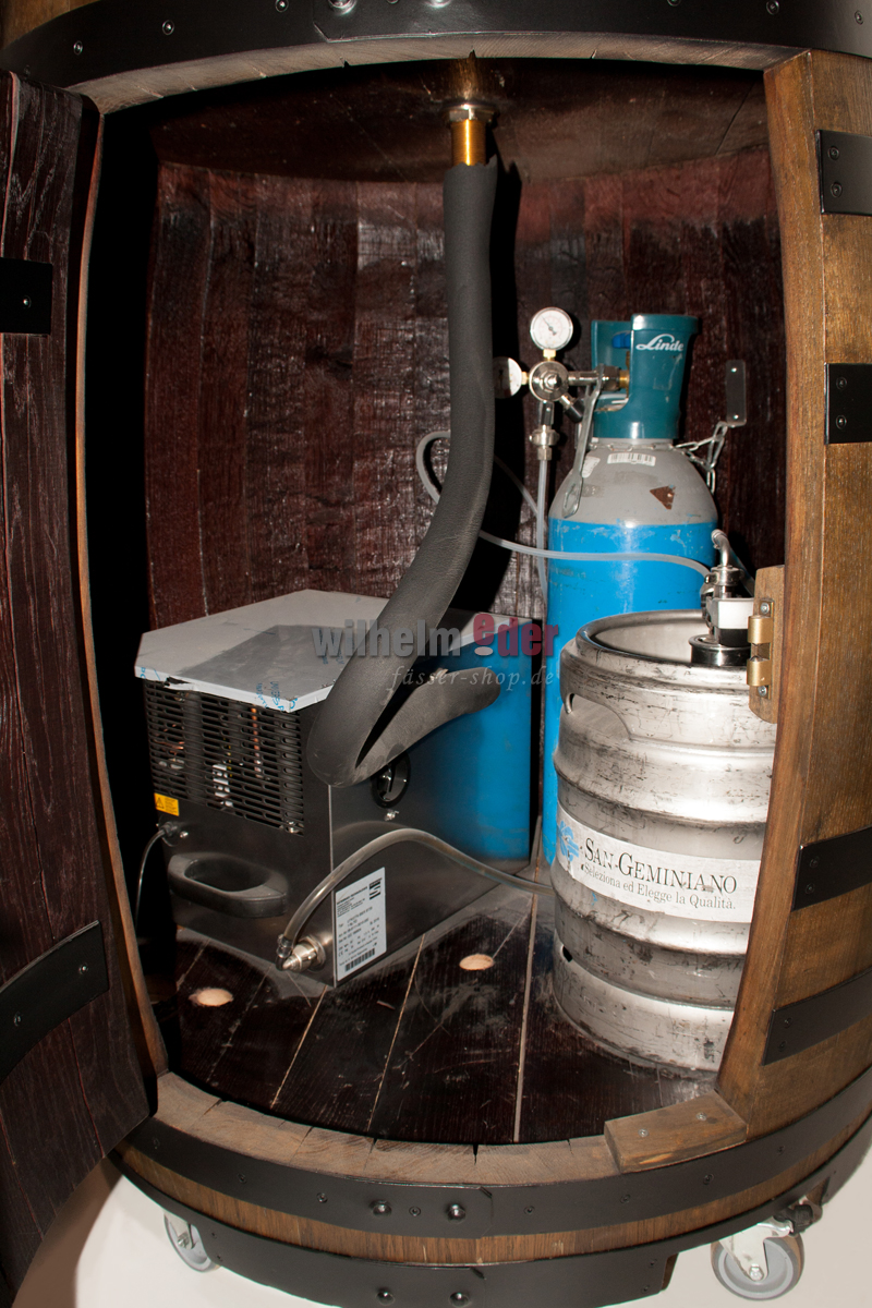 Le branchement électrique nécessaire et un détendeur avec un indicateur du niveau en bar peuvent être passés facilement par une ouverture latérale. Tête de fût Keg plate ou corbeille (selon le client). De plus, le fût contient une chaîne de sécurité pour la bouteille de gaz carbonique et un égouttoir 20 x 30 cm.