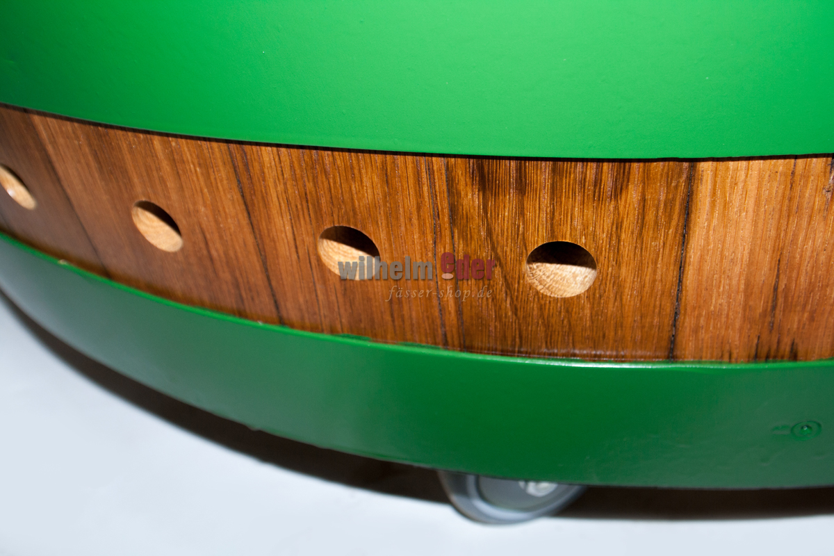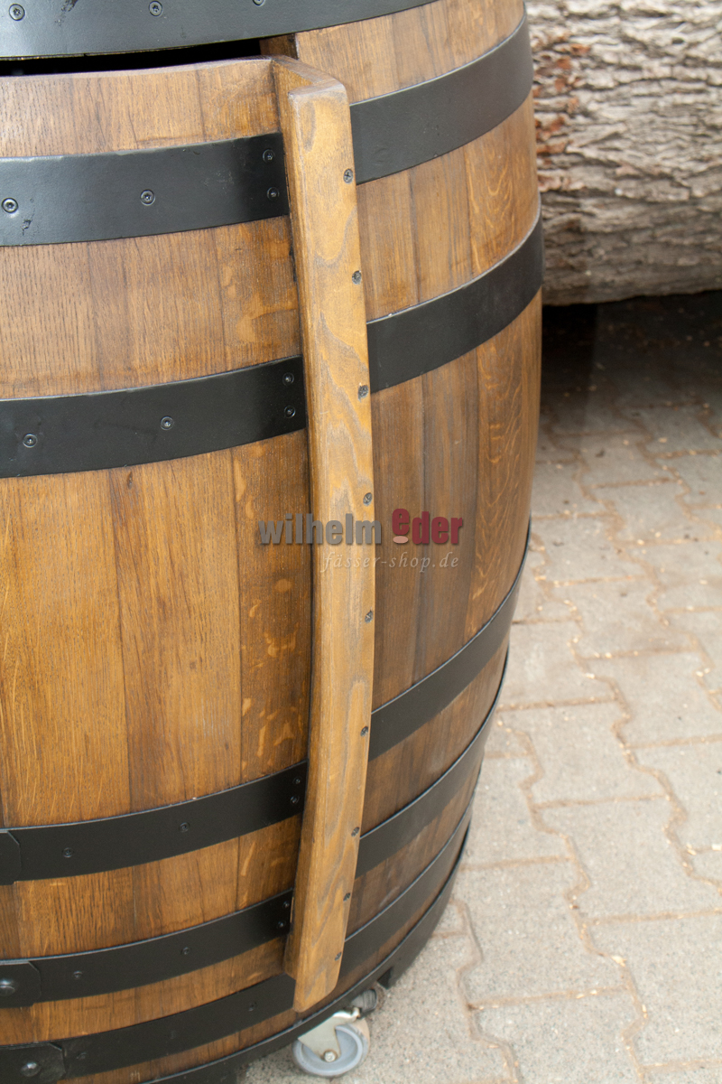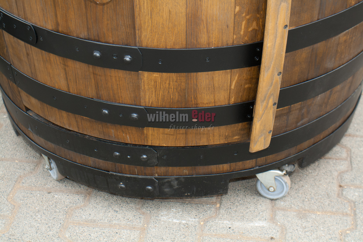 Sur le côté avant du fût se trouve une ouverture. Les cercles sont vissés professionnellement, ne peuvent donc pas tomber et sont laqués. Le fût est poncé et laqué avec un vernis de bateau. Le fond du fût est renforcé professionnellement.