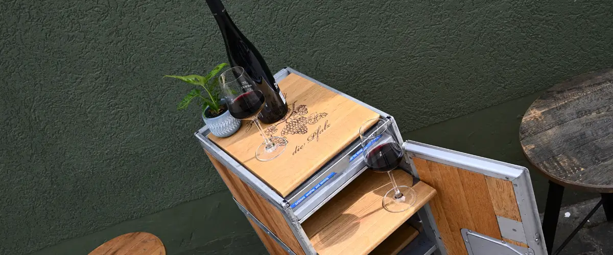 Bar de vin fabriqué d’un ancien trolley de board d’une grande compagnie aérienne allemande.