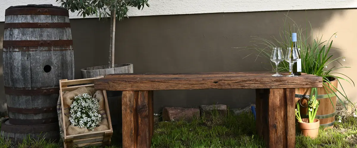Banc de barrique exclusif, fait de douves de barrique de vin provenant d'un grand tonneau. De nombreuses années de vin rouge y ont été stockées, ce qui donne au banc un aspect unique.