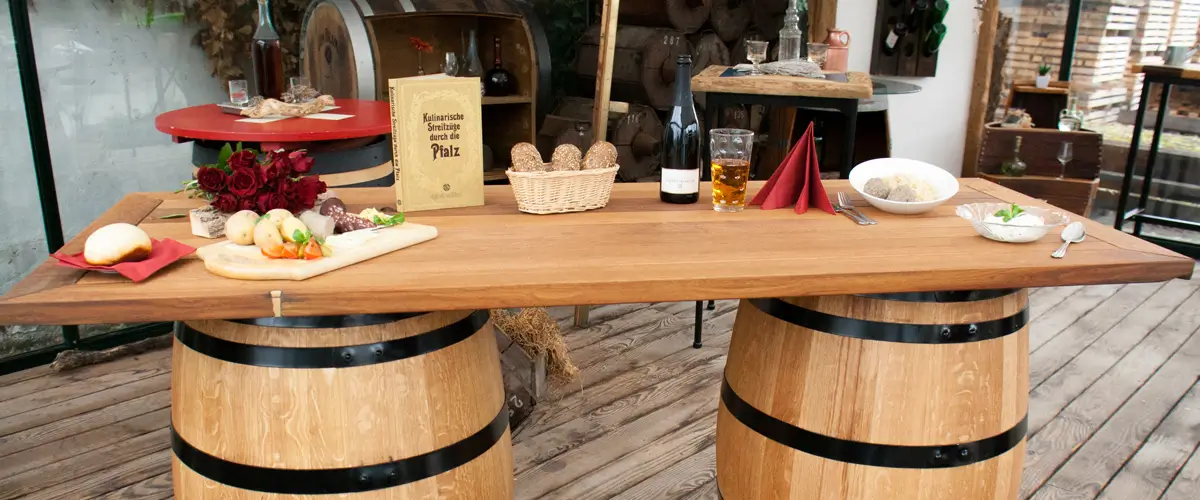Nous produisons chaque plateau de table individuellement dans notre tonnellerie. Nous nous procurons les grumes dans la région de la forêt du Nordvogesen/Palatinat.  Les plateaux de table sont en bois carré massif, rainurés et collés, et les bords sont chanfreinés. Si vous le souhaitez, le dessus peut être traité à l'huile de lin pour lui donner un éclat mat et soyeux.Trois petits blocs de bois sont fixés sous le plateau de la table, ce qui permet de la placer sur un tambour de 225 l.Le bois est un produit naturel, les fortes variations de température, l'air sec ou chaud, l'humidité, etc. peuvent provoquer le gauchissement de la planche. Veuillez en tenir compte lors de l'utilisation ou du stockage de la planche.En option, nous personnalisons le plateau de table avec votre marque laser individuelle.Des grains et des formes de croissance naturels et individuels assurent l'exclusivité de nos produits.