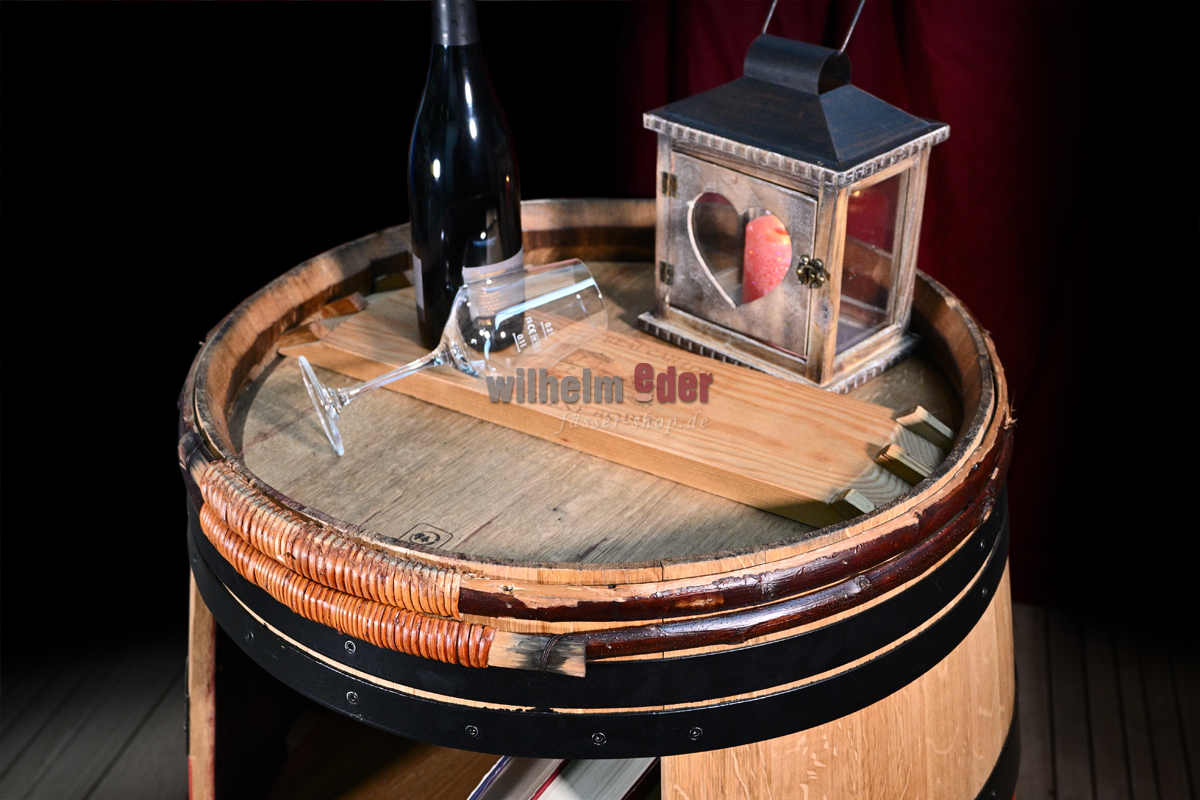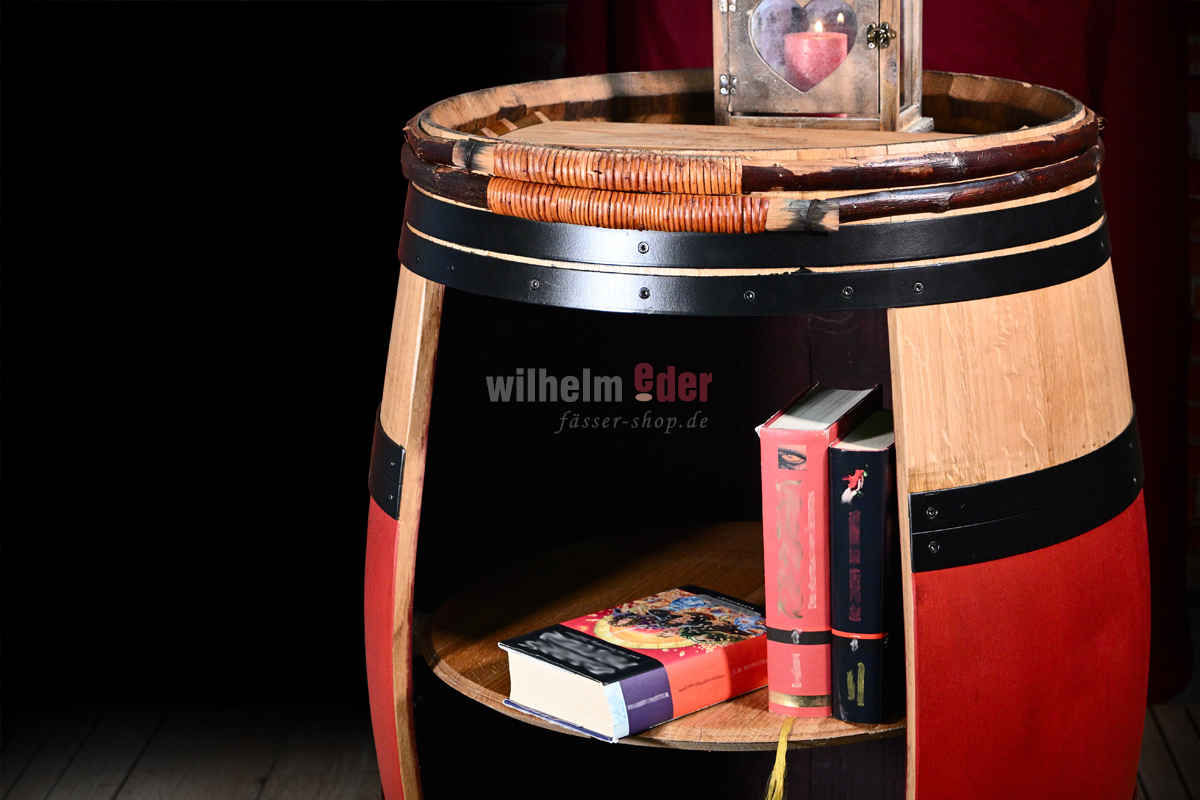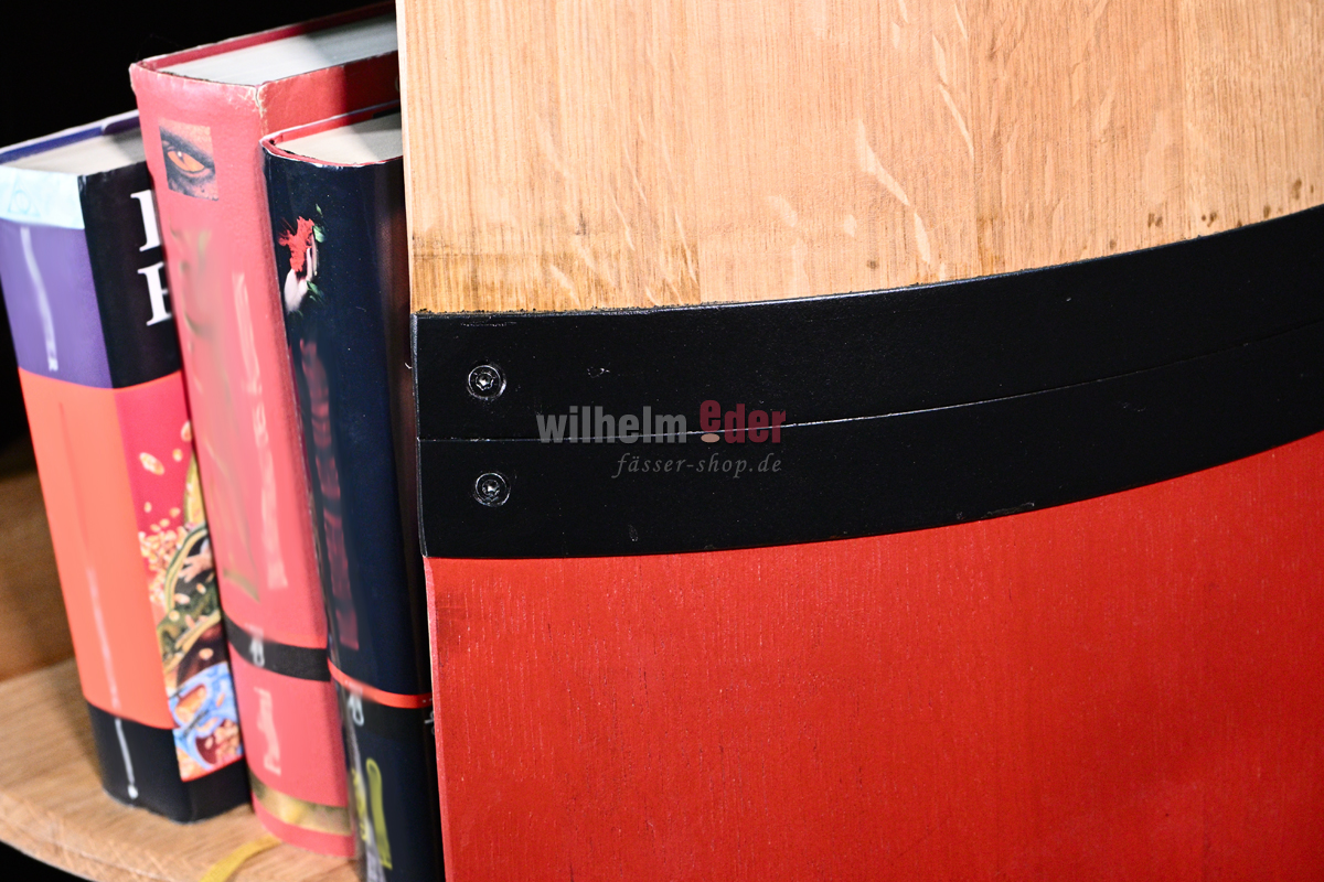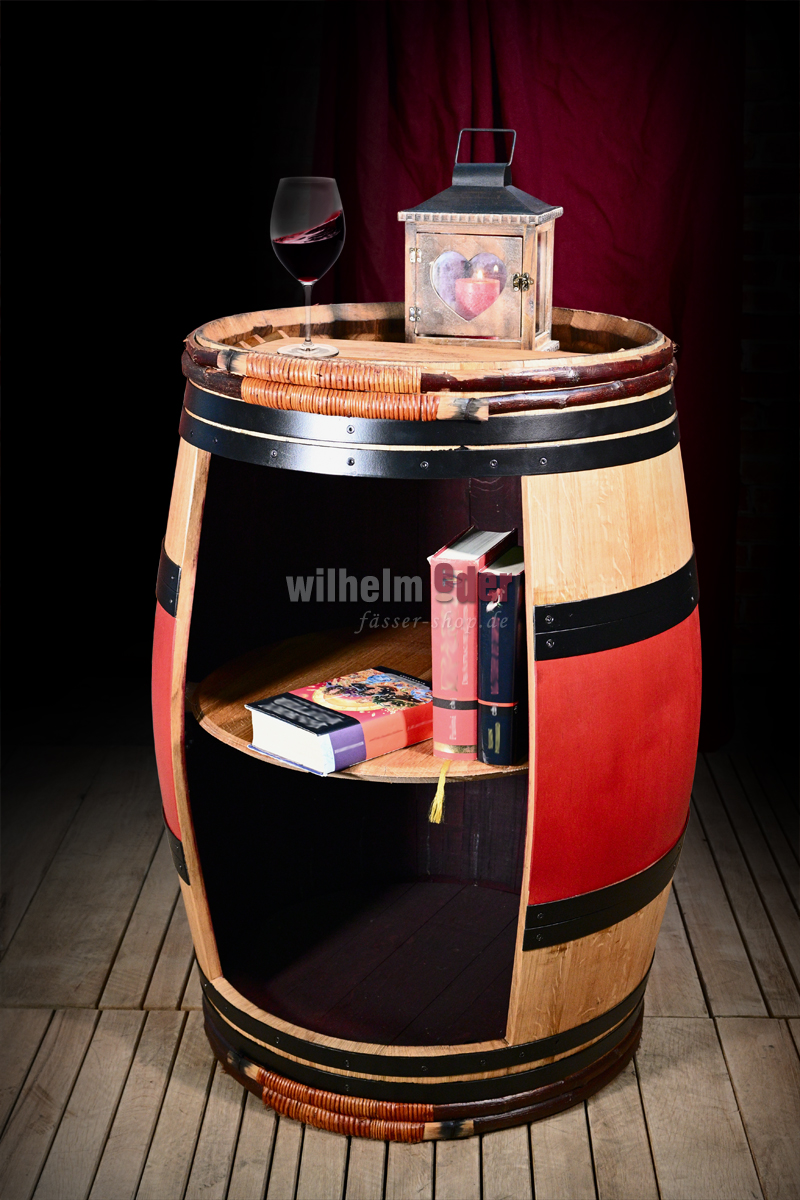 Le tonneau est ouvert à l'avant et transformé en étagère à l'aide d'un fond de tonneau. Les cercles métalliques sont peints en noir.