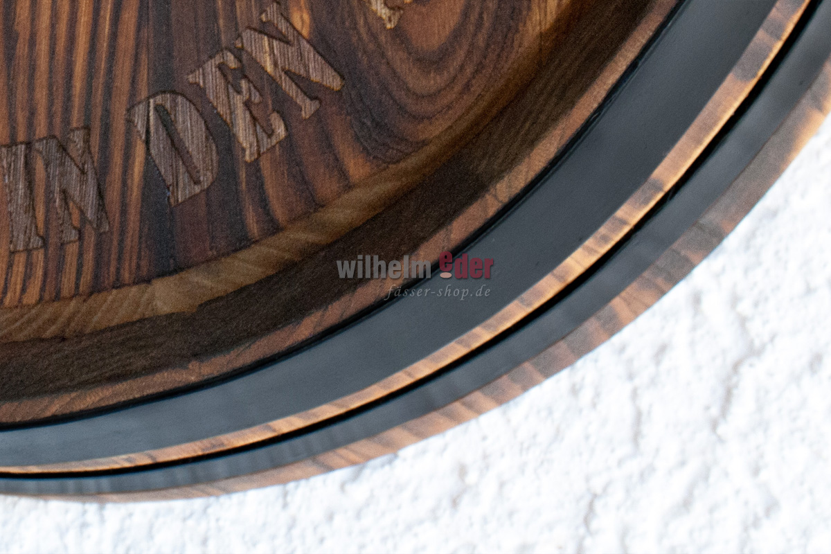 Notre atelier de menuiserie produit des sections de têtes de fûts décoratives à partir de fûts de châtaignier. Pour les fûts de châtaignier, la tête est coupée à 12-14 cm (selon l'endroit où sont placés les cerceaux du fût). Les têtes de fûts sont nettoyées, poncées, collées, flammées et huilées dans notre menuiserie. Les arceaux sont peints en noir.