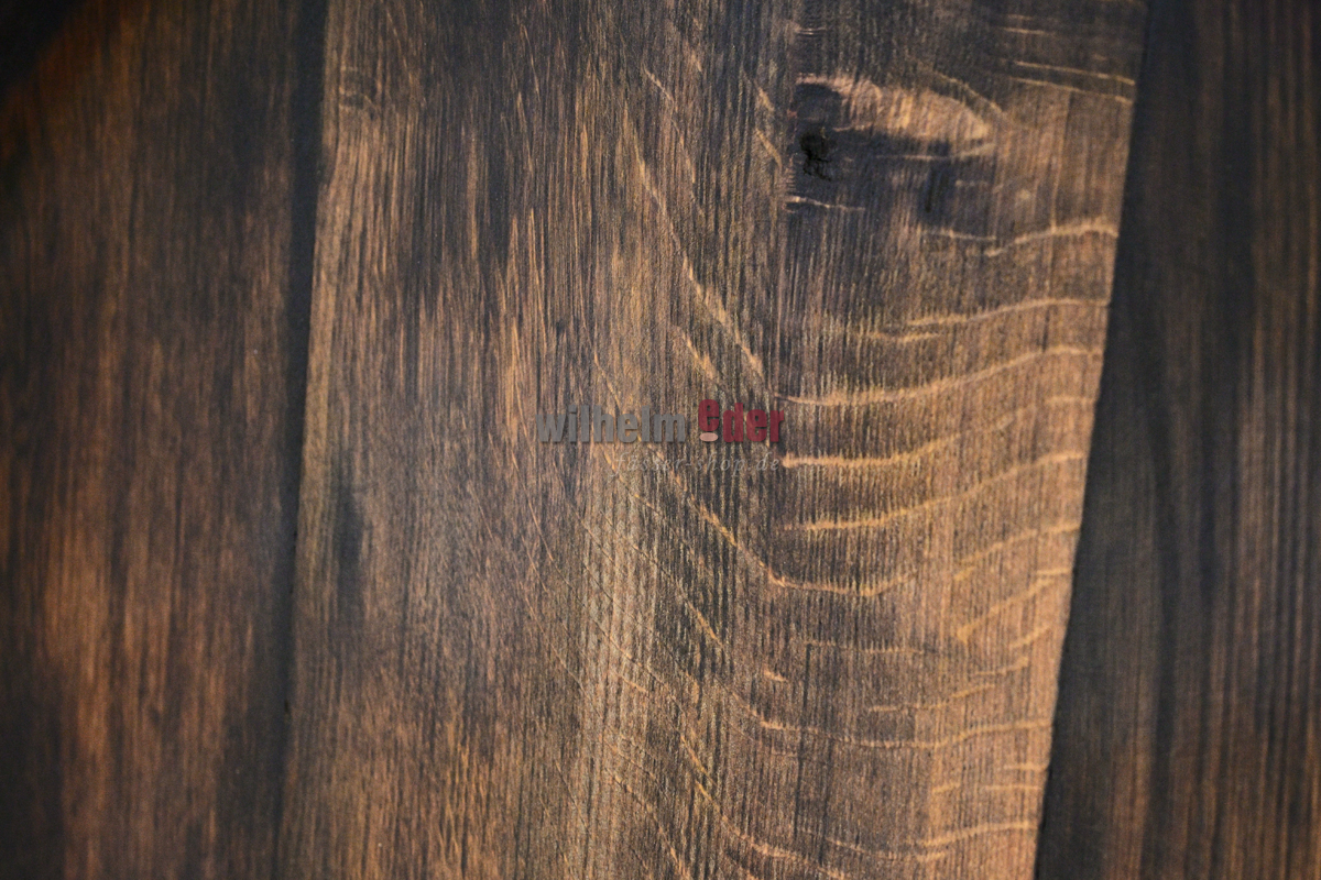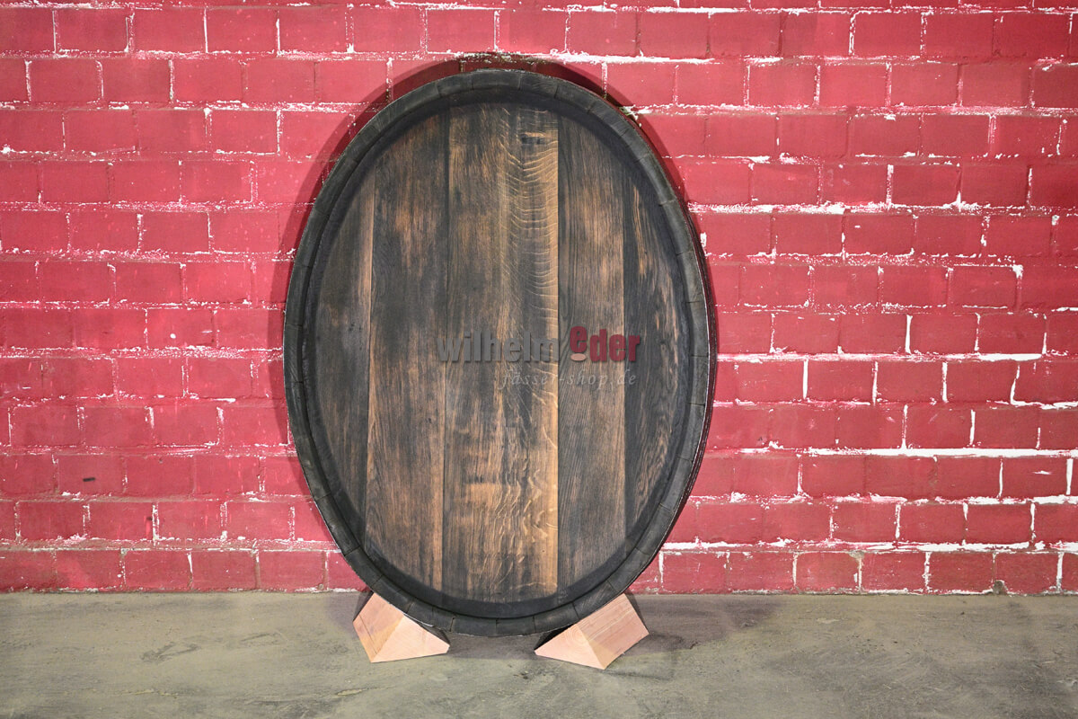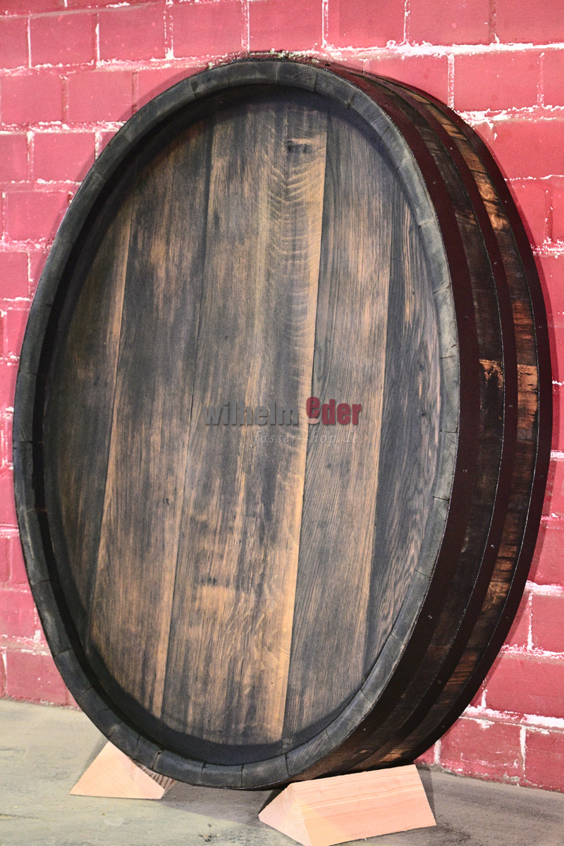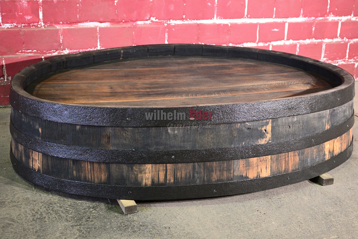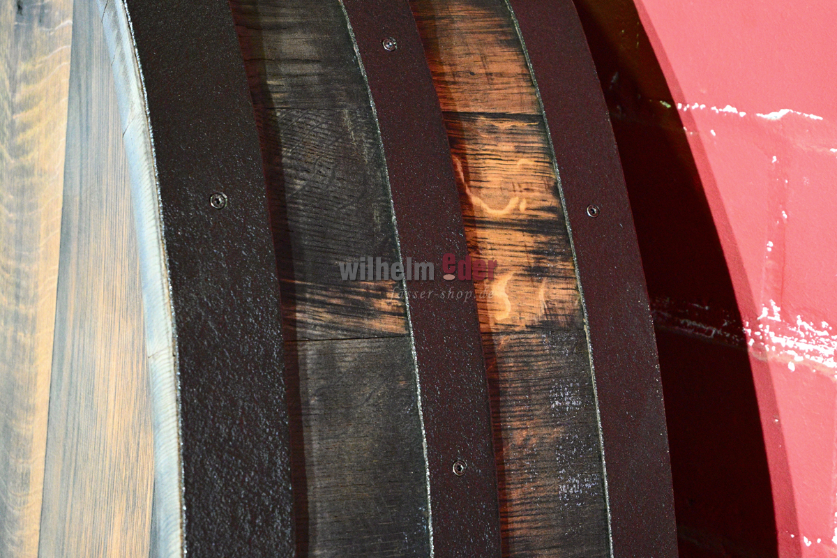 La partie supérieure est coupée des anciens fûts ovales, puis elle est poncée et nettoyée. Les cercles et douelles sont fixés et les bords bruts ébarbés. Ensuite elles sont huilées et les cercles sont laqués en noir.