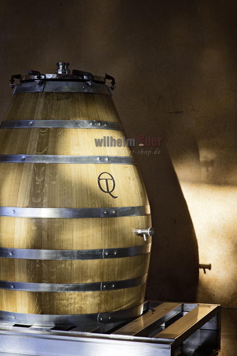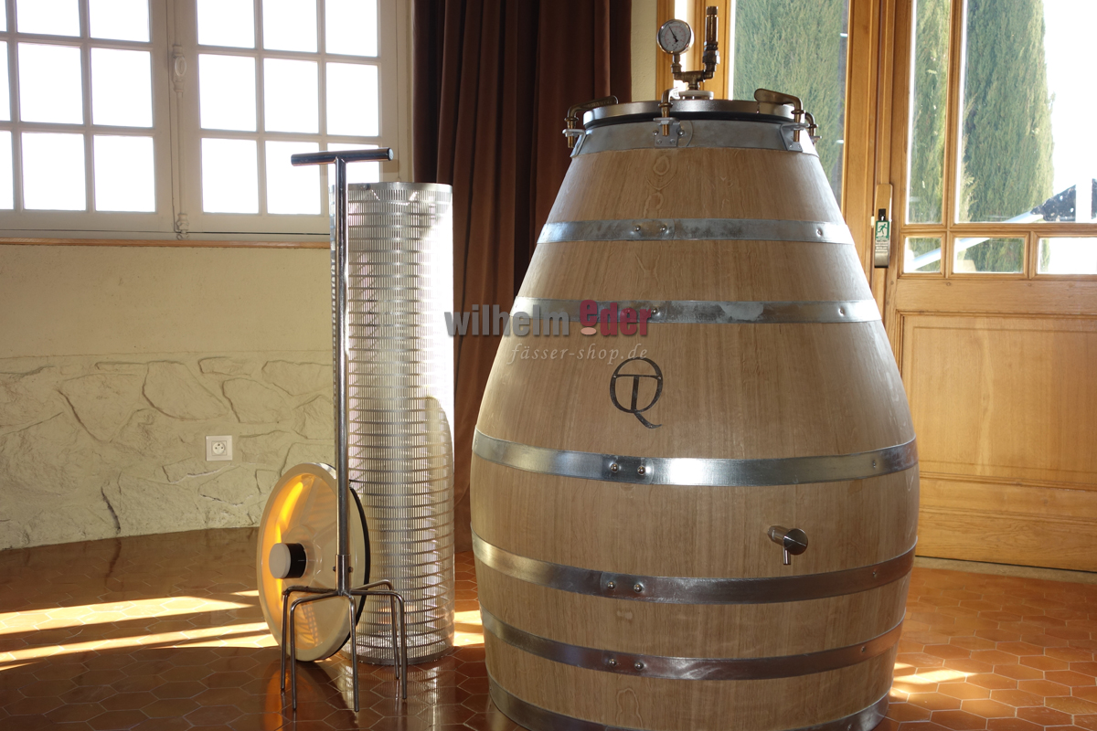 Un couvercle facilement amovible et hermétique élimine toute intervention technique sur la barrique avant, pendant ou après la fermentation. La forme en goutte d'eau garantit que le marc se retrouve sur la partie haute, la plus conique et la plus étroite de la barrique. Lors des remontages, le moût en fermentation traverse un volume plus important de marc, ce qui favorise les échanges marc/jus.