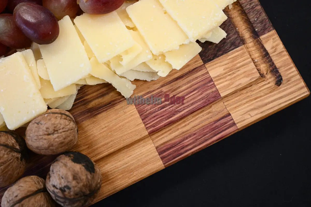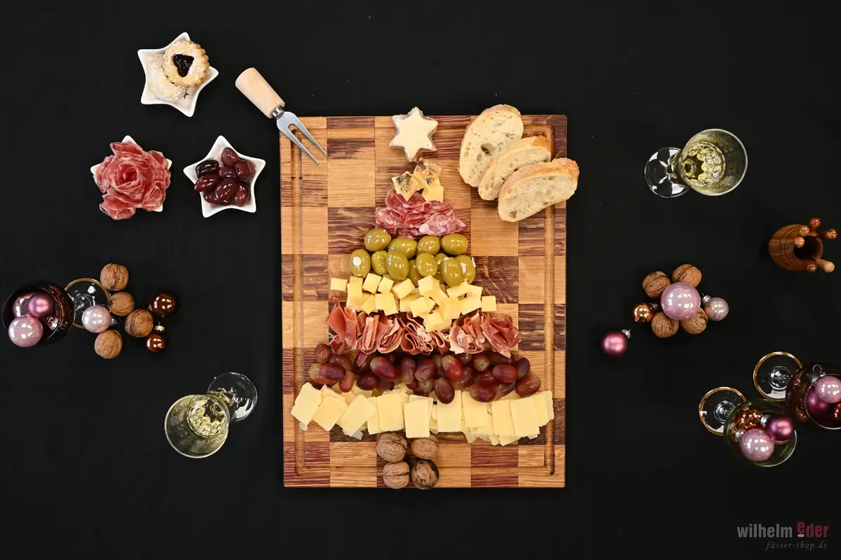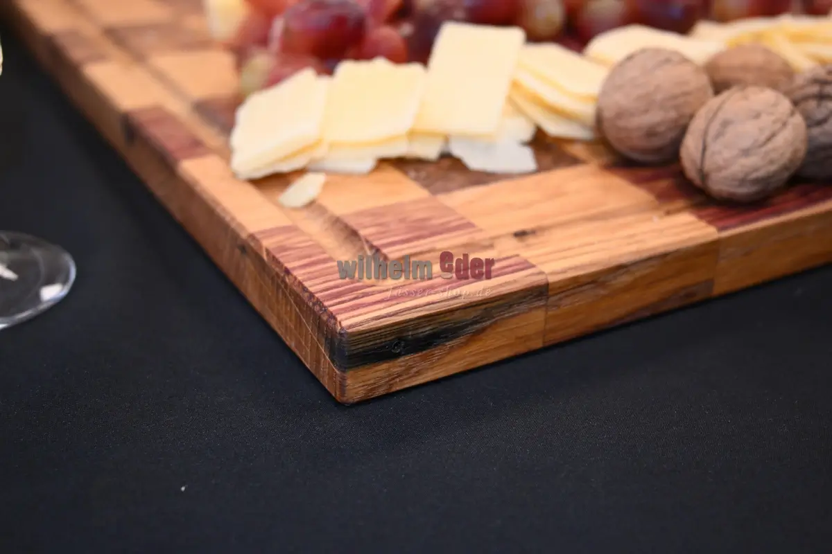 La planche à découper en damier, fabriquée à partir de douves de fûts de vin rouge usagés, est une déclaration élégante en faveur d'un habitat respectueux de l'environnement. Le motif intemporel et la patine naturelle due au stockage du vin confèrent à chaque planche un caractère individuel. Un artisanat précis et des douves soigneusement sélectionnées créent non seulement une surface esthétique, mais aussi une surface de coupe qui protège les couteaux. La gouttière à jus veille à ce que vos aliments à couper et le plan de travail restent propres.