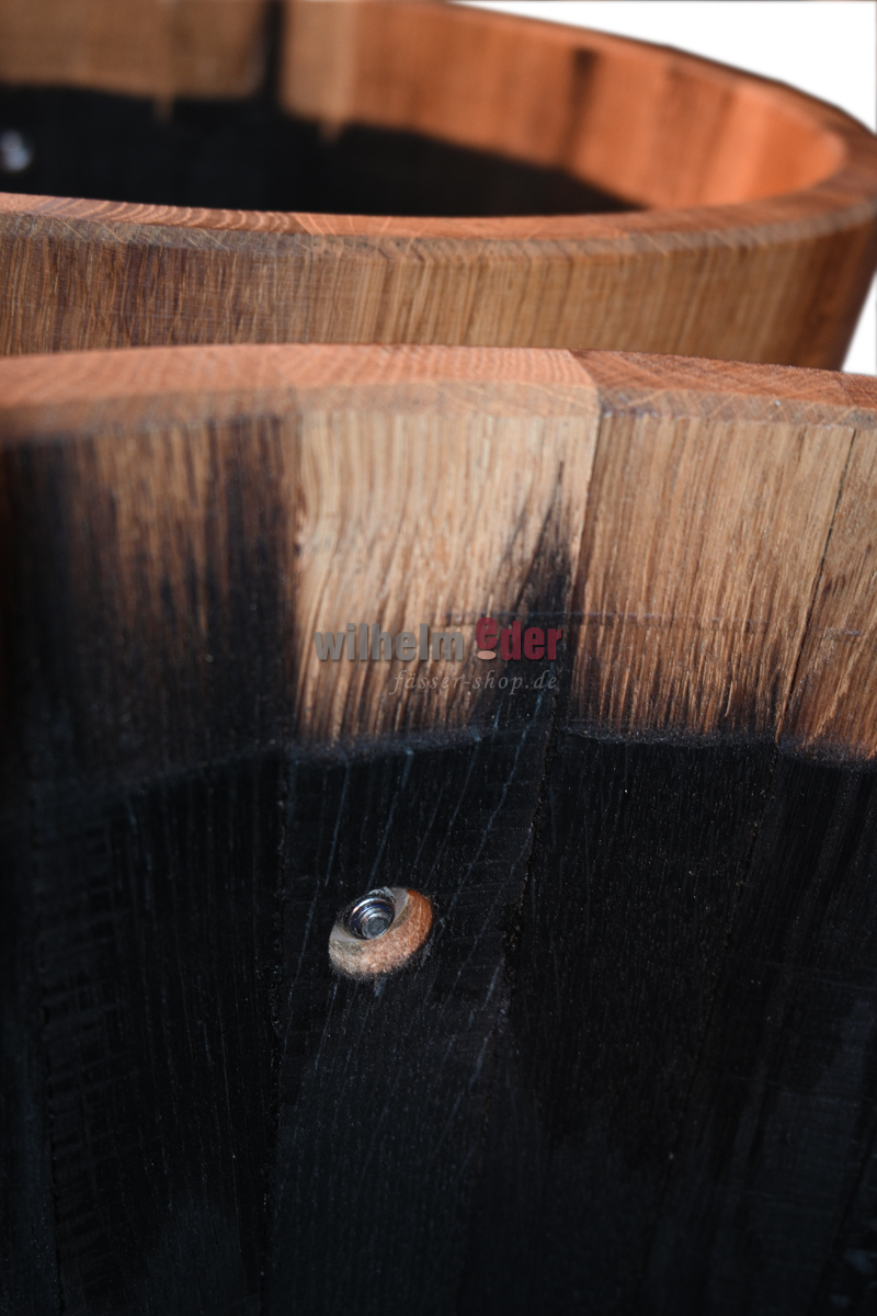 Les douelles sont redressées selon la tradition de la tonnellerie, transformées en bac et collées en plus. L'intérieur des cuves est entièrement tapissé de bois de chauffage. Cela constitue une protection supplémentaire contre le pourrissement. À l'extérieur, le traitement à l'huile de lin leur donne un éclat mat et soyeux.