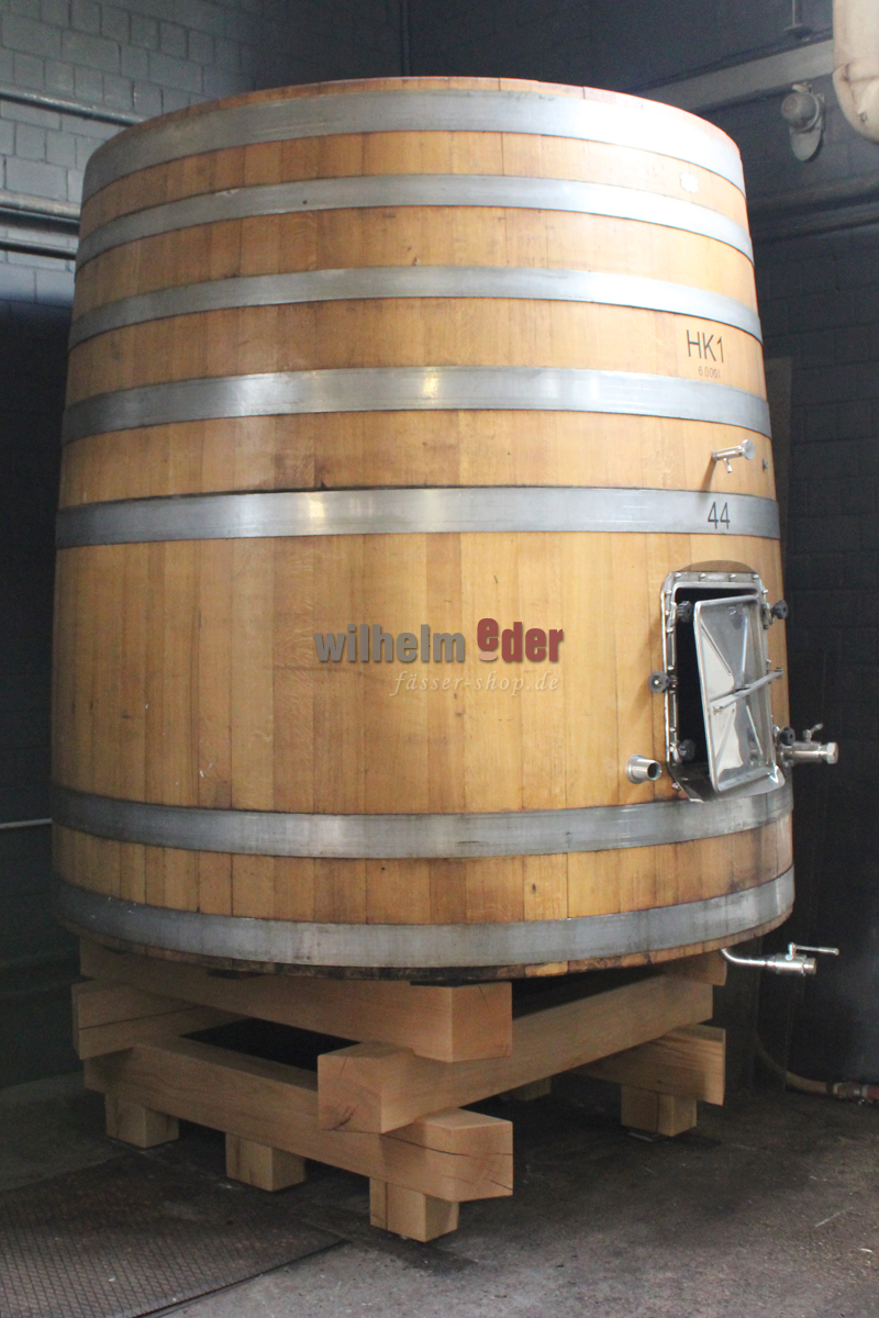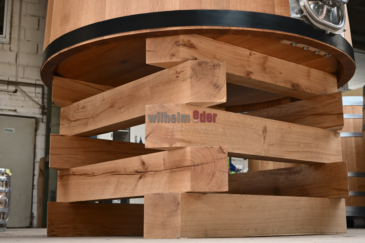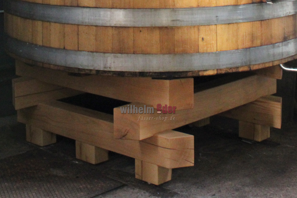 Stockage en fûts de bois de chêne séché à l'air de notre propre coupe pour un stand de fermentation d'environ 6000 l. Les dimensions sont adaptées à la cuve et peuvent donc varier.