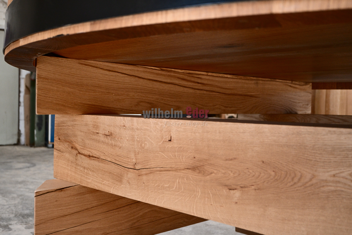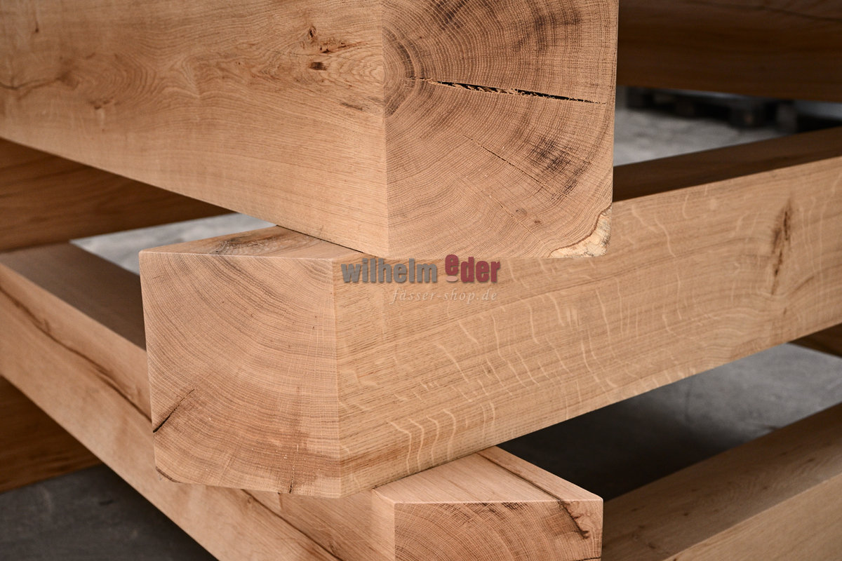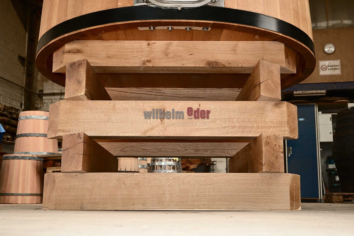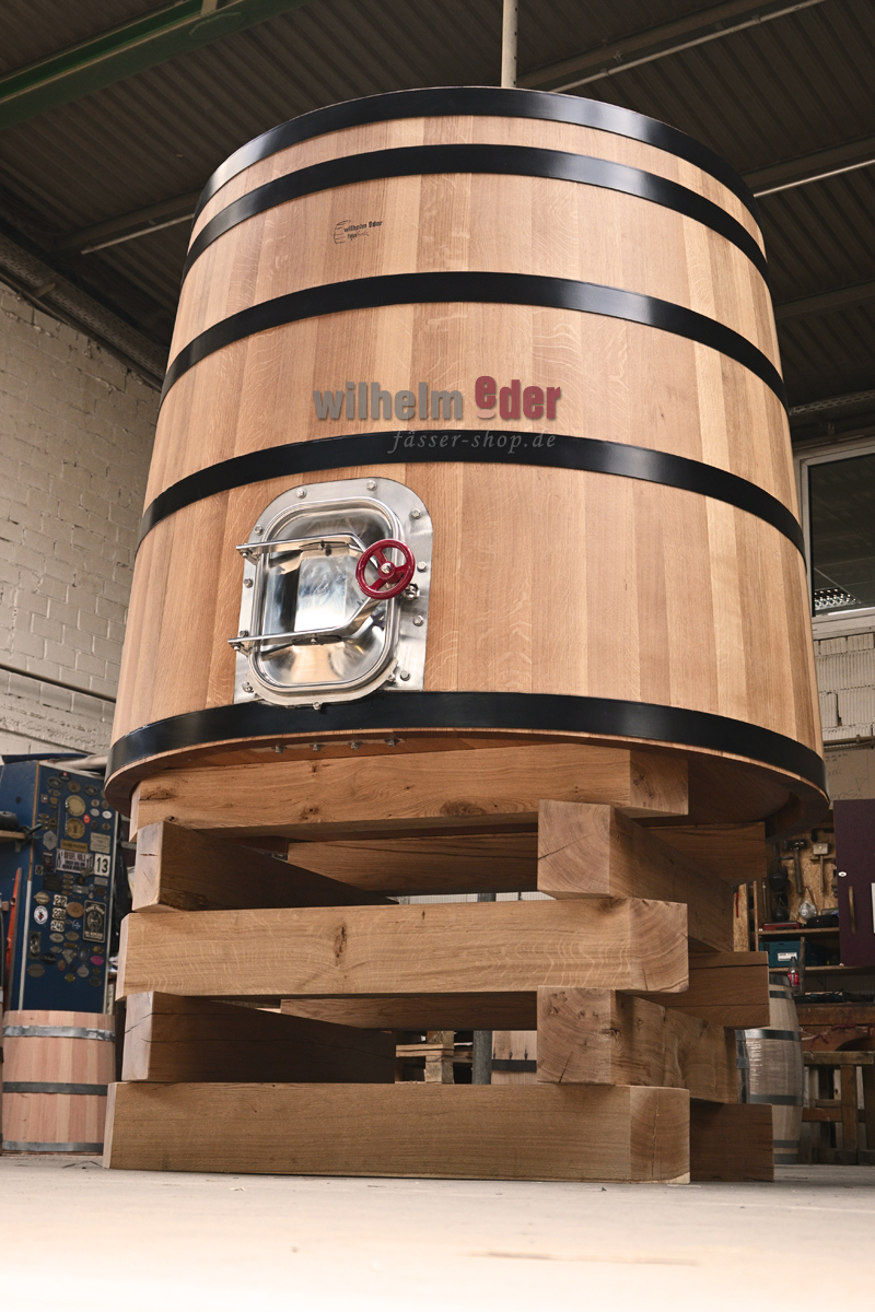 Stockage en fûts de bois de chêne séché à l'air de notre propre coupe pour un stand de fermentation d'environ 6000 l. Les dimensions sont adaptées à la cuve et peuvent donc varier.