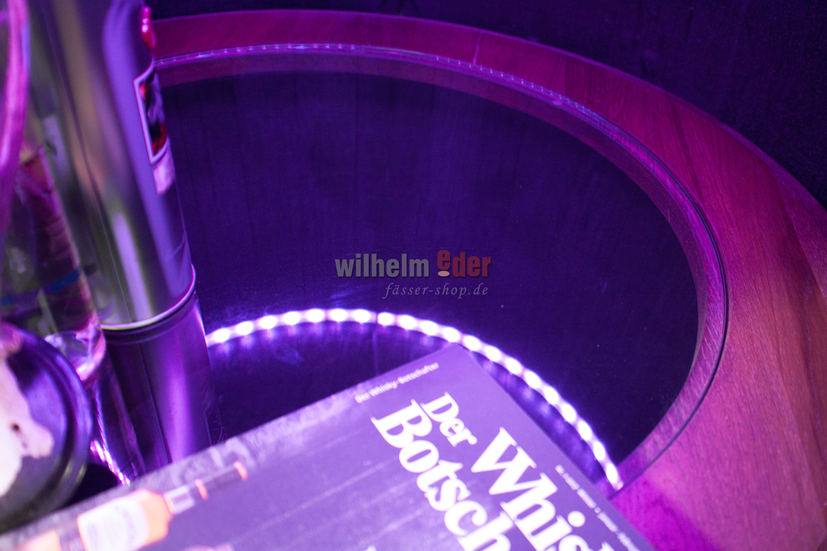 Le baril est professionnellement nettoyé, poncé, avant ouvert, avec un étagère avec un plaque de verre (env. 57 cm).