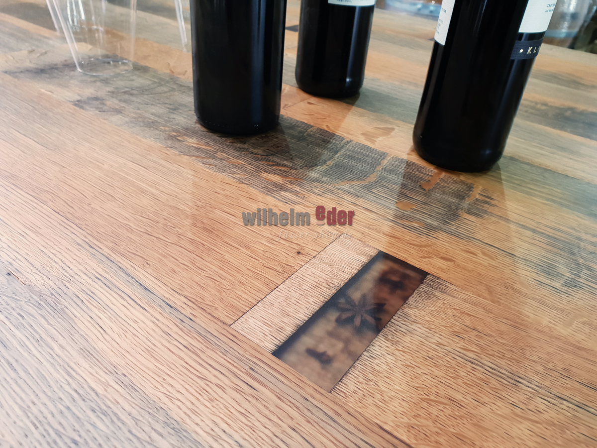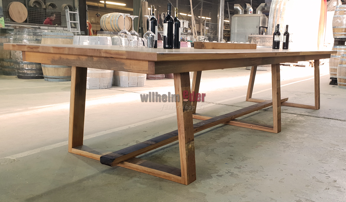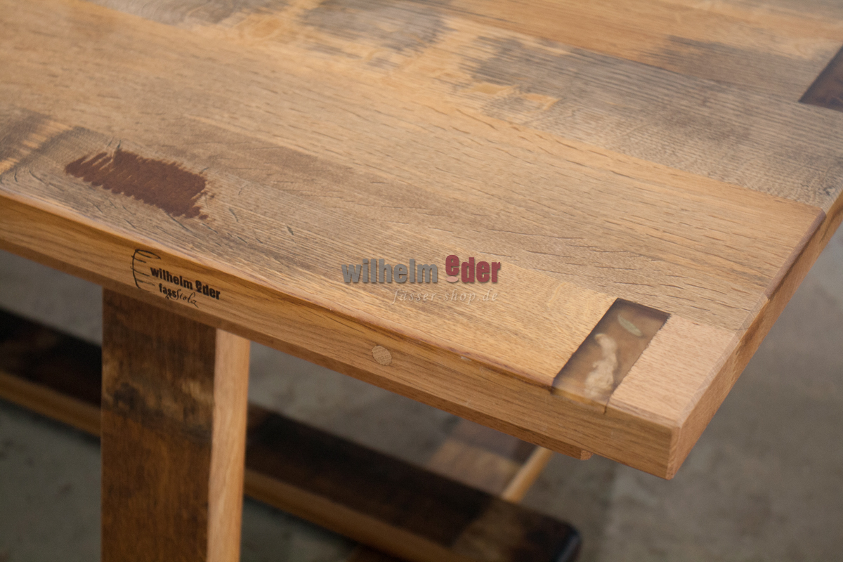 Cette table de conférence exclusive a été fabriquée à partir d'anciens grands fûts de distillat. Pour ce faire, les surfaces des tambours transversaux ont été fraisées et collées ensemble pour obtenir la longueur désirée. Les rainures originales dans lesquelles la tête et le fond ont été travaillés ont été conservées et recouvertes de matières premières du client et coulées avec de la résine.