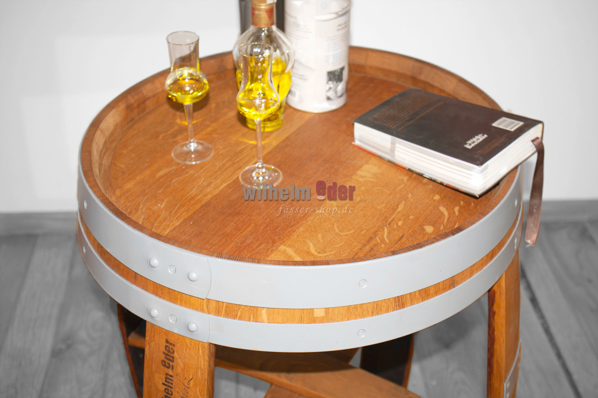 Quatre douelles ont été utilisé comme pieds de la table et les autres douelles ont été enlevé au 3ième cercle. La stabilité de la table est renforcée par une croix de deux douelles. Les cercles sont laqués en noir et les bords ont été rectifies.