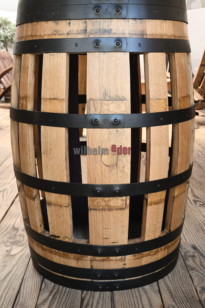 Une barrique originale de 225 l a été démontée par nos menuisiers et une douelle sur deux a été retirée. Toute la table laisse désormais passer la lumière, ce qui produit des jeux de lumière intéressants, surtout au crépuscule. De plus, on peut admirer et apprécier la coloration du vin à l'intérieur du tonneau.