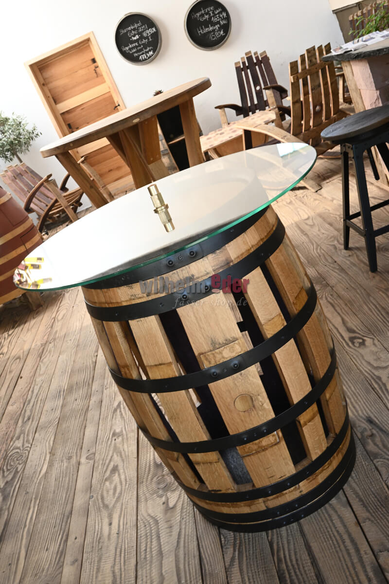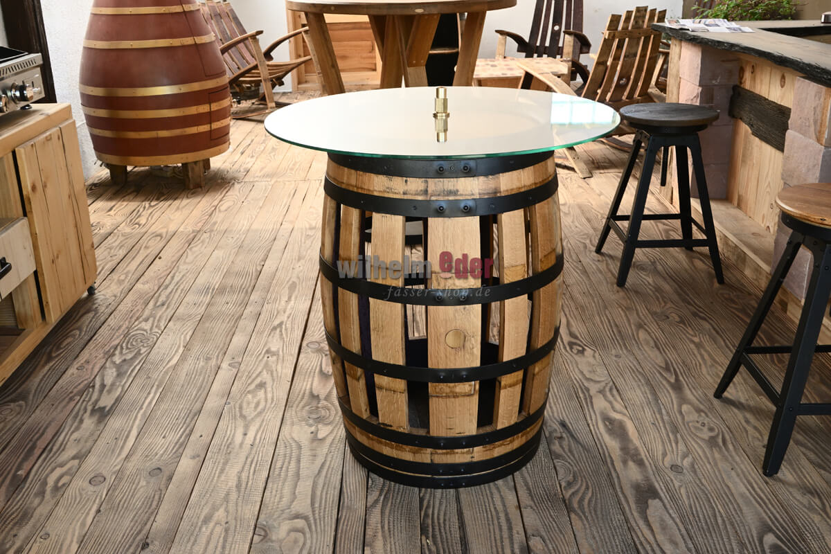 Le tonneau est disponible avec ou sans plateau en verre. Le plateau de table en verre de sécurité sécurisé (le verre est protégé contre les éclats) a été monté sur le couvercle du tonneau à l'aide d'une vis à tonneau en acier inoxydable avec écrou en laiton.