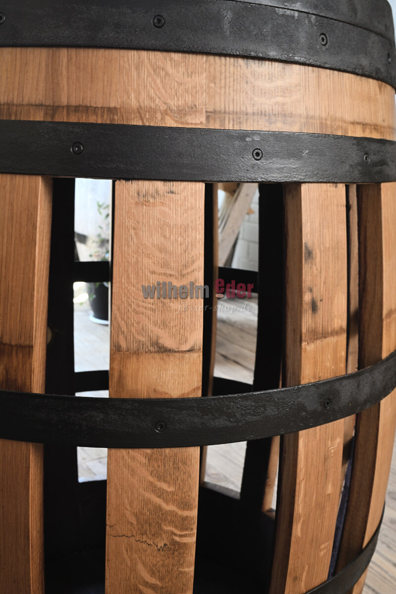 Avant de fabriquer des tables en tonneau, nous laissons sécher les tonneaux et collons les douves une à une. Ce processus complexe garantit la stabilité de la table et empêche le bois de se déformer en raison des variations de température. Veuillez néanmoins noter que l'air de chauffage trop sec et trop chaud n'est pas favorable au fût. Nous attachons une grande importance à l'authenticité de ce produit. Cela signifie qu'un tonneau/une table de ce type a été stocké(e) et déplacé(e) pendant des années dans les "entrepôts" des différentes distilleries/caves à vin. Les entailles dans le bois ou, dans certaines circonstances, un fond inégal ne sont pas des défauts de qualité, mais plutôt déterminés par la particularité de la construction et l'utilisation antérieure des fûts. Des différences de couleur sont possibles.
