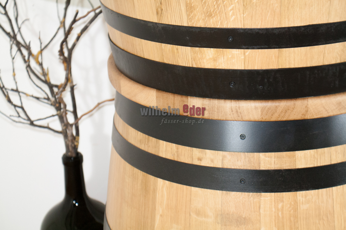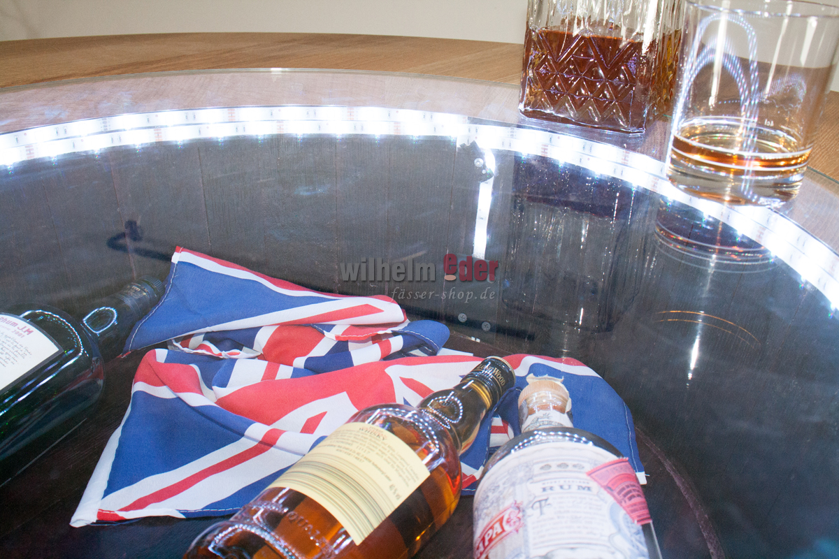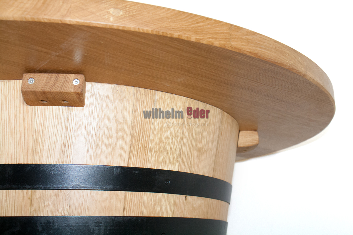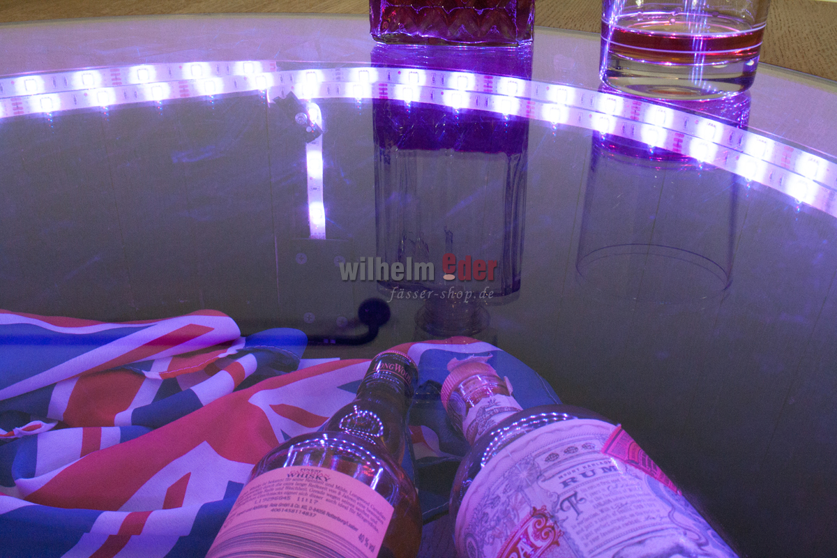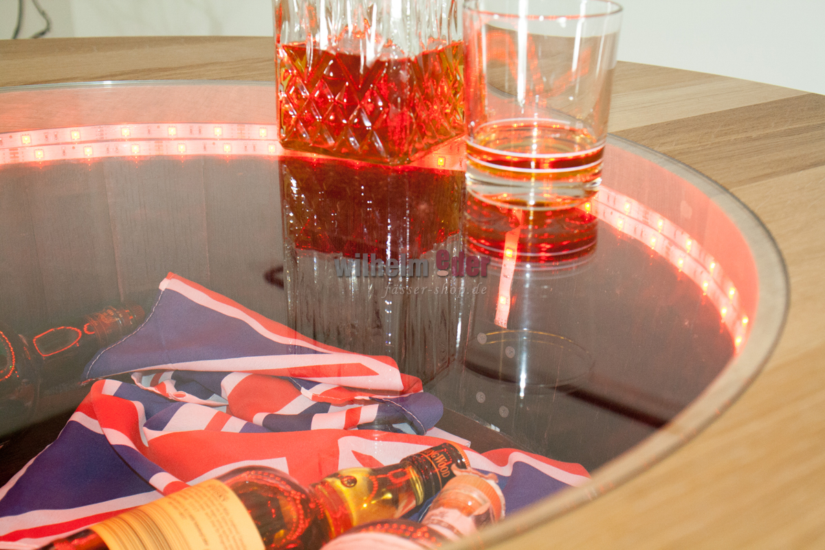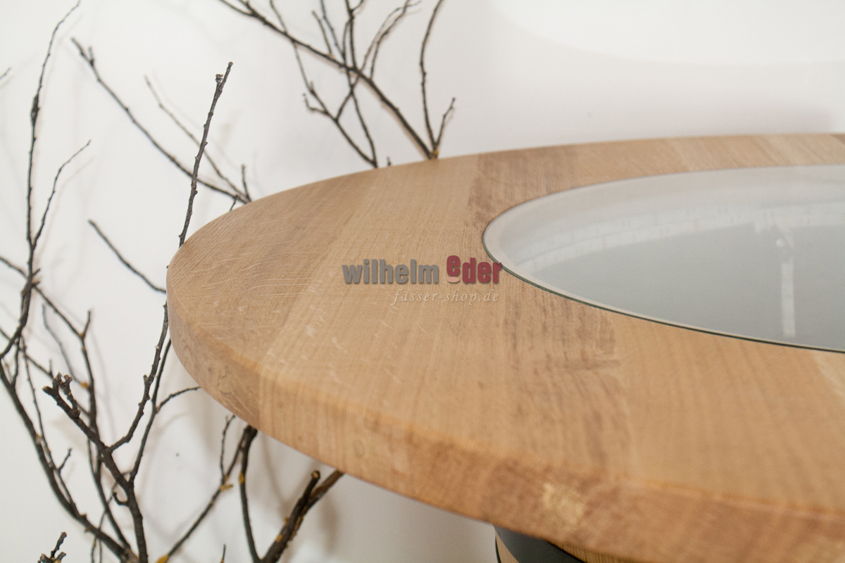 Cette table haute extravagant est fabriquée d'une barrique de 225 l d'occasion et d'un quart d'une barrique placé par-dessus. La barrique est poncée et laquée avec un vernis transparent. Les cercles galvanisés sont peint en noir. Une plaque de verre est encastrée dans le plateau rond de bois de chêne. C'est fabrication permet d'utiliser la partie supérieure comme vitrine. Avec la guirlande LED avec une télécommande pour le choix de couleurs la barrique se transforme en point culminant.