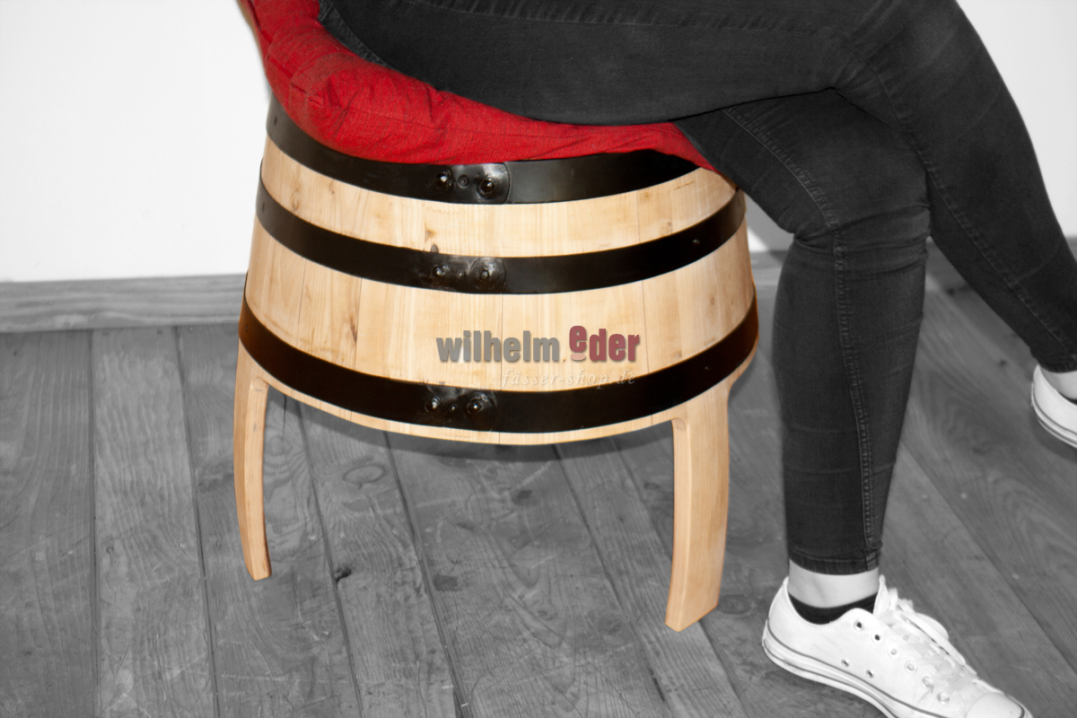 Le tabouret a été fabriqué d’un fût de 100 l en bois châtaigner en aspect bois de chêne. Comme le pendant – la table fabriqué d’un fût – les douelles ont été découpé au 3ième cercle. Trois douelles sont utilisées comme pieds du tabouret. Les cercles sont laqués en noir et les bords ont été rectifies.